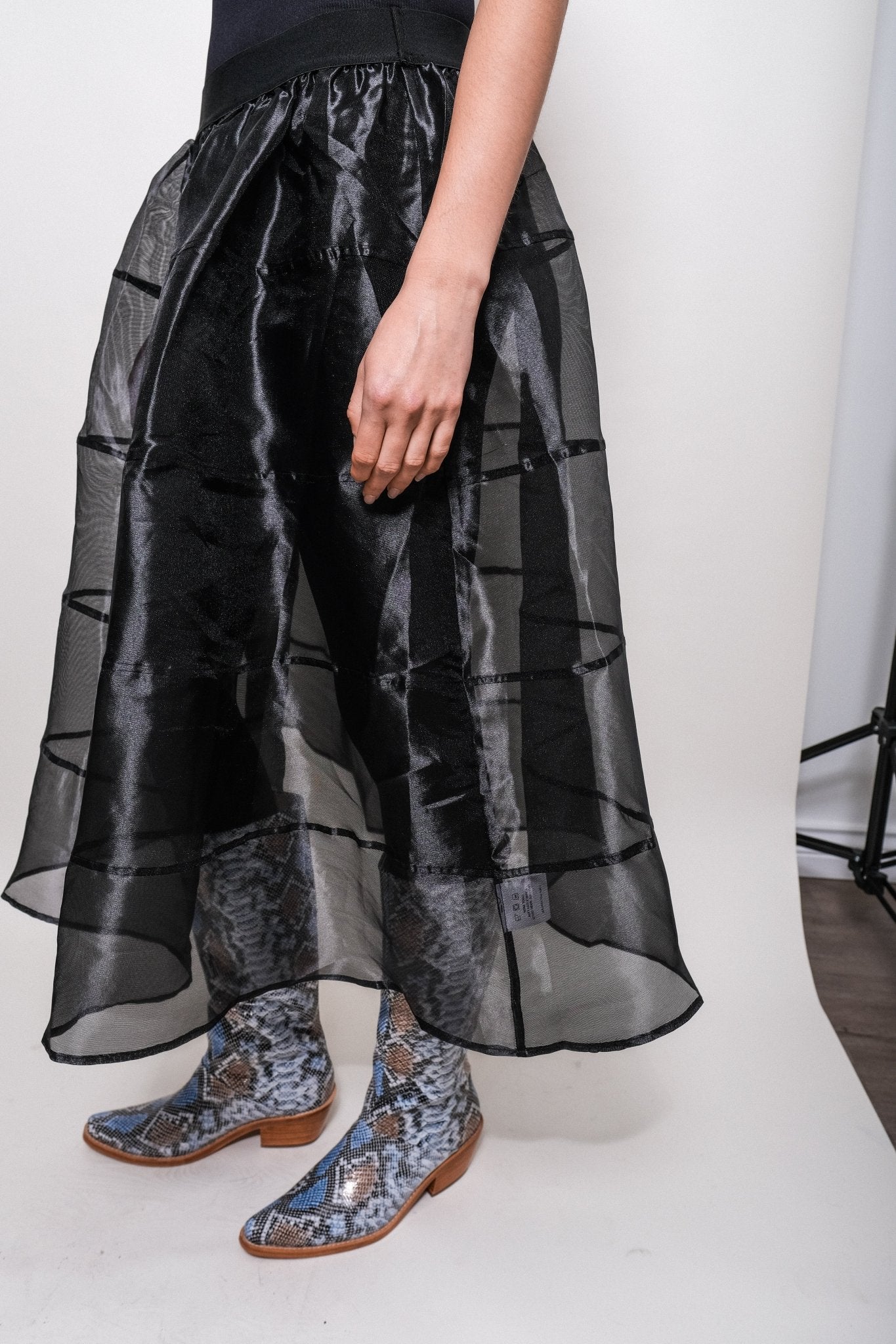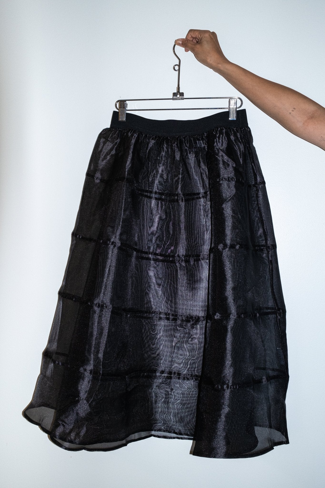 Midi length organza sheer skirt. Elastic waistband, tiered stitching. Billowing easy-fit silhouette. Made from 100% Polyester. Please note this skirt does not come with a slip.
