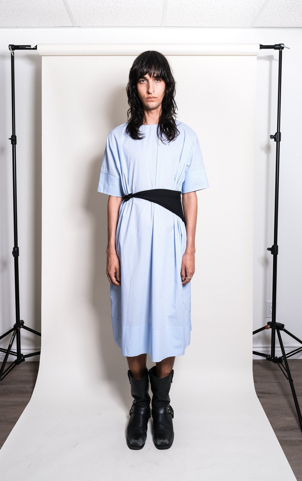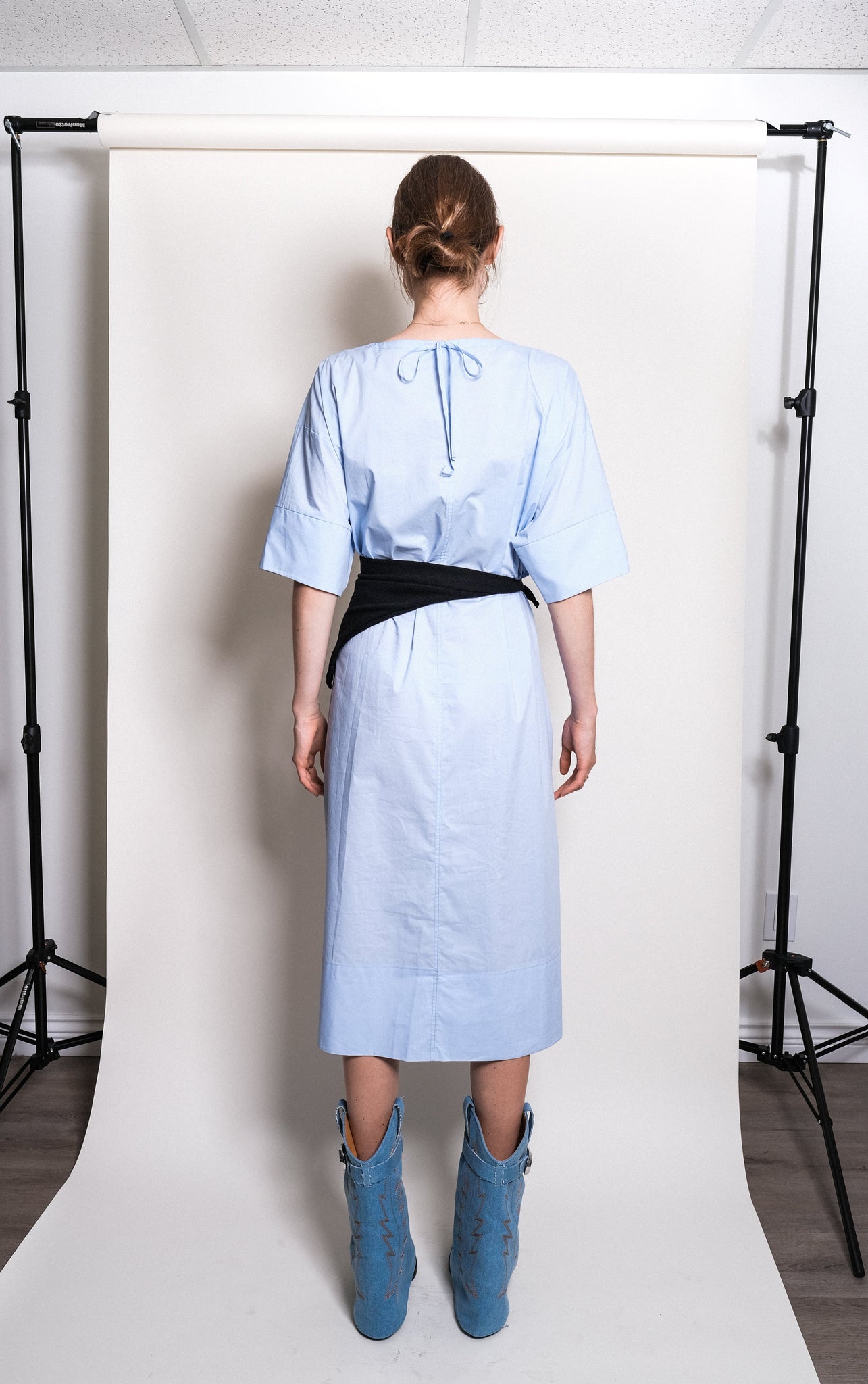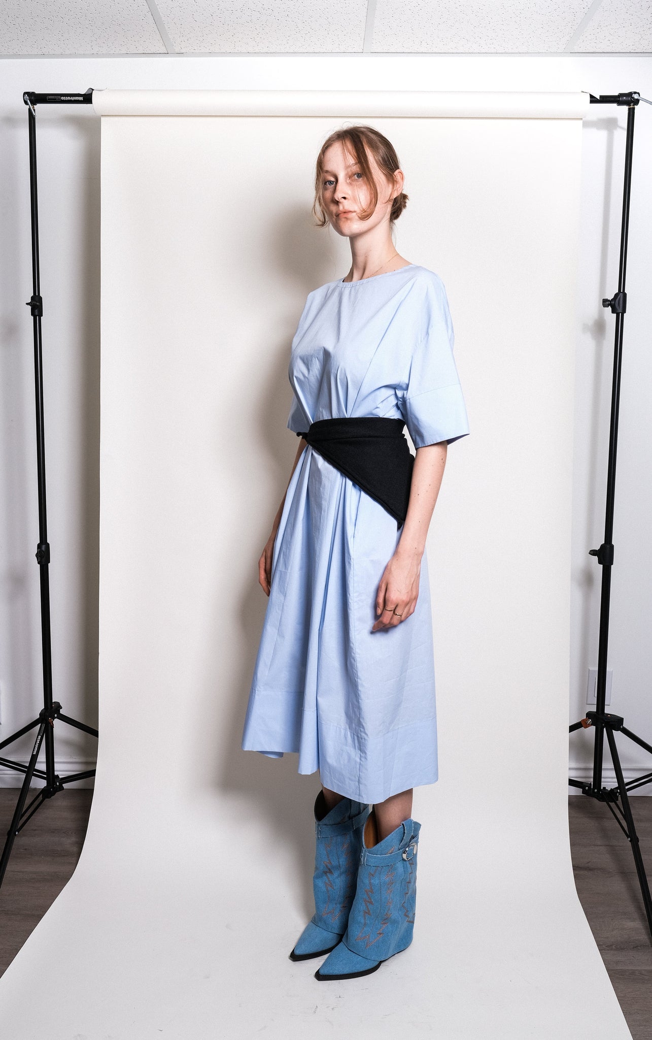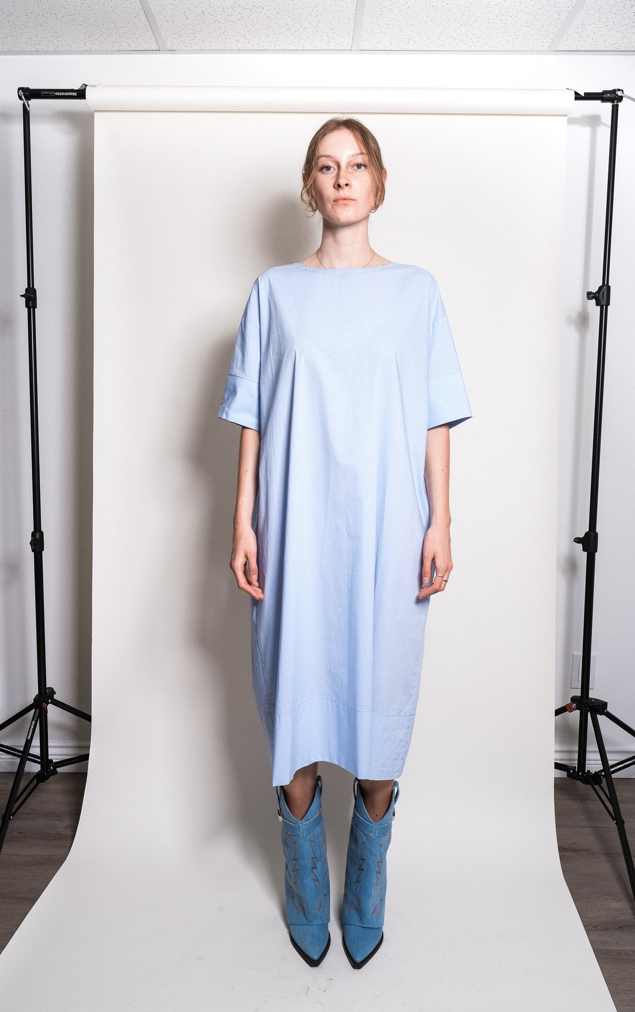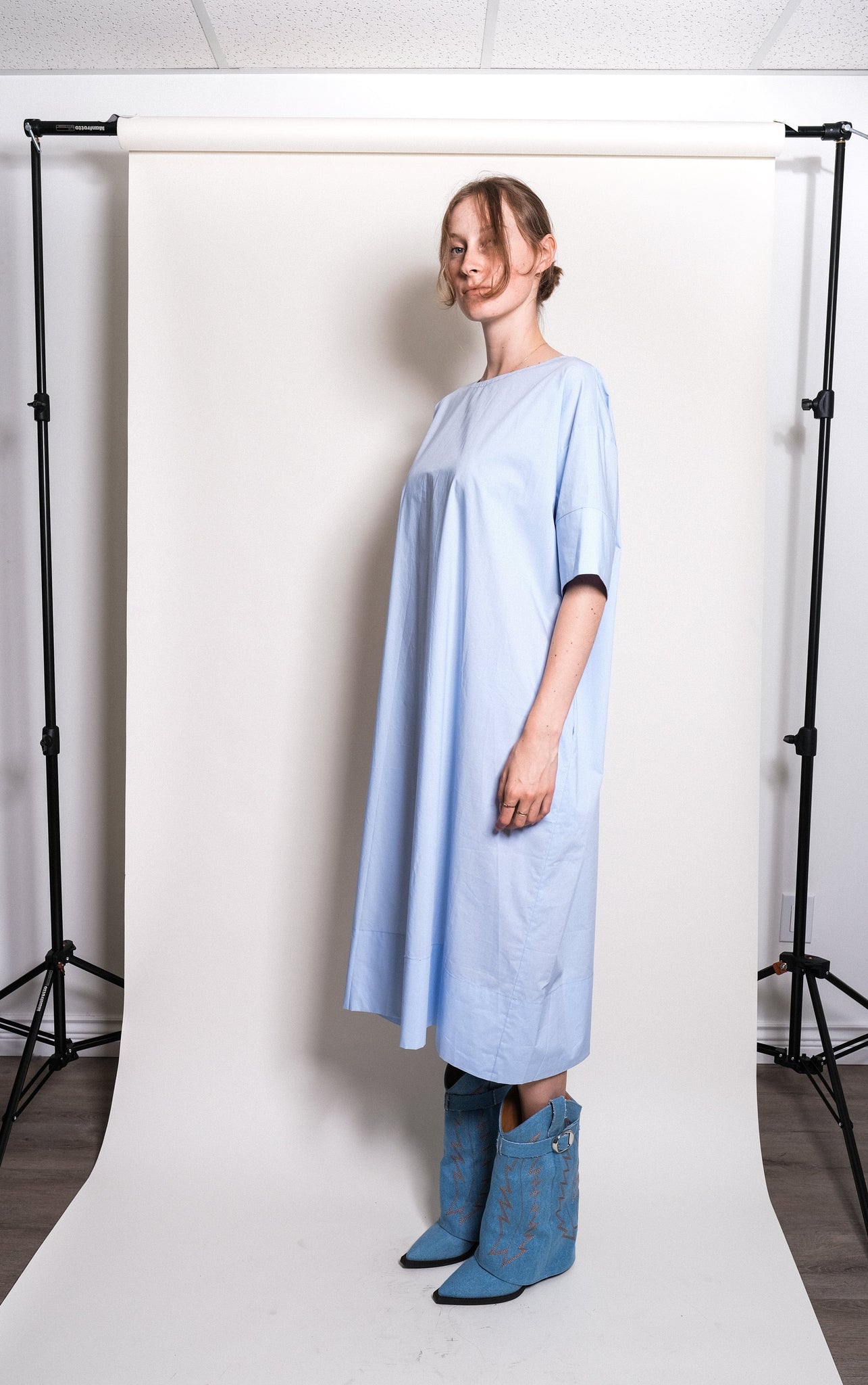Effortlessly refined and endlessly wearable — The Renzo Cotton Dress in light blue is a study in simplicity and structure. Crafted from 100% crisp cotton, this light-blue dress features a relaxed, oversized silhouette with drop shoulders and wide sleeves for ease and movement. The subtle pleating at the waist creates gentle volume through the skirt, making it both comfortable and flattering. Tie at the back of neck.