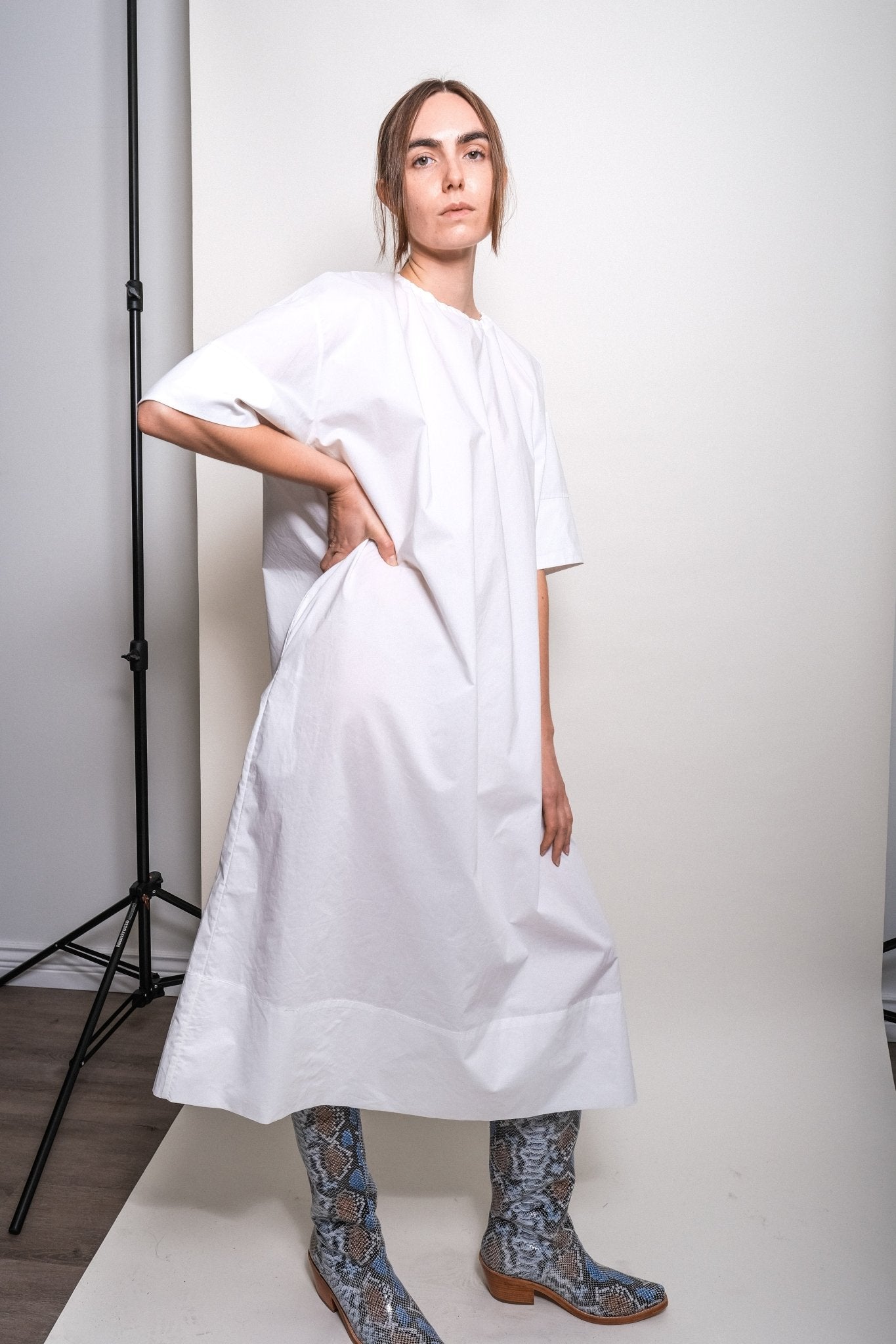 Effortlessly refined and endlessly wearable — The Renzo Cotton Dress in white is a study in simplicity and structure. Crafted from 100% crisp cotton, this white dress features a relaxed, oversized silhouette with drop shoulders and wide sleeves for ease and movement. Tie at the back of neck.