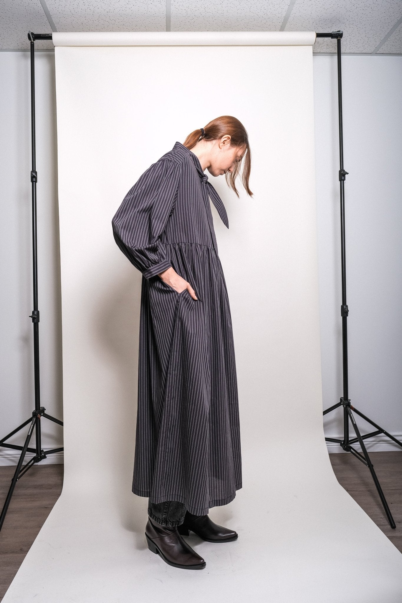 Designed for comfort and versatility, the dress drapes beautifully over the body and can be styled loose or cinched with a belt for added shape. Voluminous sleeves with a slight puff and buttoned cuffs complete the silhouette — balancing ease with polish.