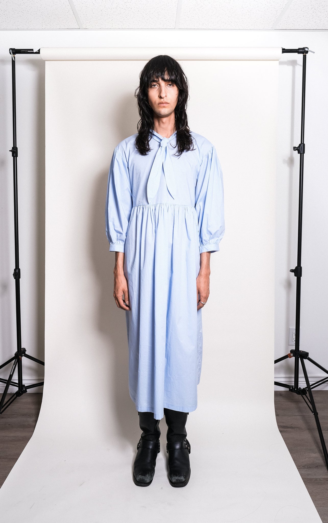 A soft statement in structure and ease — The Therise Cotton Dress brings effortless elegance to everyday dressing. Made from 100% breathable cotton, this light-blue dress features a relaxed, oversized silhouette with gentle gathers at the waist for subtle volume and movement. The tie-neck detail adds a refined, feminine touch while keeping the look modern and minimal.