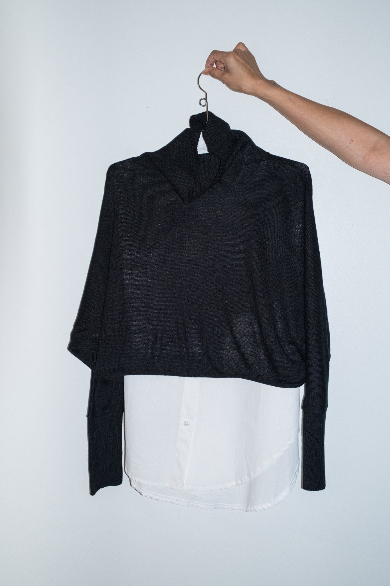 Cut to a cropped silhouette, it features a wide fold-over turtleneck, long ribbed sleeves, and dropped shoulders — a relaxed yet elevated proportion designed to layer seamlessly over dresses or pair with high-waisted trousers. Ethically produced in small batches, each piece reflects our commitment to slow, thoughtful fashion.