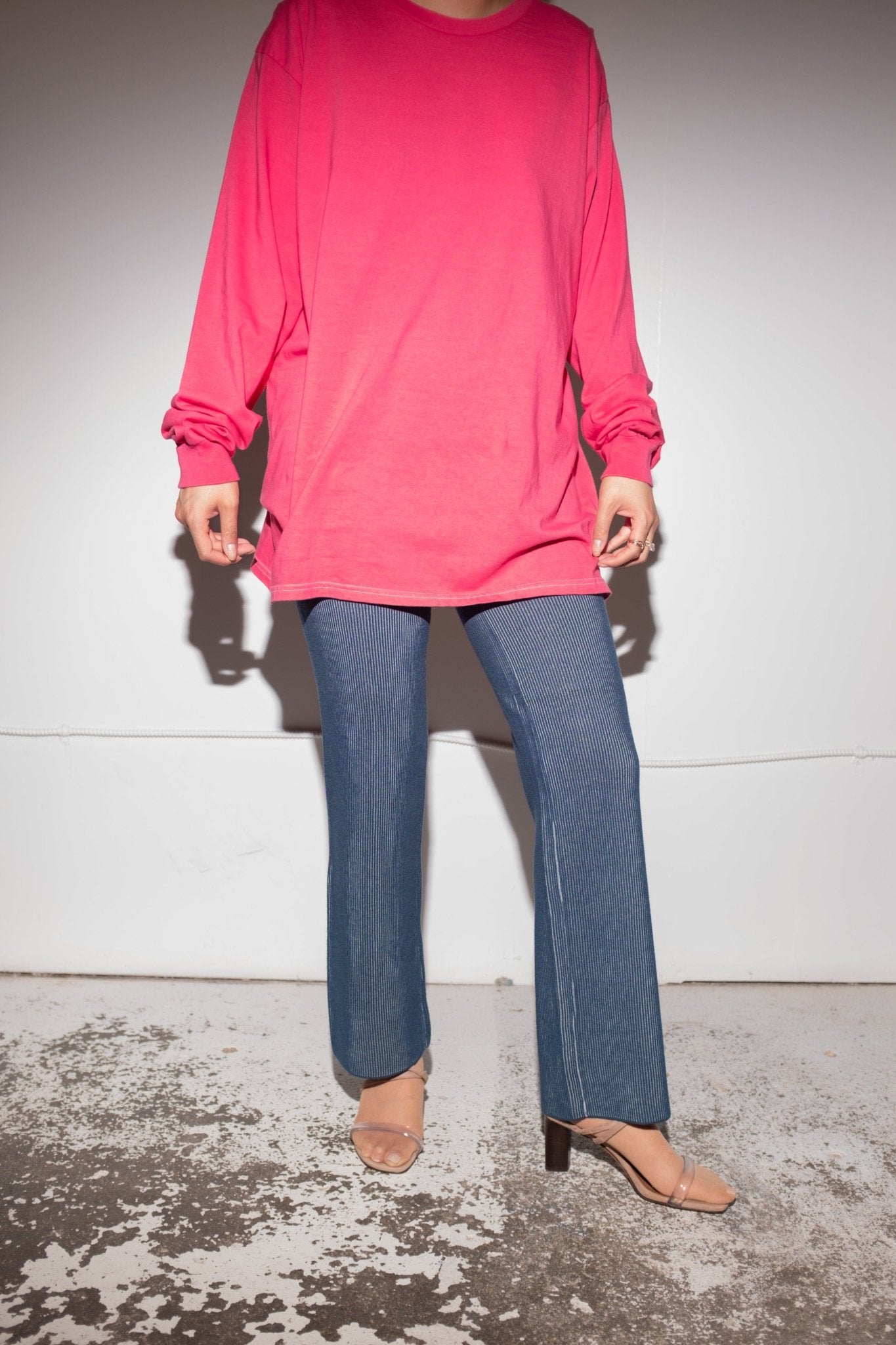 Ribbed knit relaxed pant with elastic waist. These pants have stretch. Made of 60% Viscose 40% Nylon.