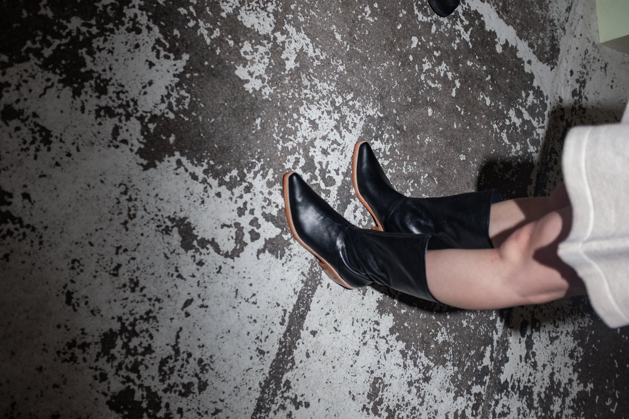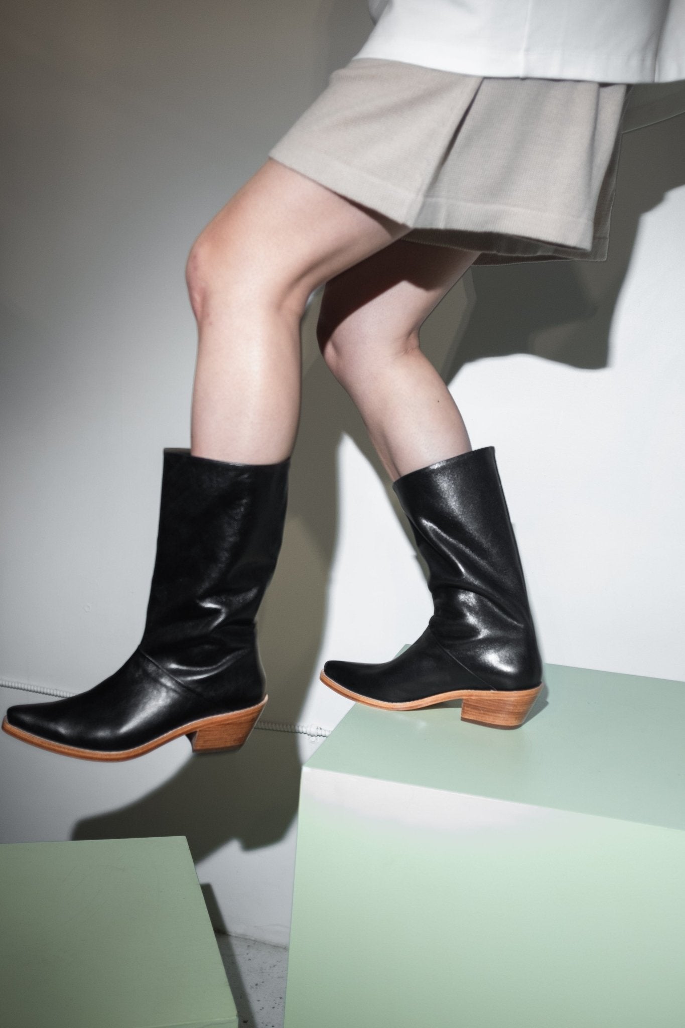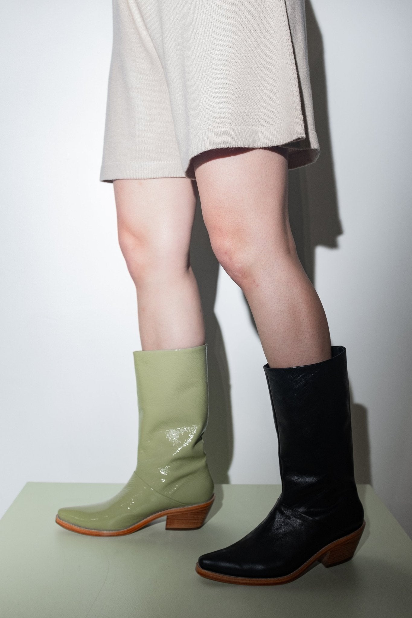 She's a Westie in Black Napa Leather. Almond toe leather boot with 1" black wooden heel. Boots fit true to size. If you are a half size, size up.