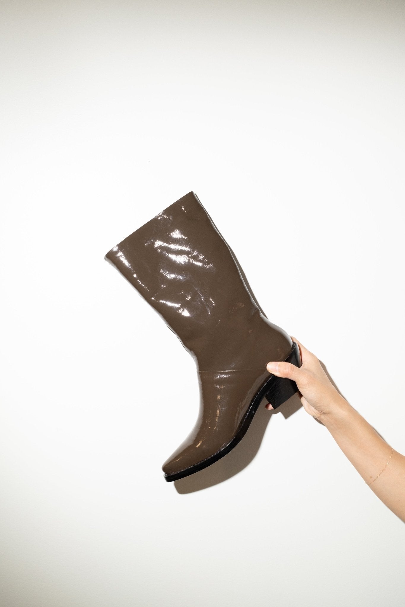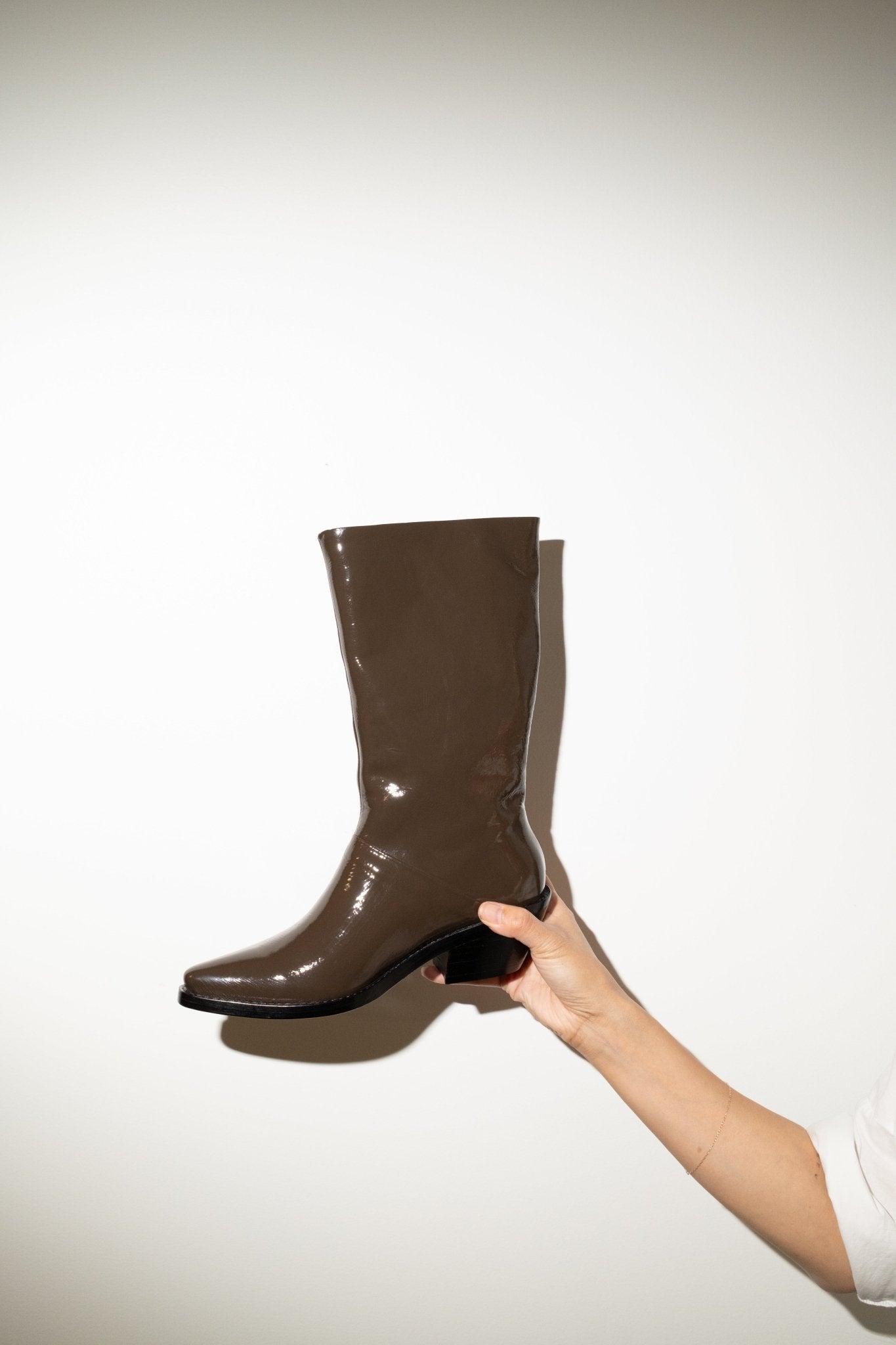 Westie Boot in a shiny deep coffee brown with gloss. This almond-toe leather boot has a 1" wooden heel (painted black). Our boots fit true to size if you are a half-size, please size up. Please note that these boots are one-of-a-kind and available in small quantities.