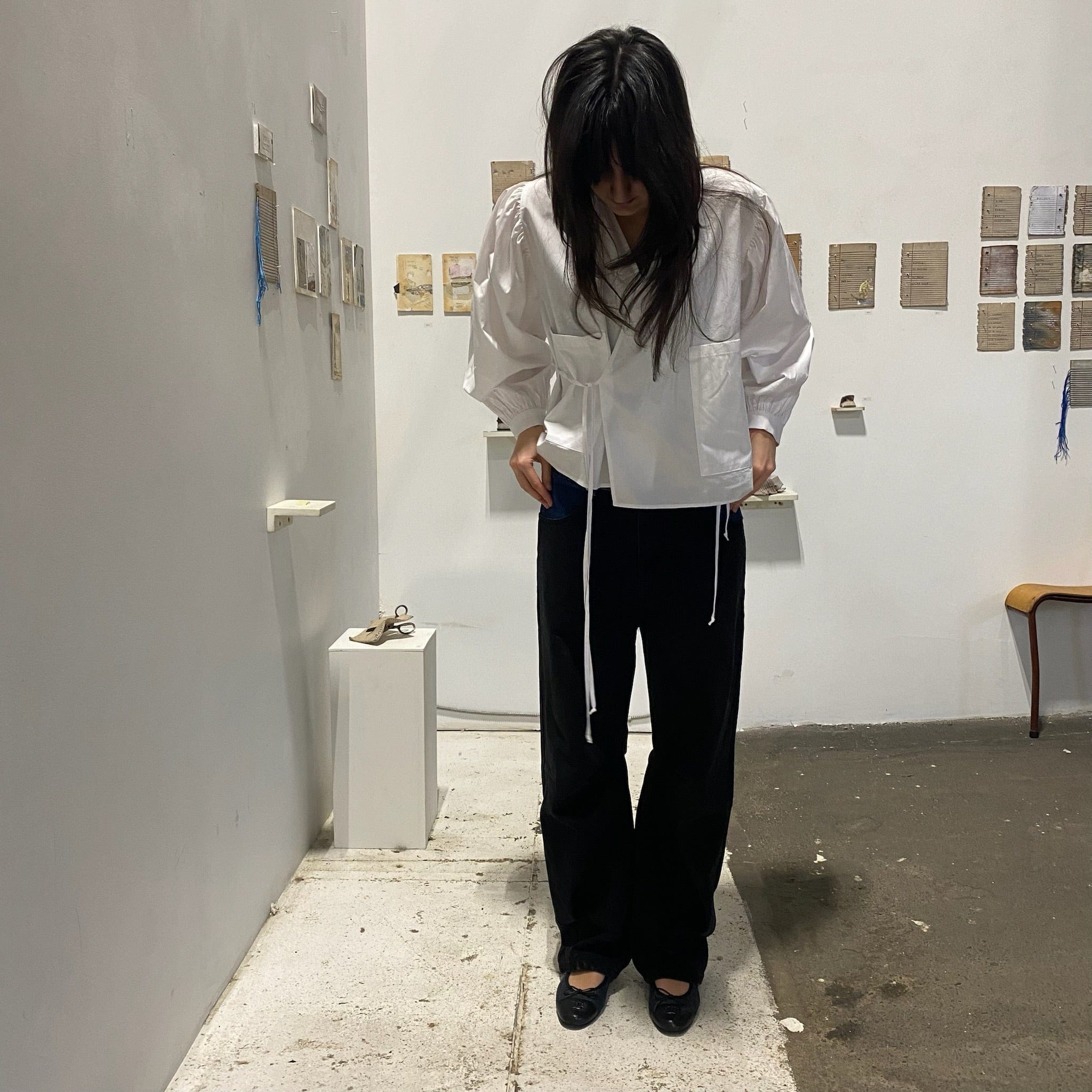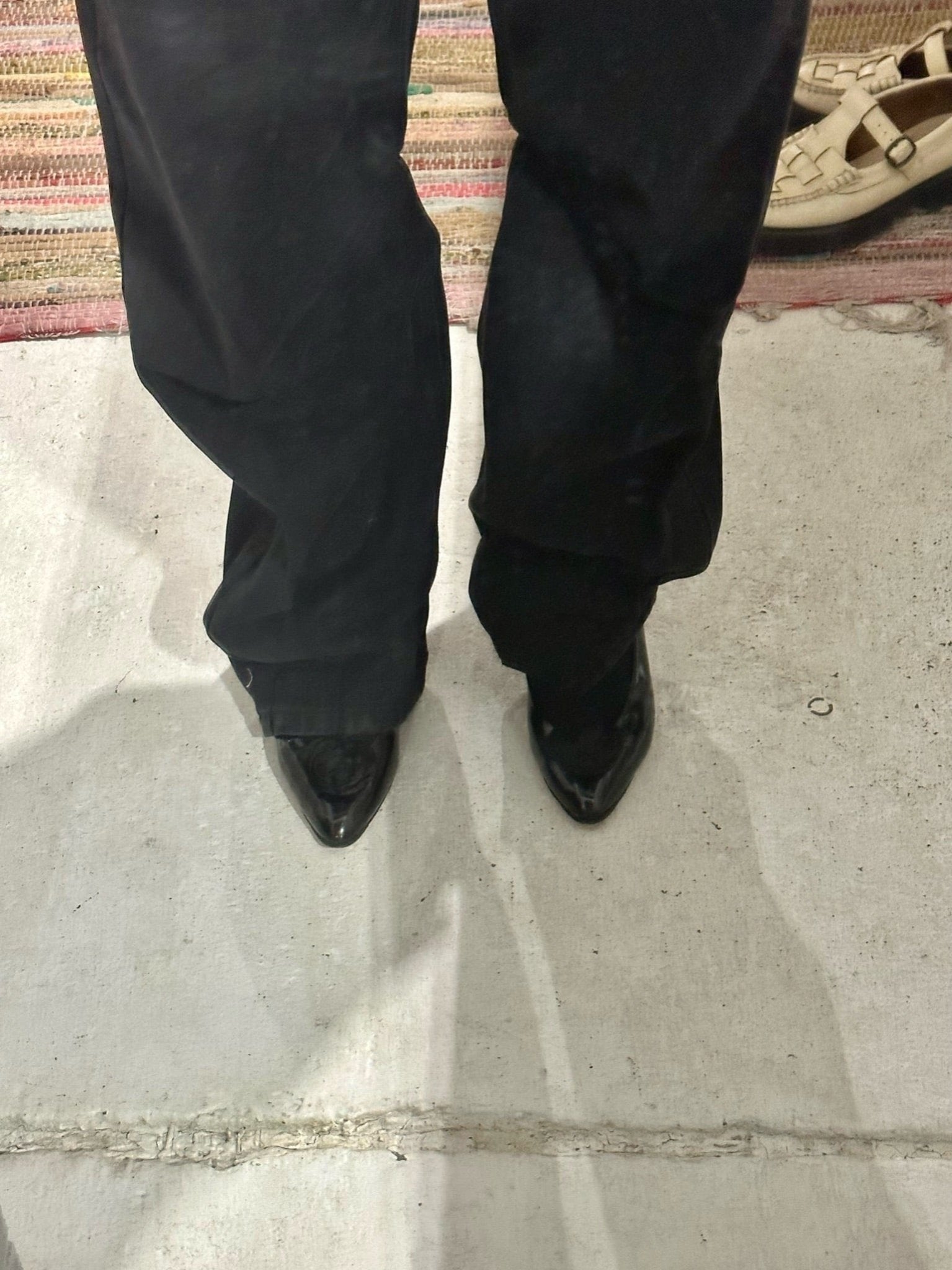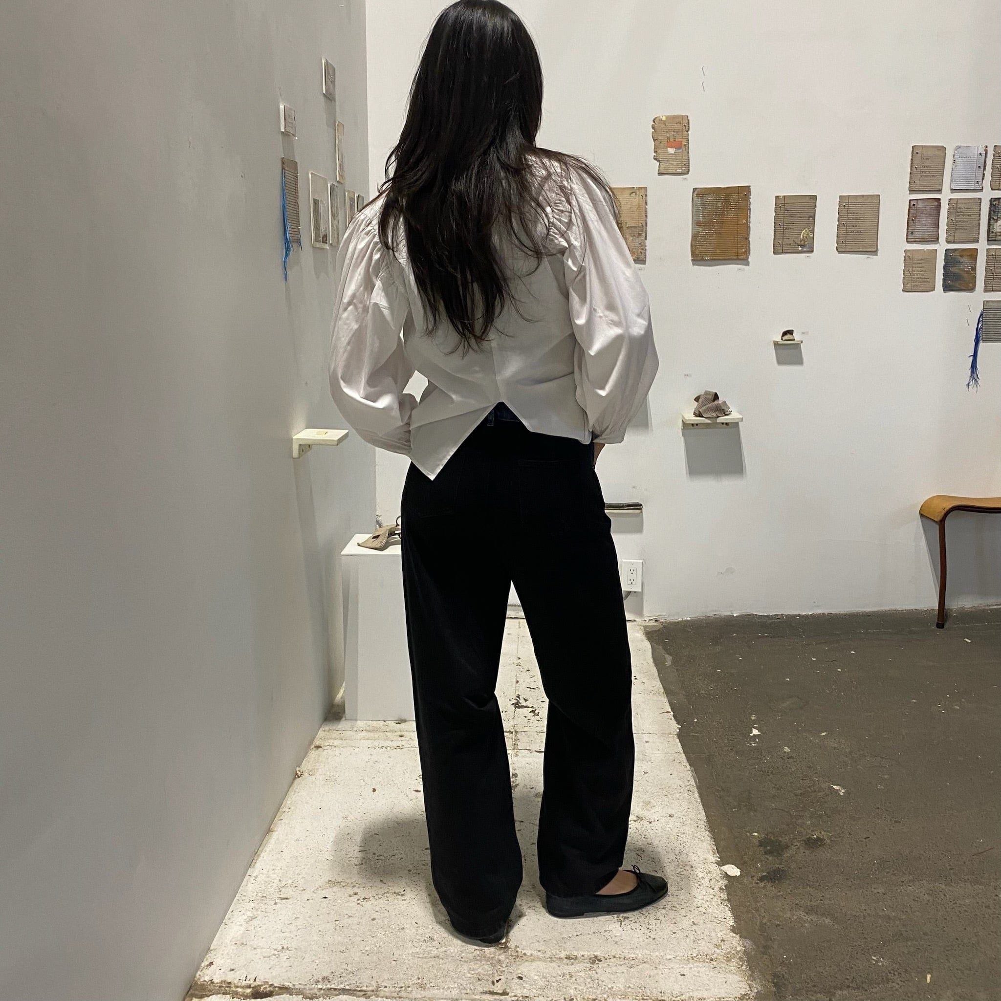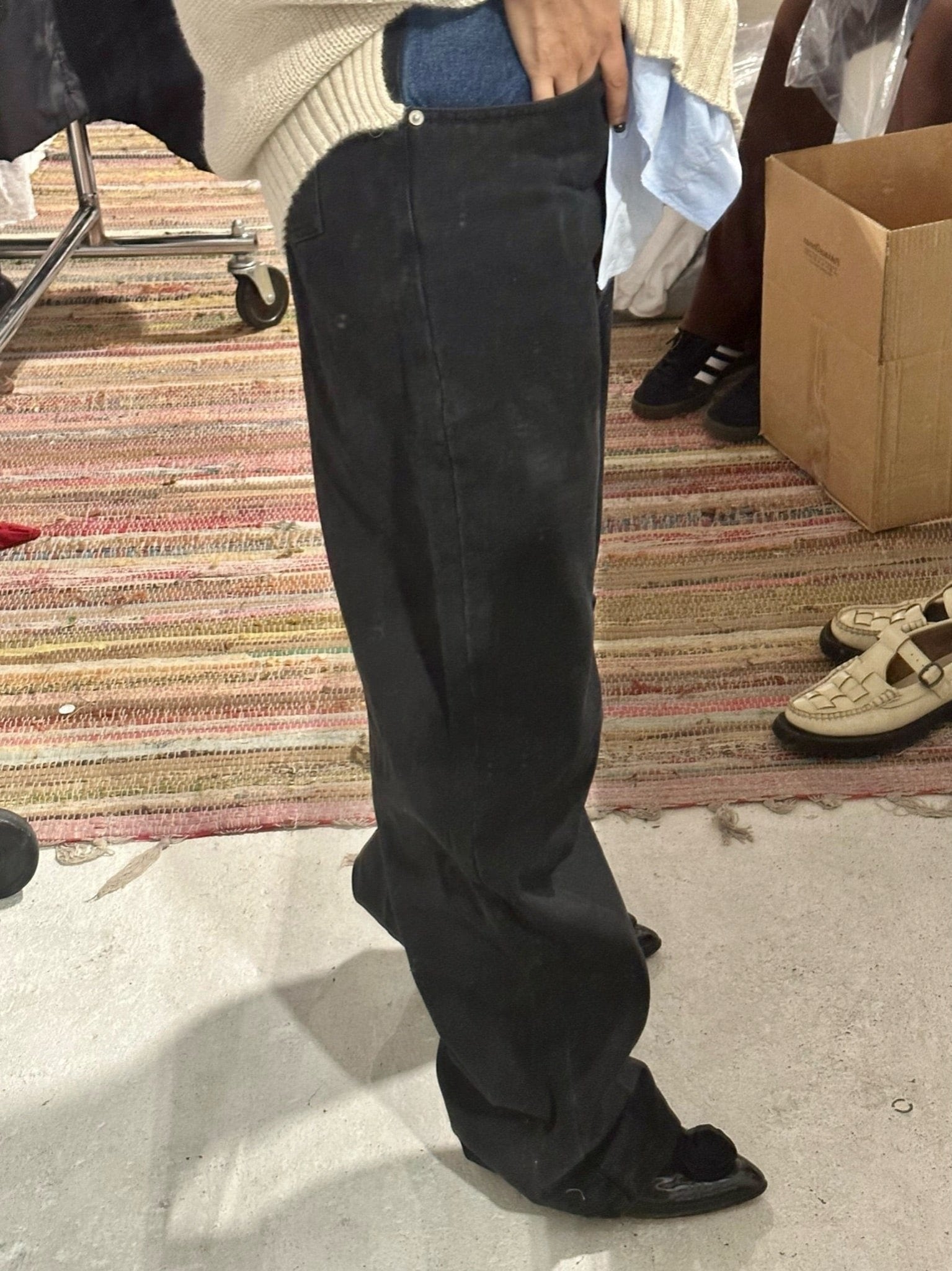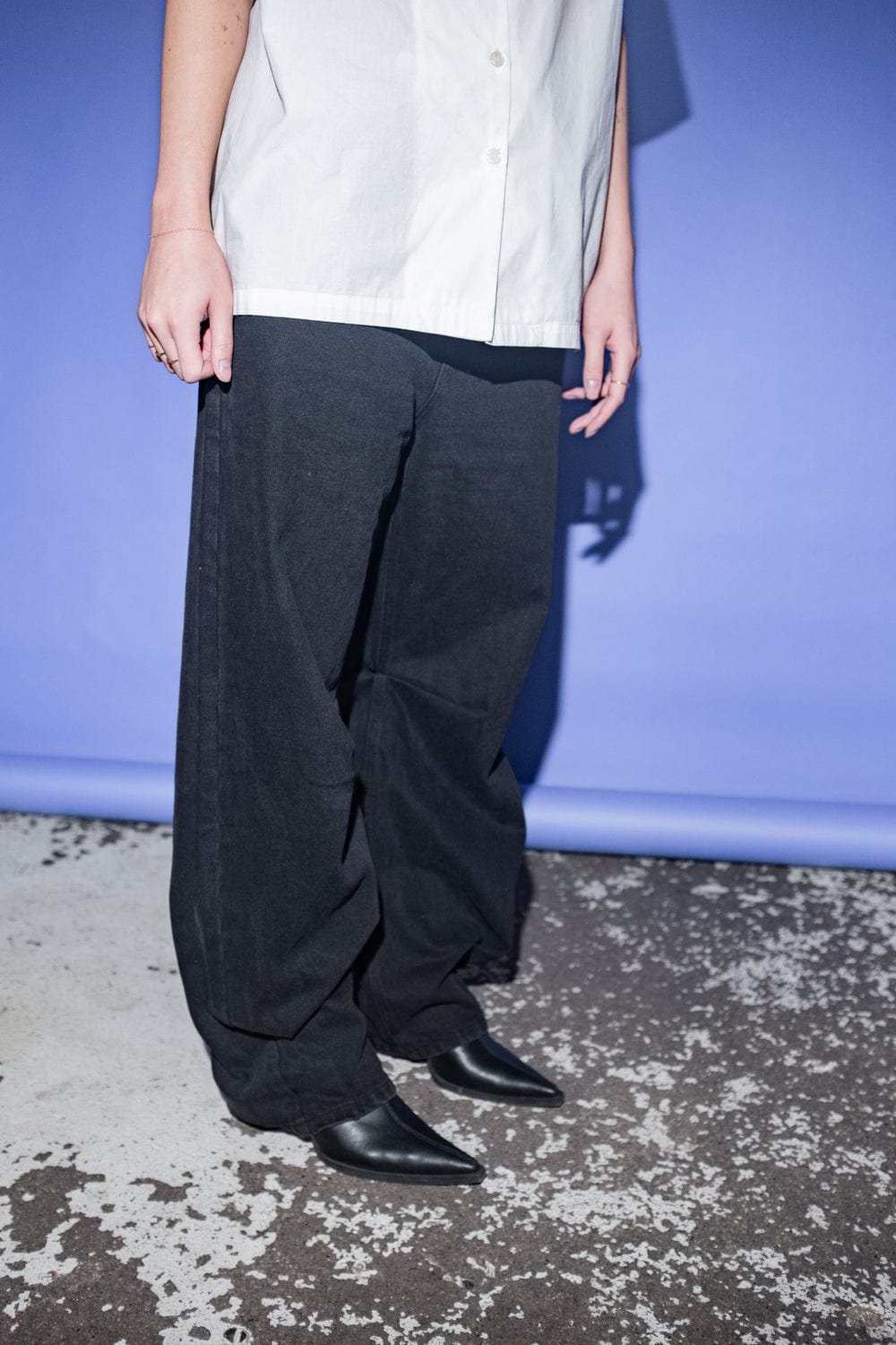 Black wide leg denim pant with dark wash waistband detail and same dart detailing as our classic Sunny Pant. Waist is adjustable with buttons on each side, so you can wear these jeans on low on your hips or higher waisted. Made of 100% cotton.