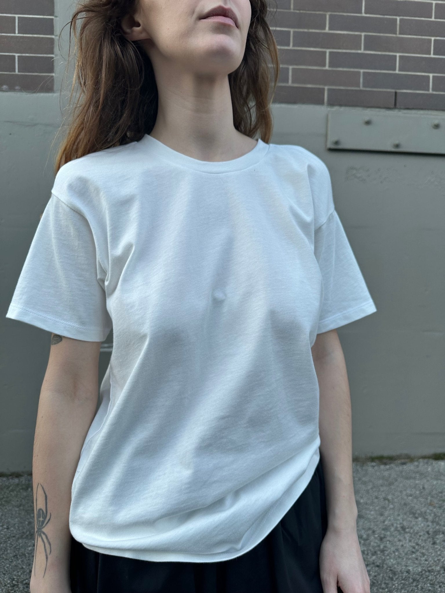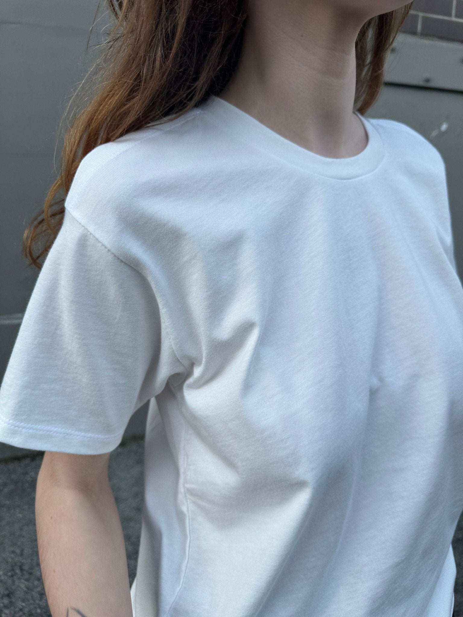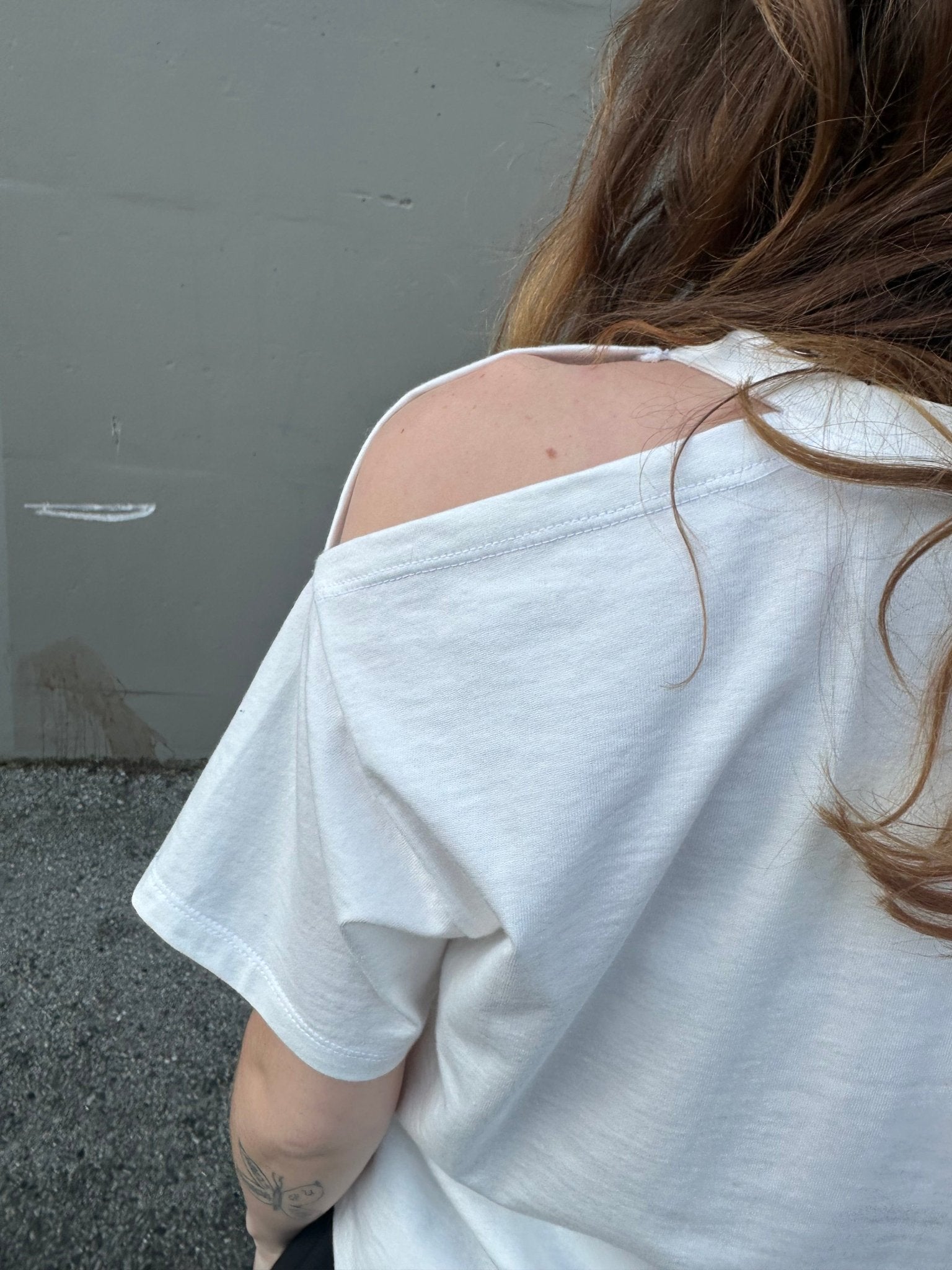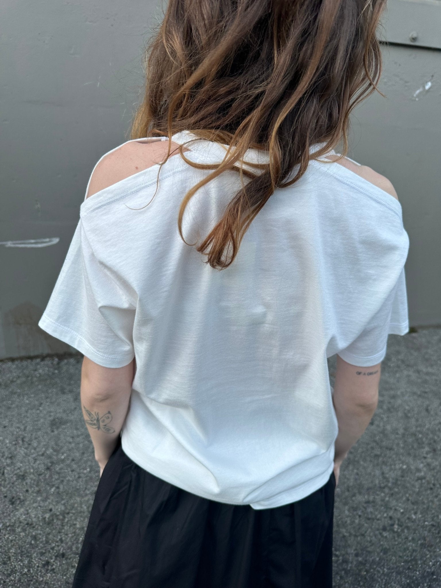 A classic white tee with a spin. Features two triangle shaped cut-outs on each back shoulder.