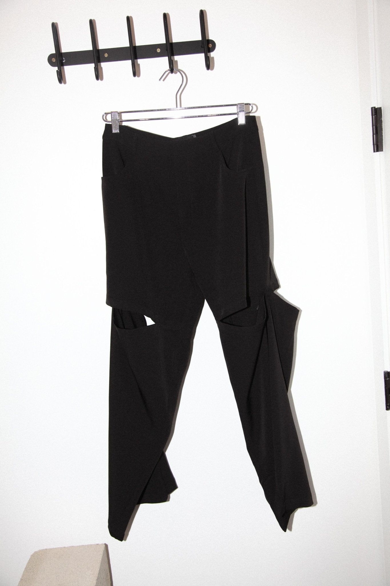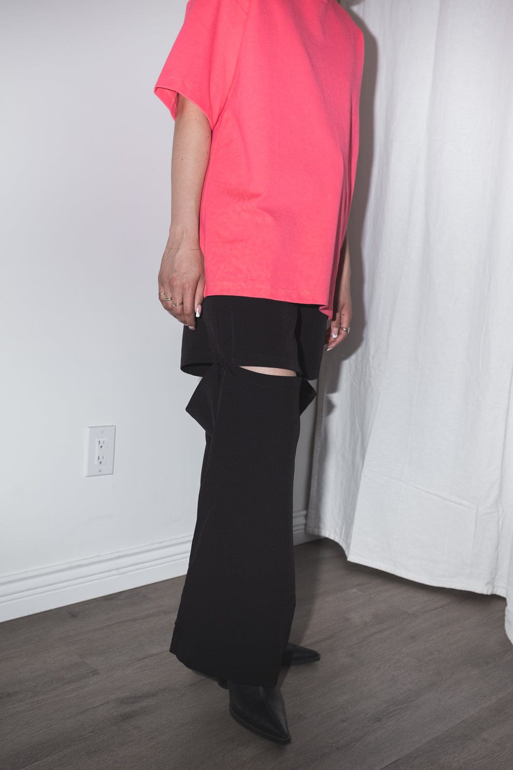 Black wide leg pant with slits at the knee in the front and back. Made of 95% Polyester 5% Elastane.