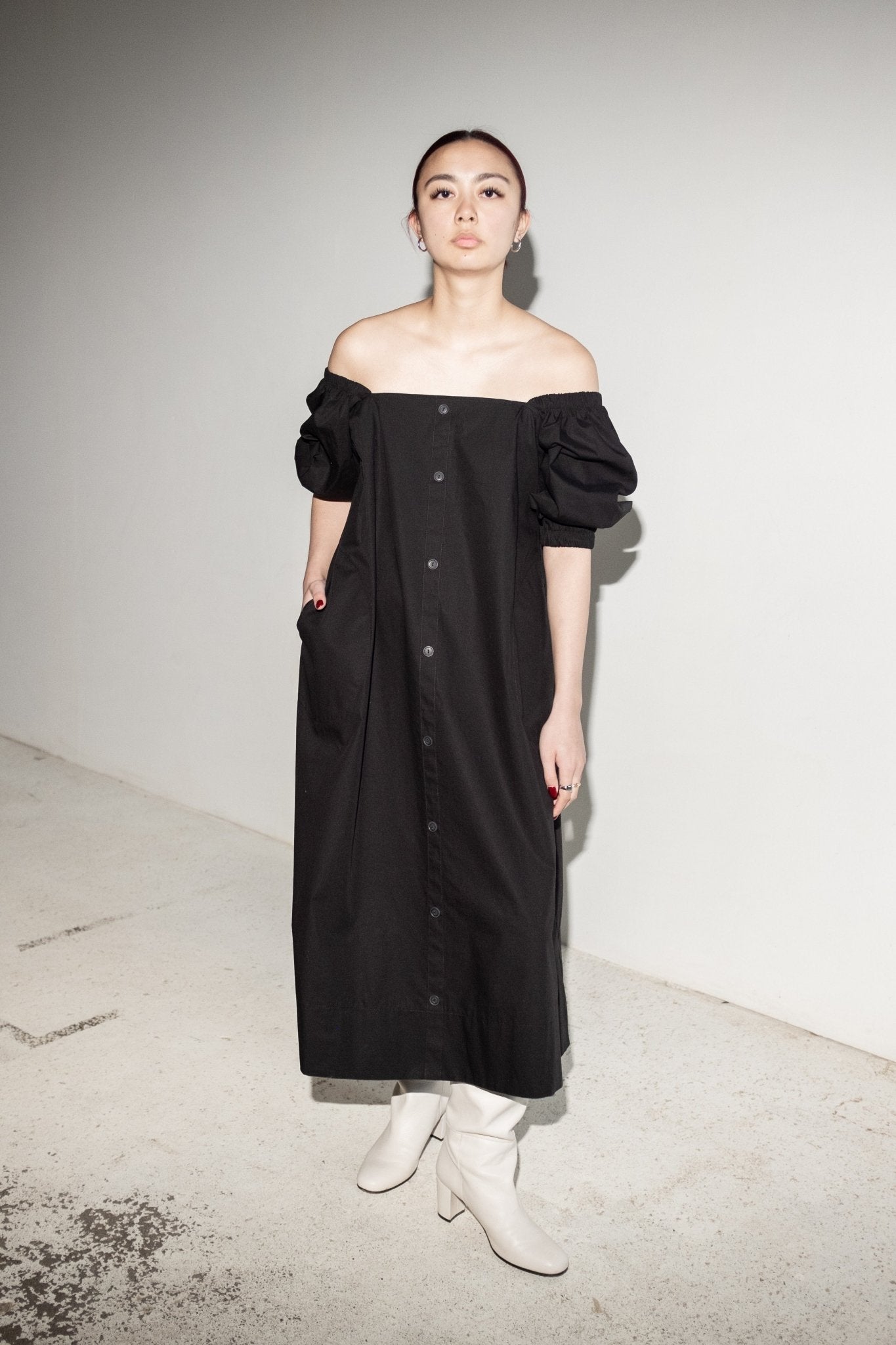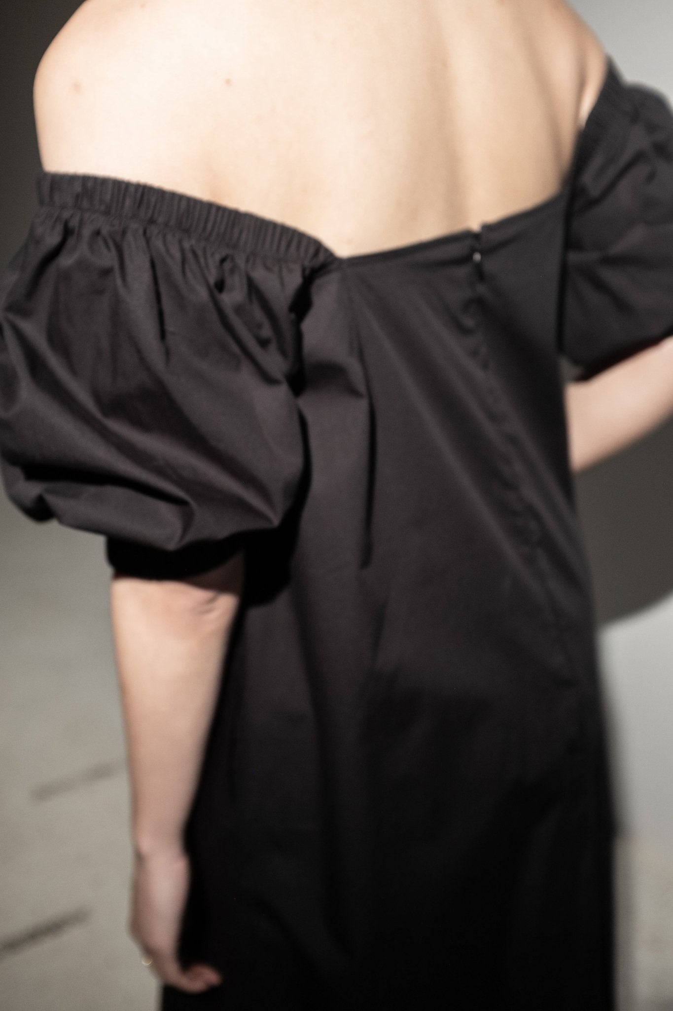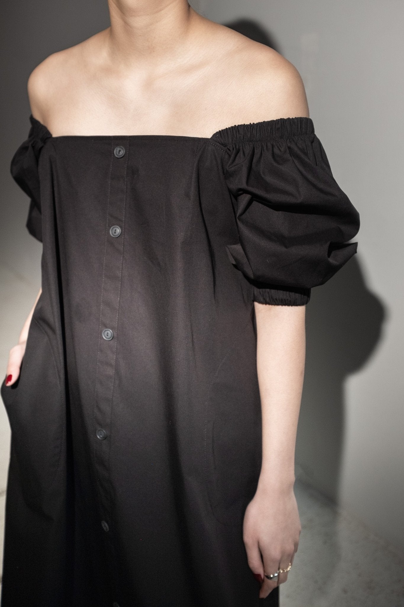 Oversized A-line dress with puffy sleeves. This dress has an easy fit silhouette and side pockets. Dress can we worn on or off shoulders. Made of 100% Cotton.