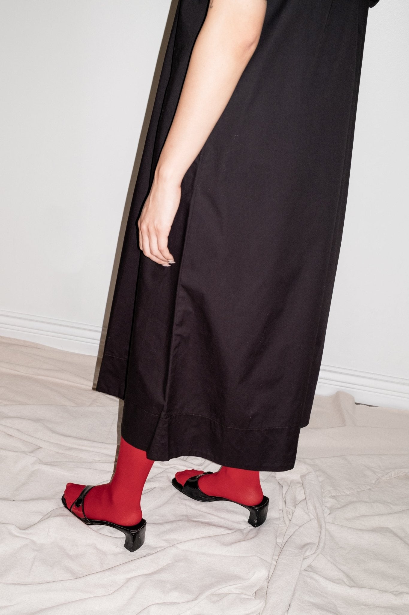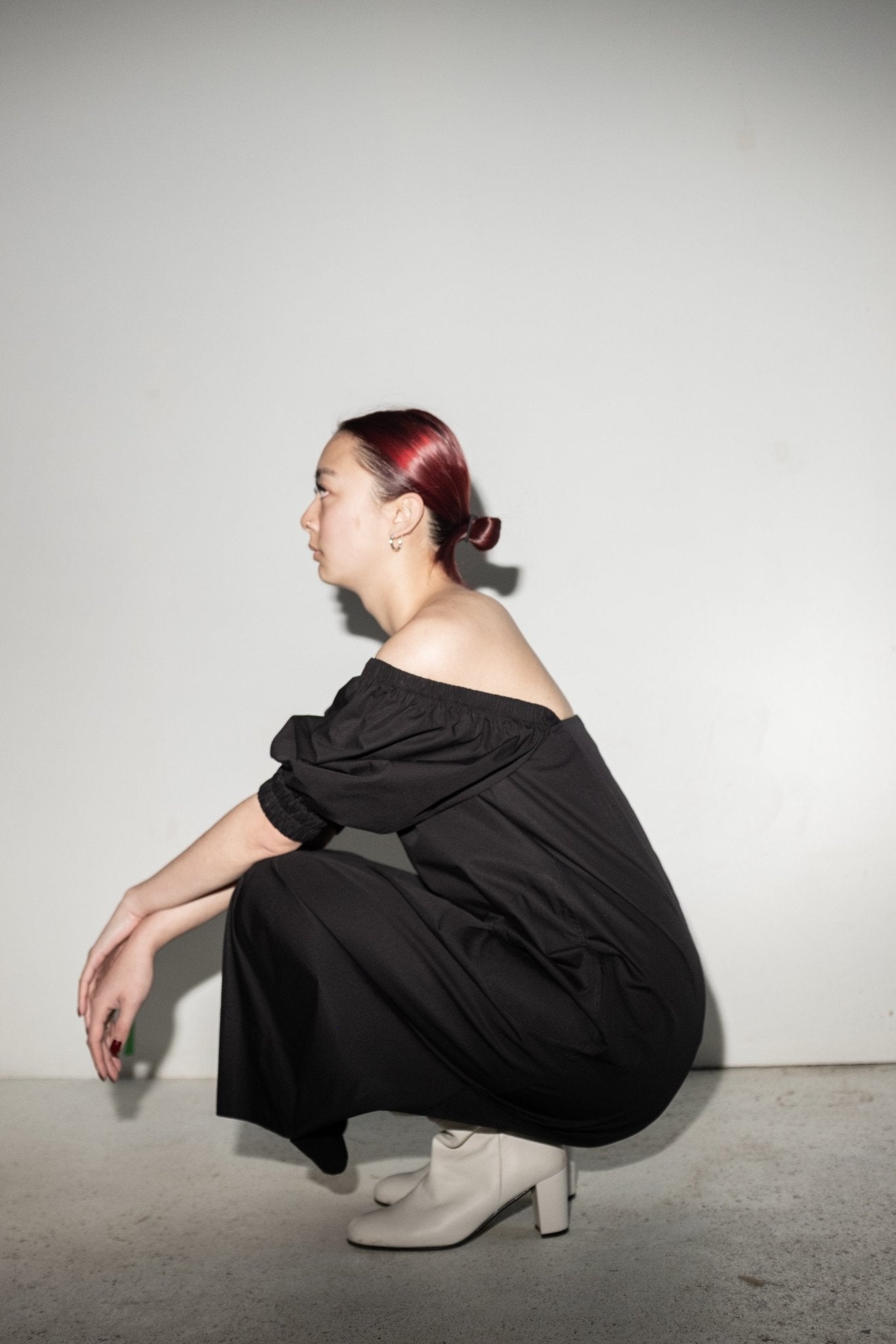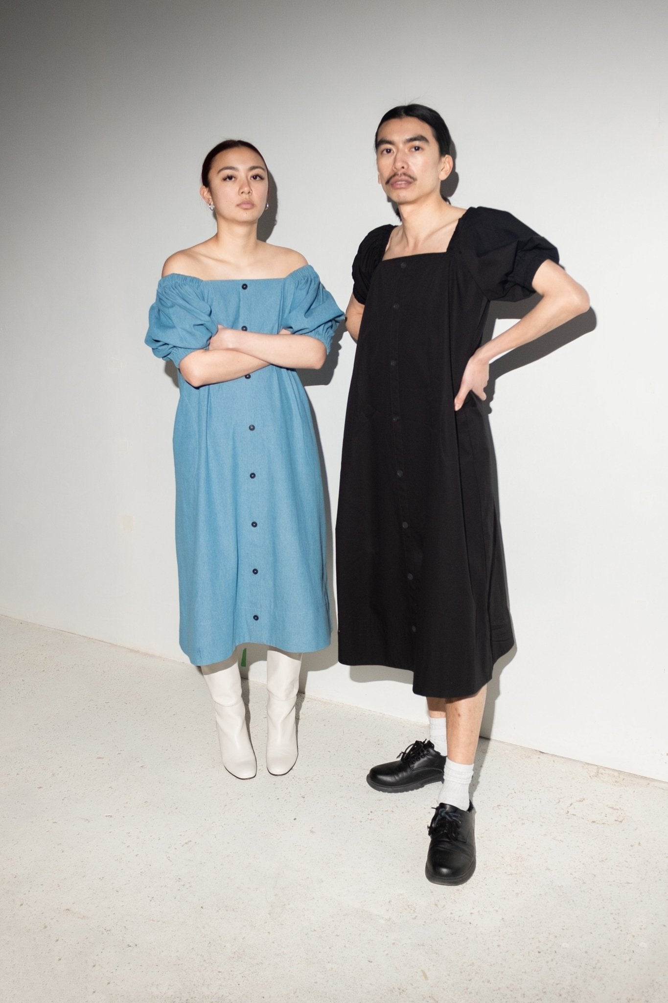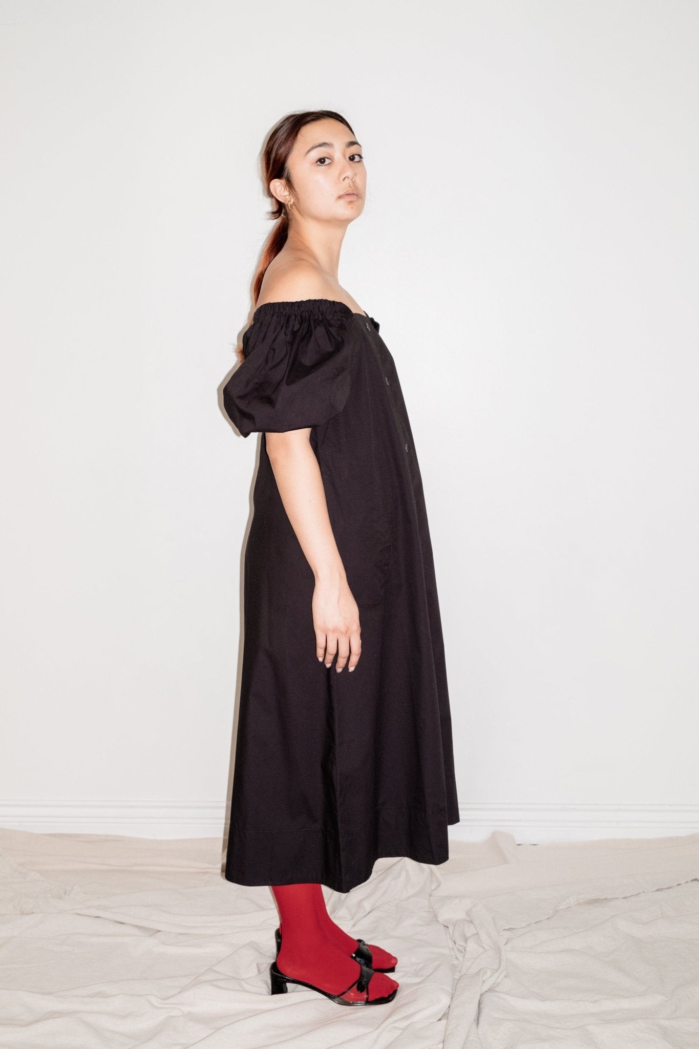 Oversized A-line dress with puffy sleeves. This dress has an easy fit silhouette and side pockets. Dress can we worn on or off shoulders. Made of 100% Cotton.