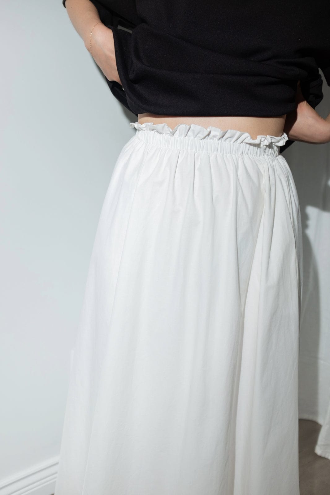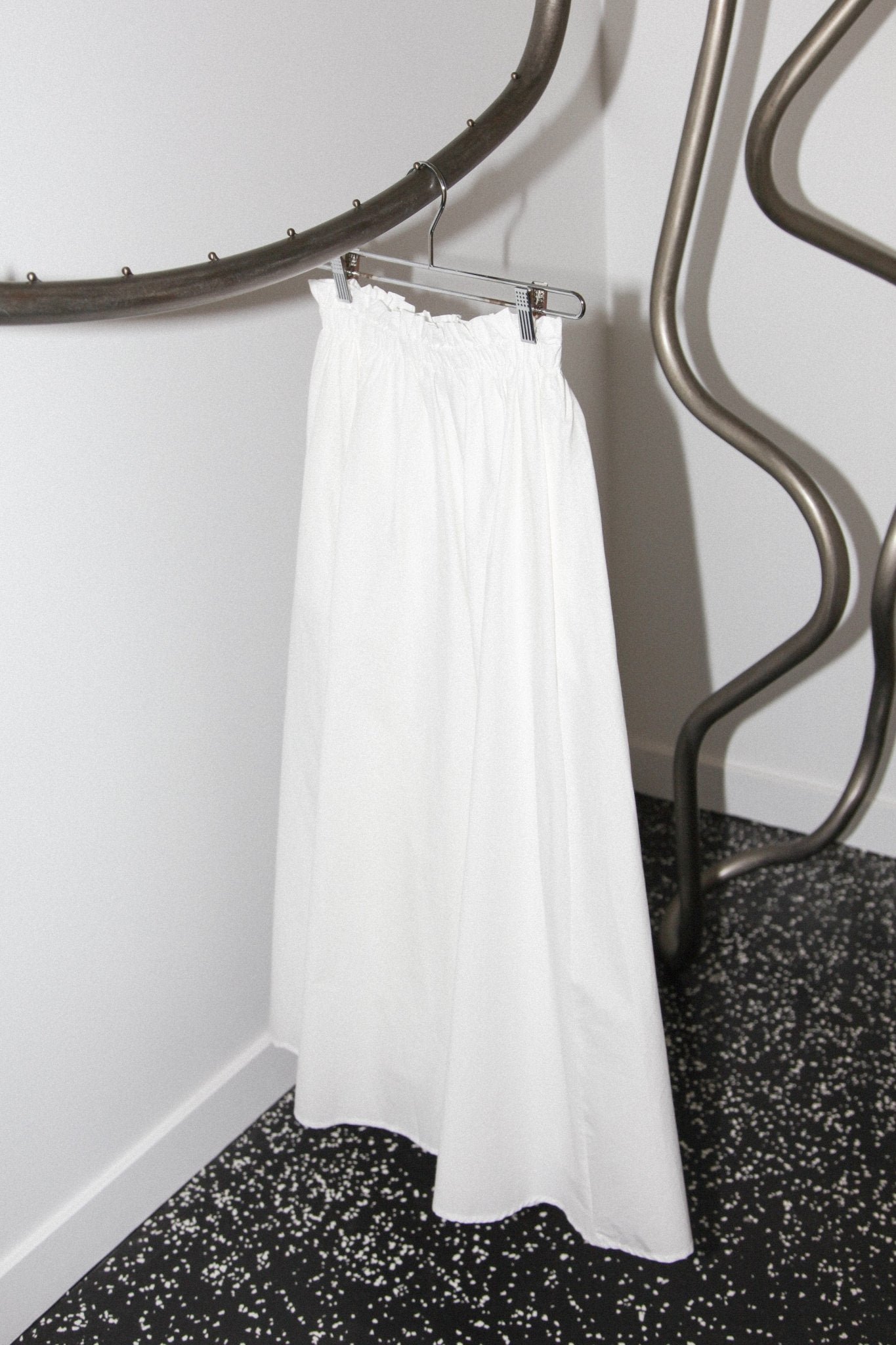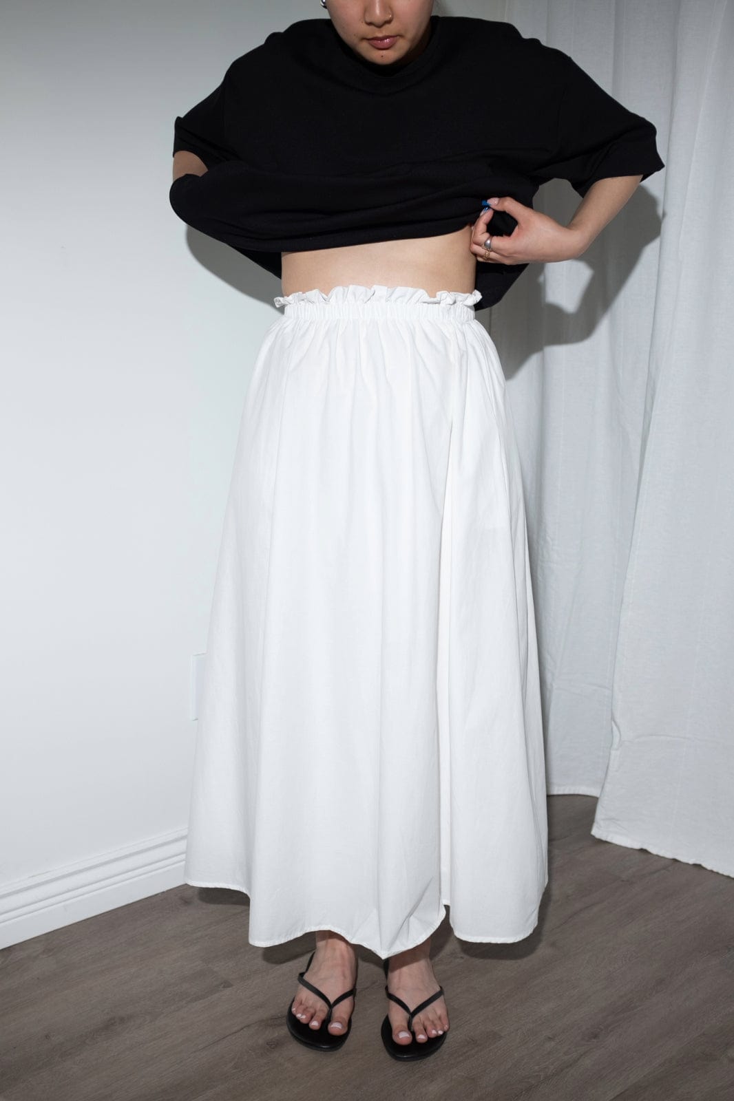 Midi skirt with gathered detailing at the elastic waist in white. This piece is multifunctional and can also be worn as a strapless dress. Made of 100% Rayon and has a lining.