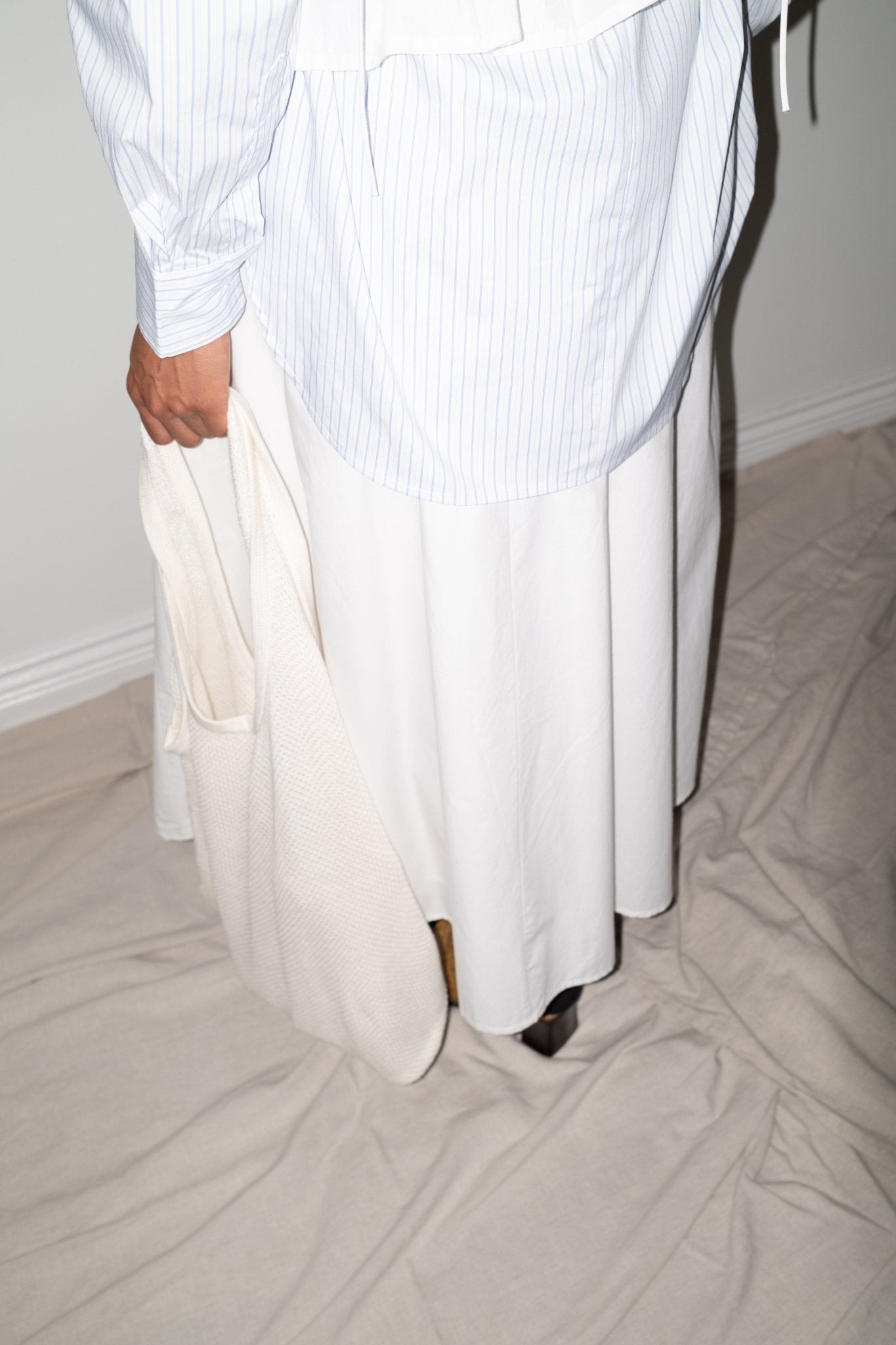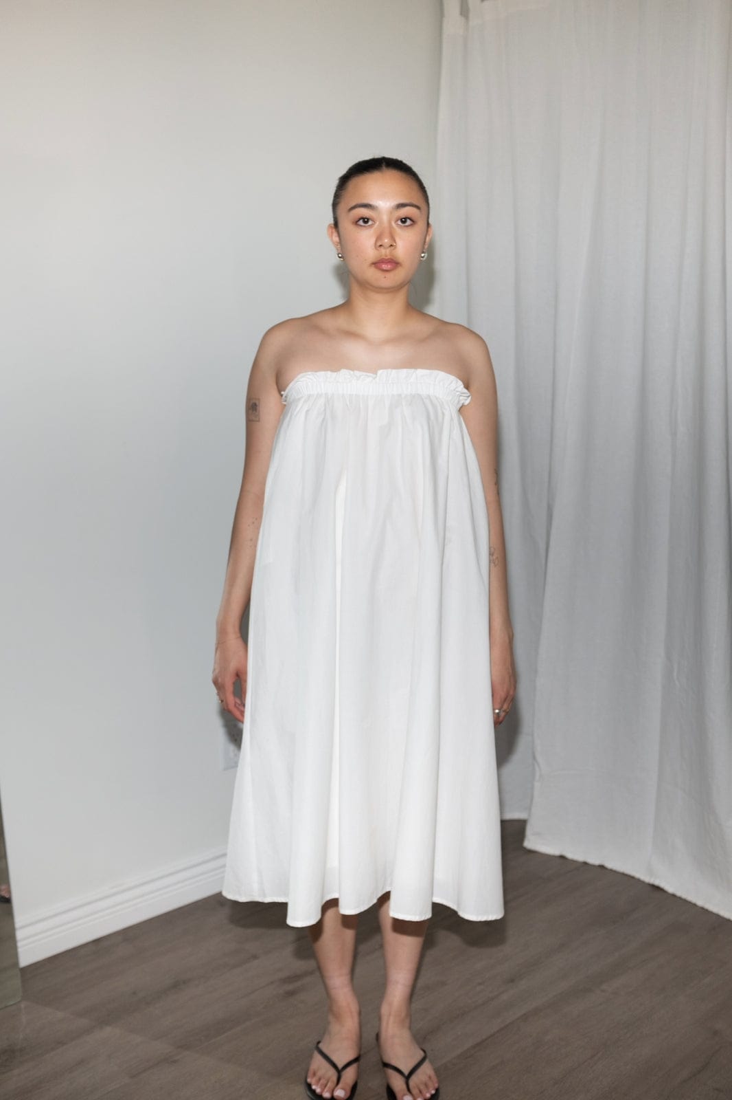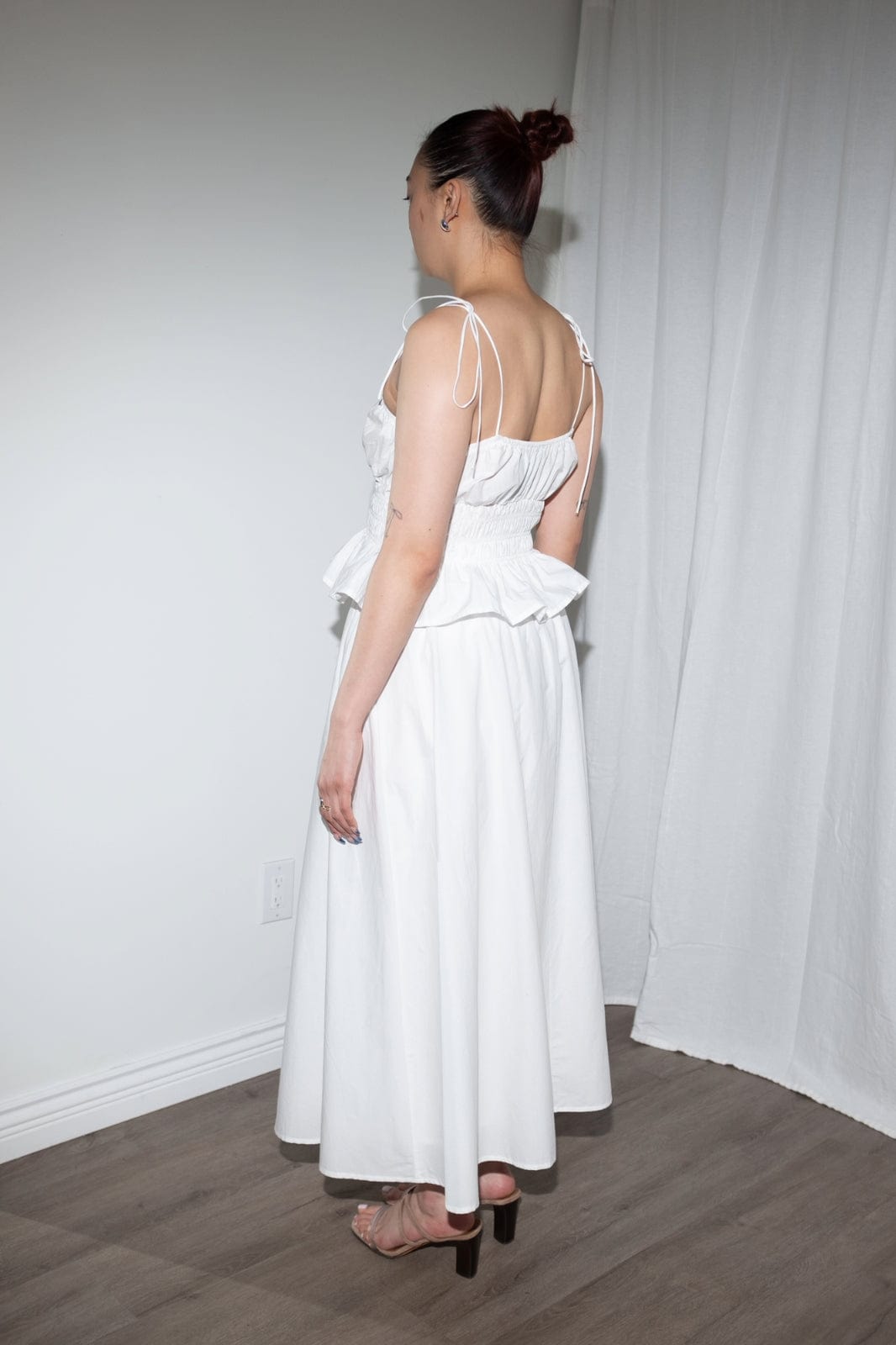 Midi skirt with gathered detailing at the elastic waist in white. This piece is multifunctional and can also be worn as a strapless dress. Made of 100% Rayon and has a lining.