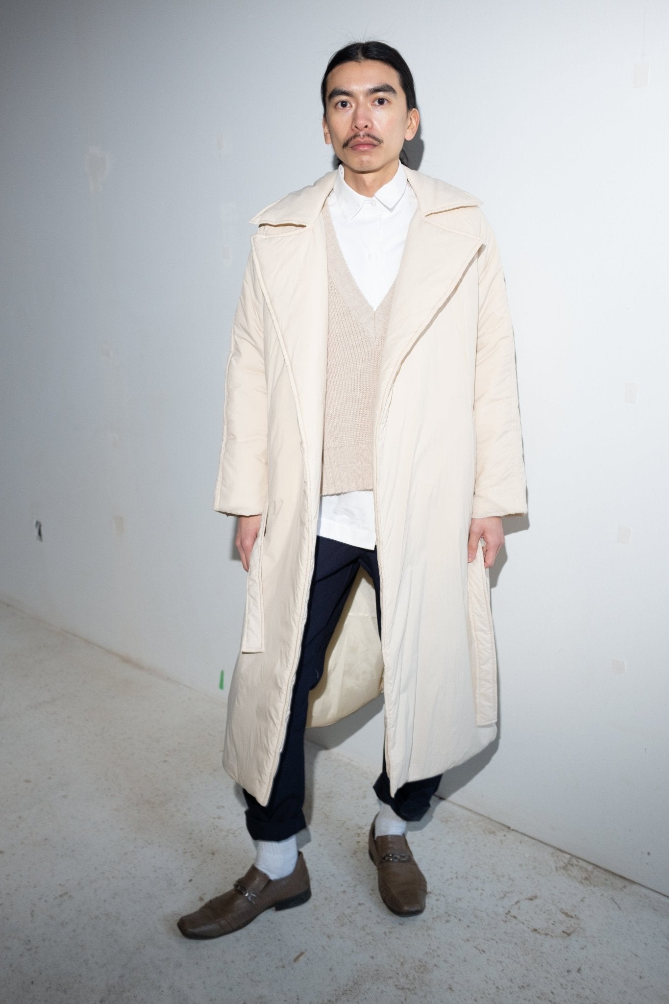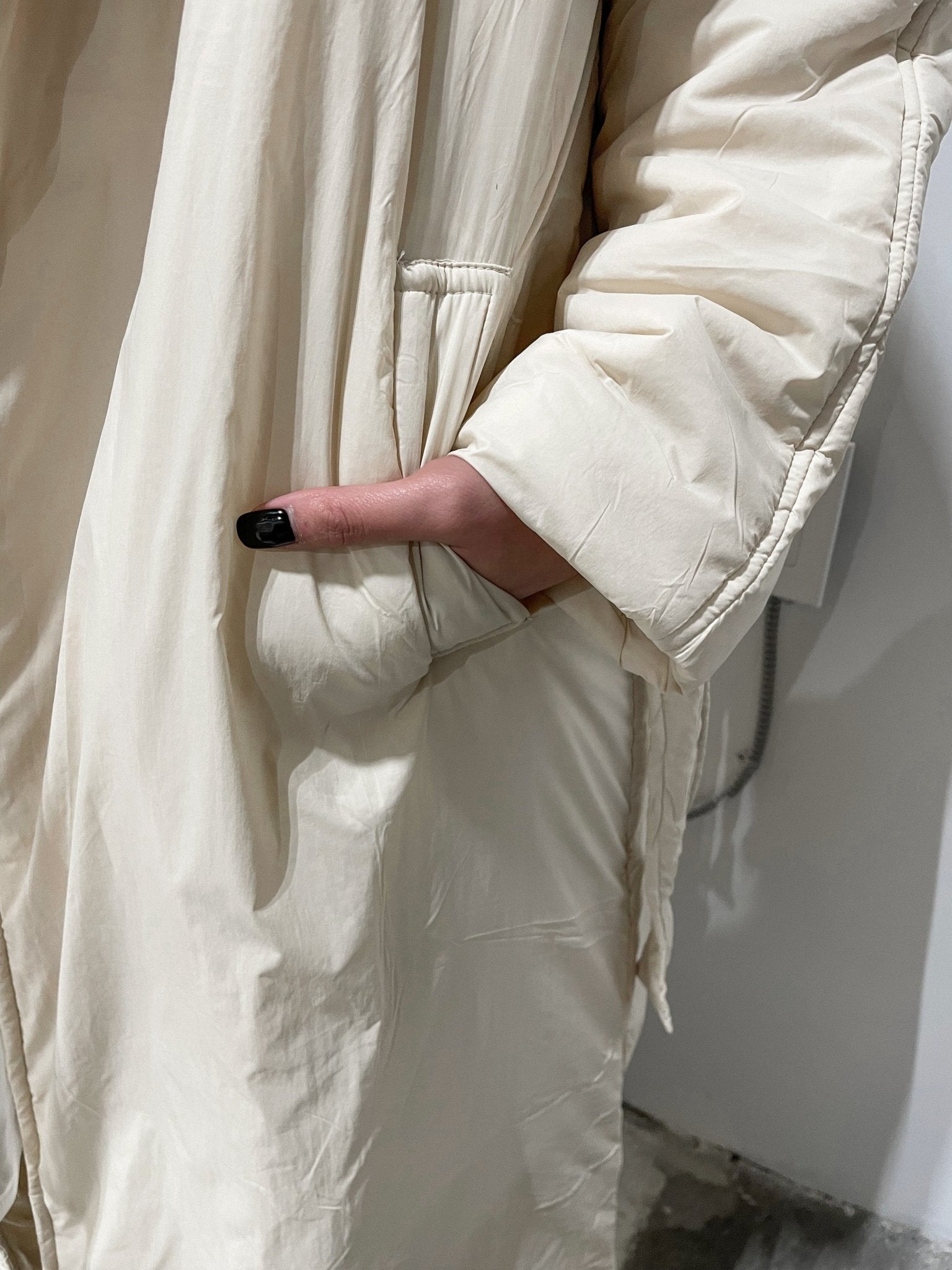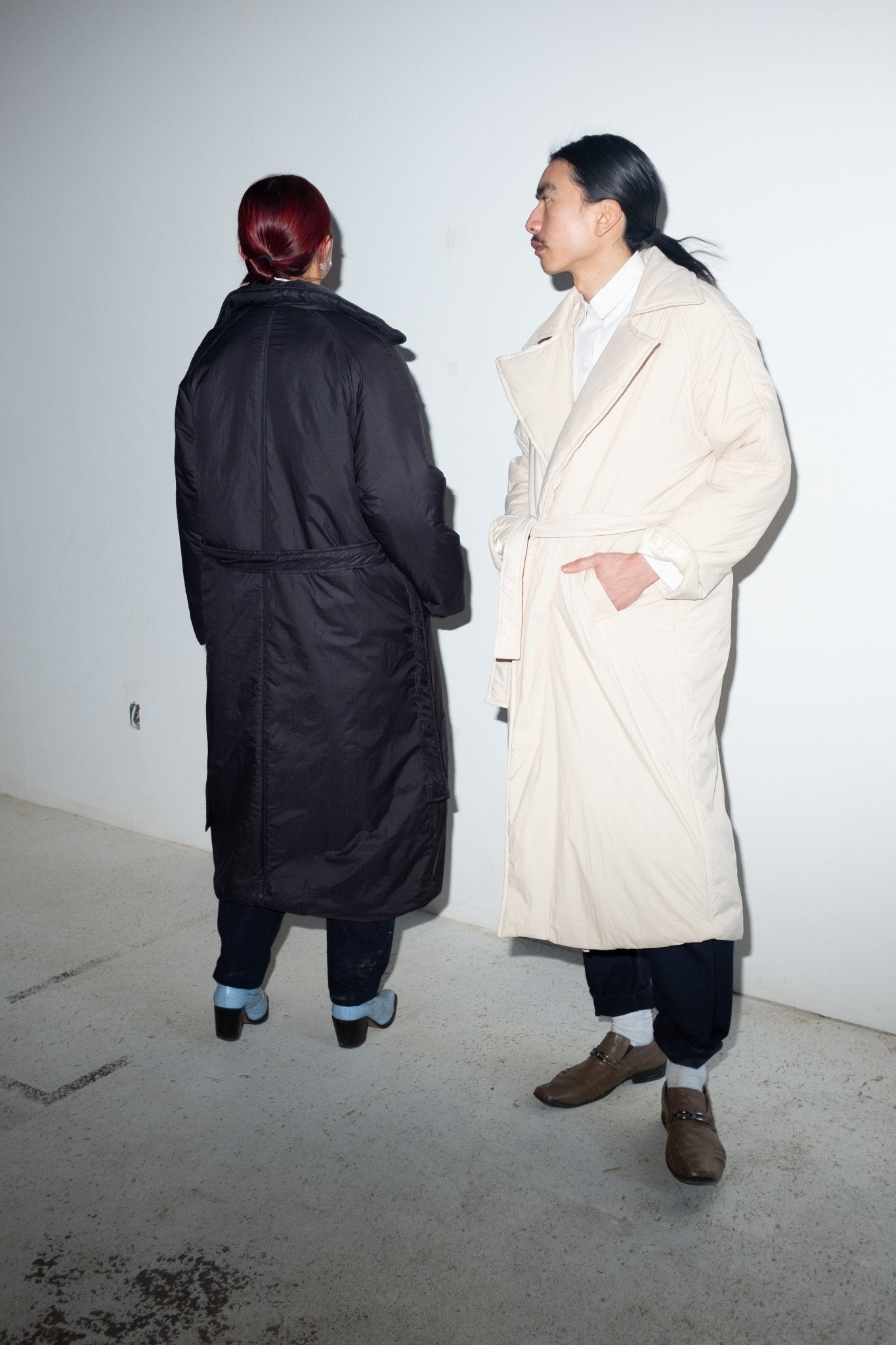 Easy fit puffy coat with self belt closure and inseam pockets. 100% Nylon lining & 100% Polyester outer.