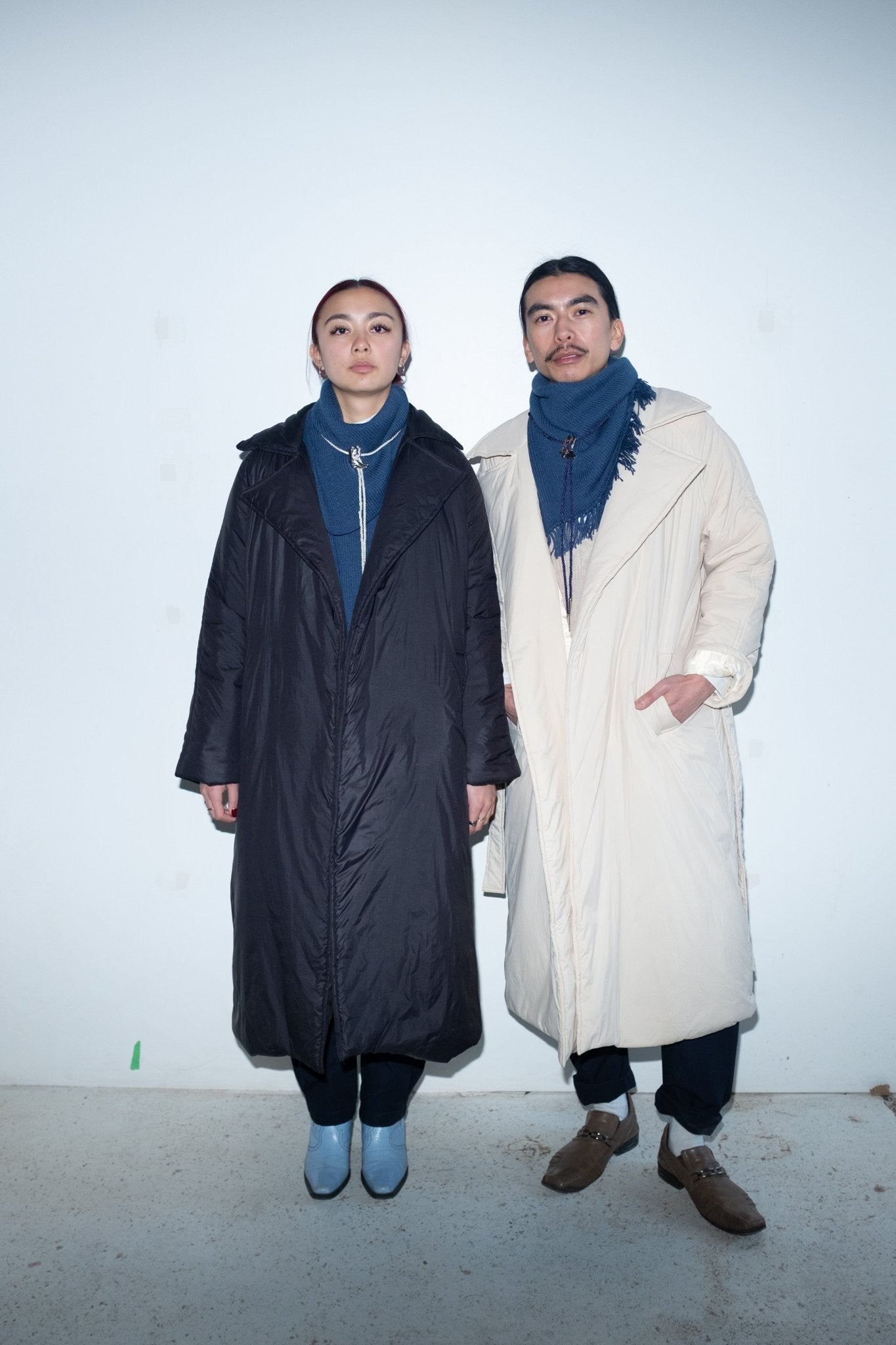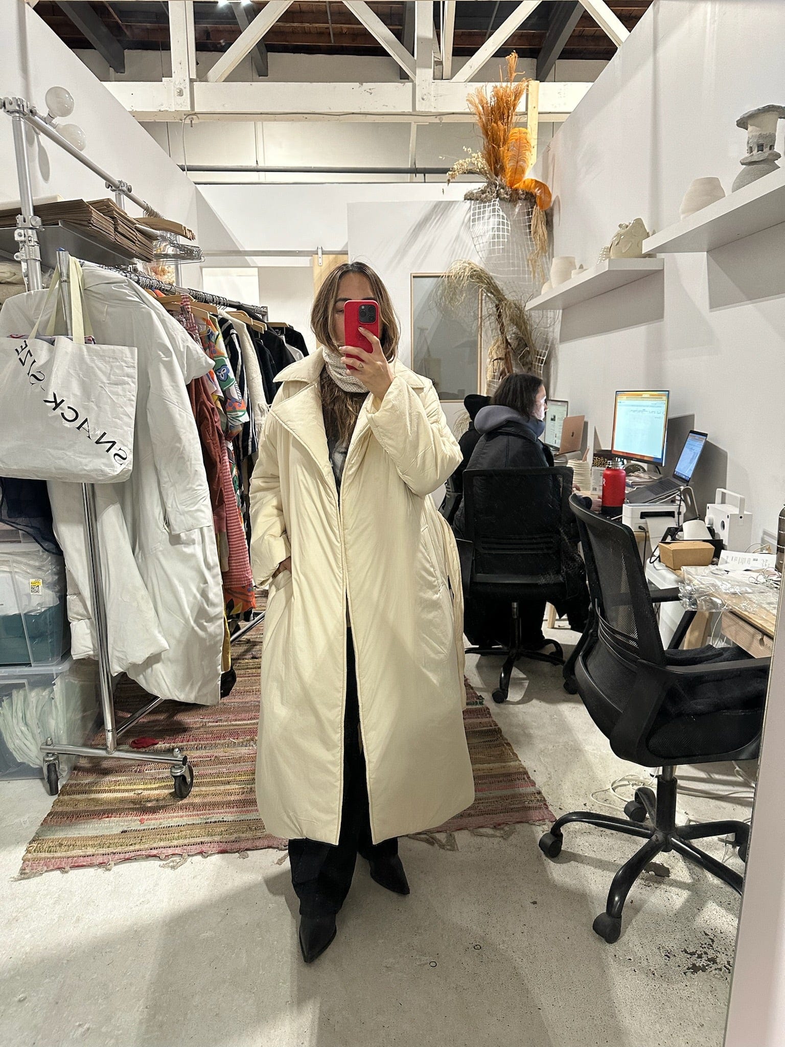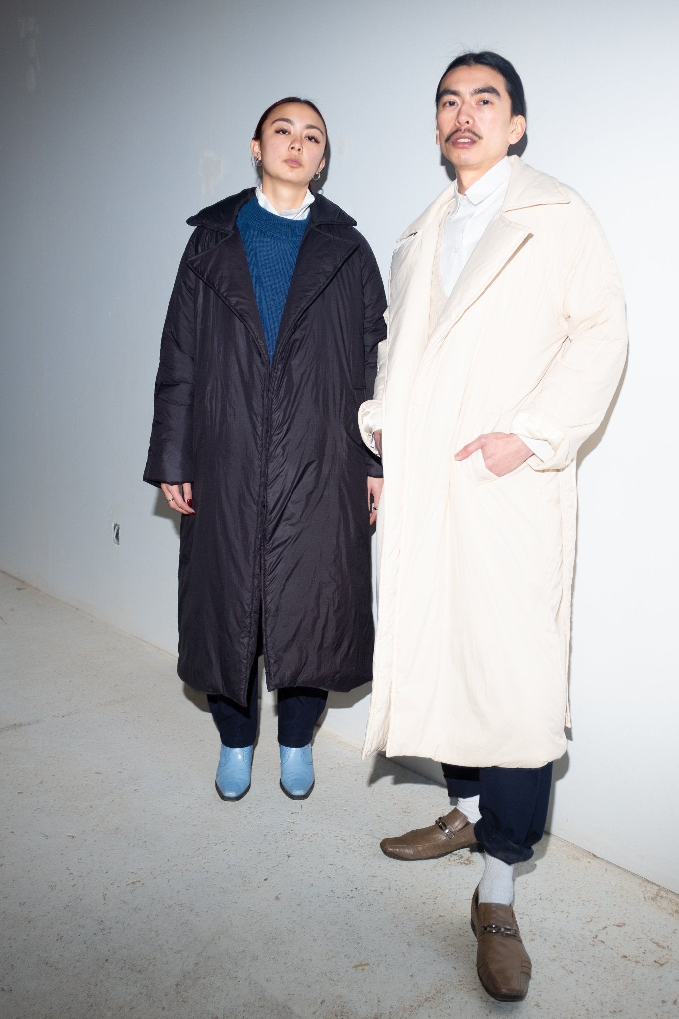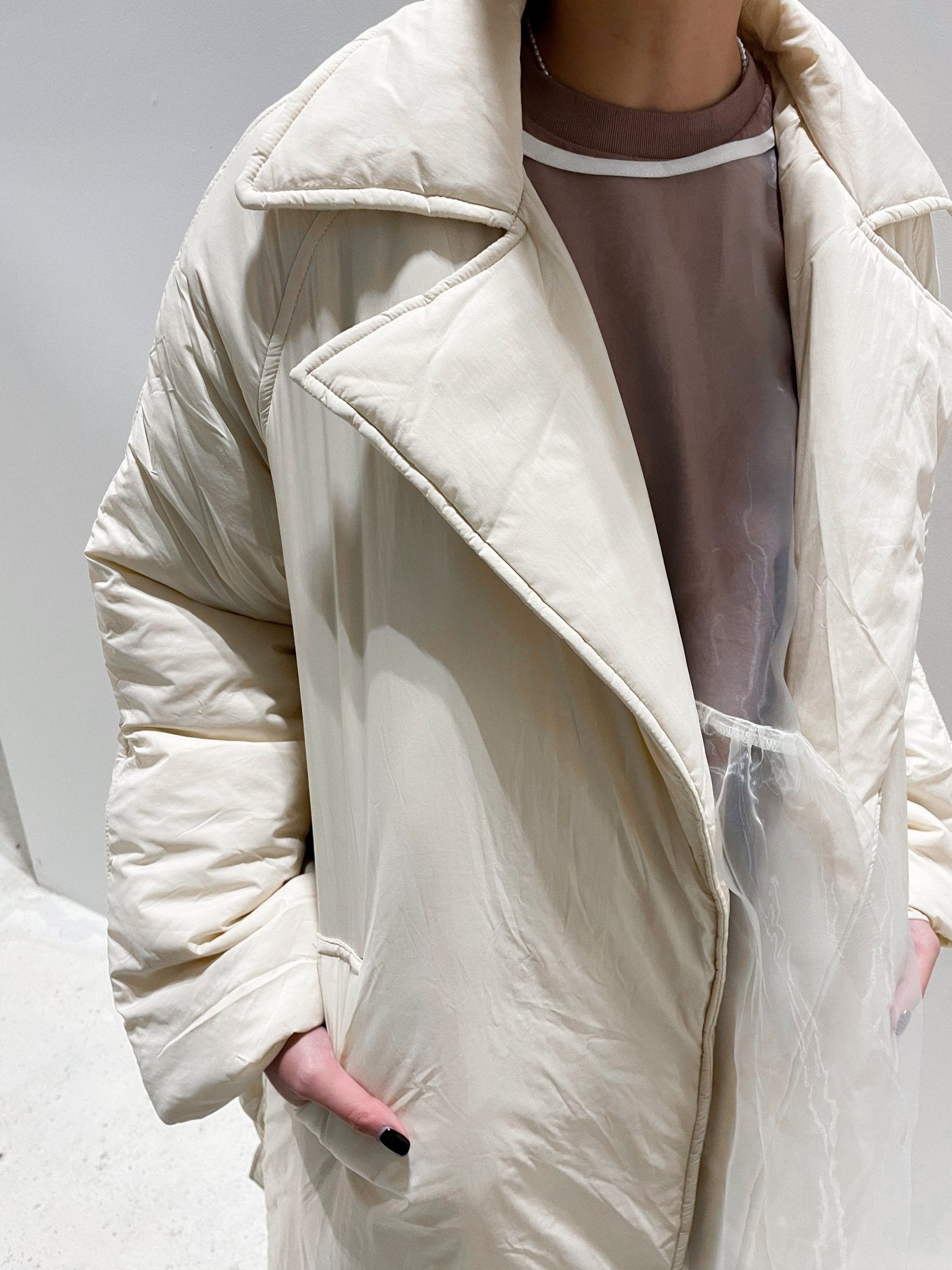 Easy fit puffy coat with self belt closure and inseam pockets. 100% Nylon lining & 100% Polyester outer.