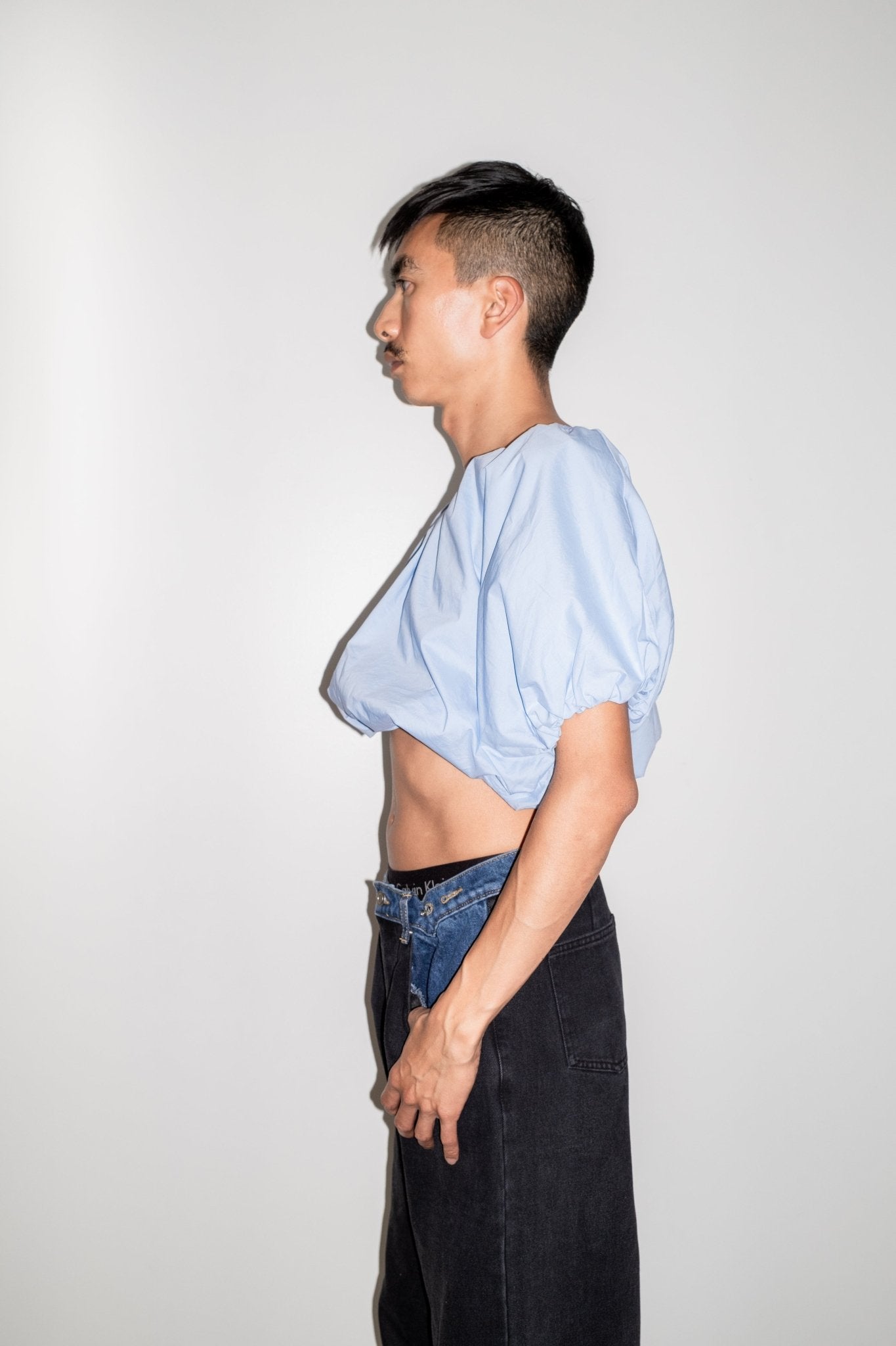 Cropped v-neck bubble top. Made with 100% Cotton.