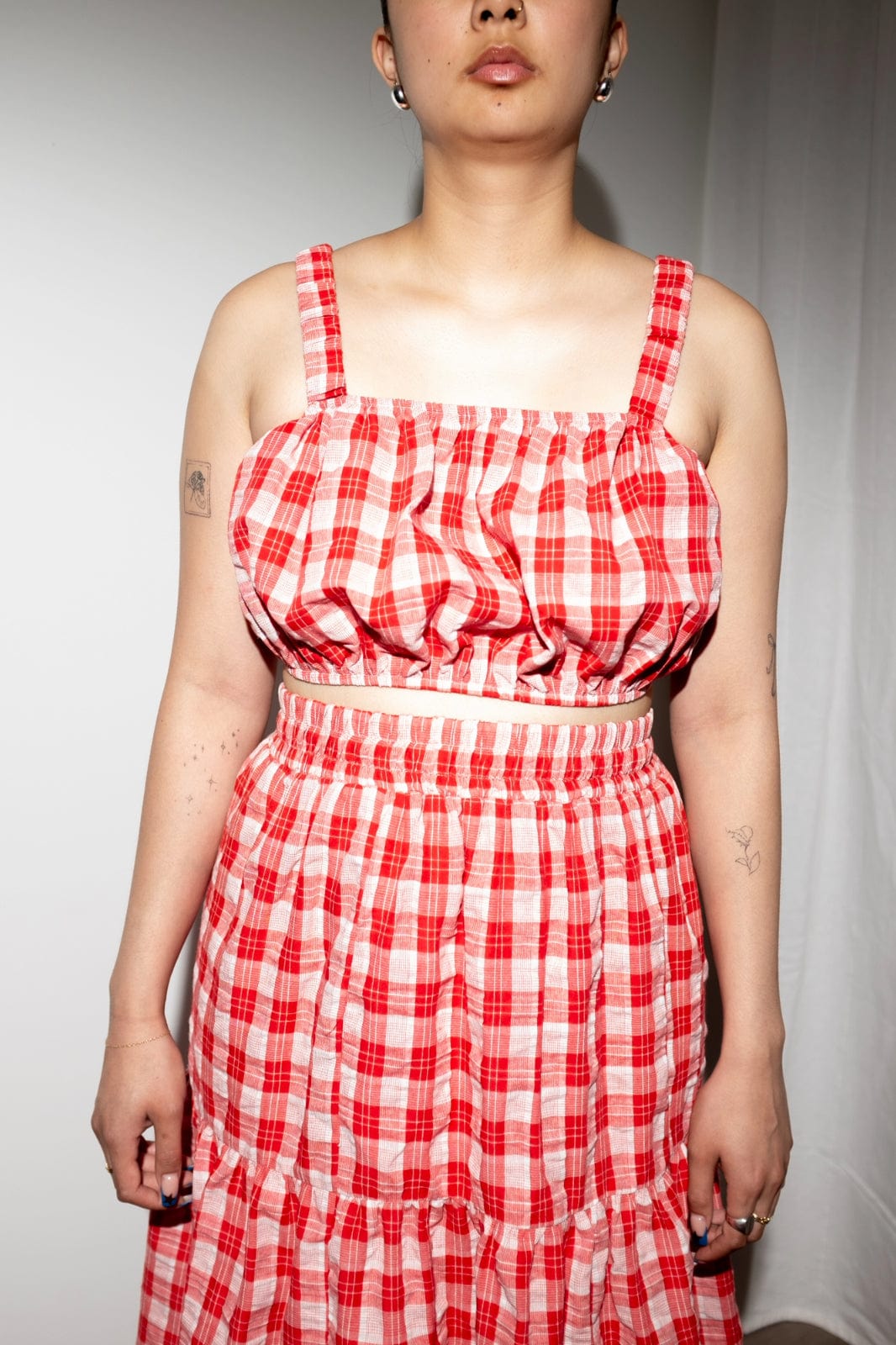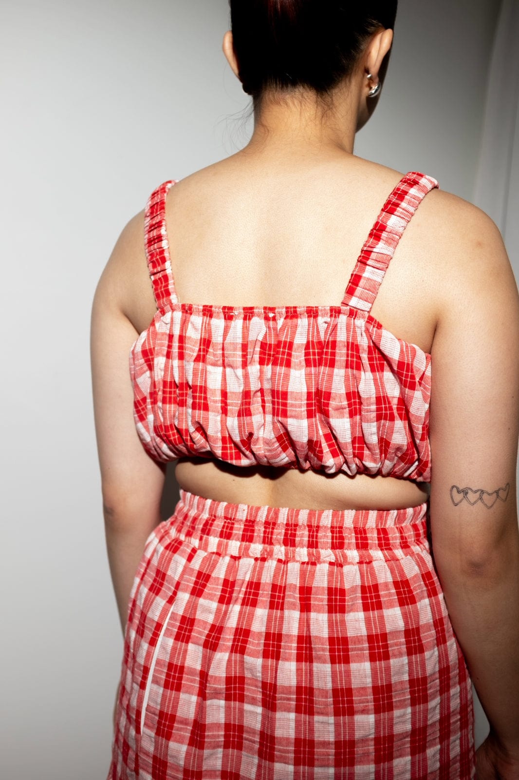 Ruched thick strap bandeau top in red + white gingham. Made of 100% Cotton and has a Chiffon lining.