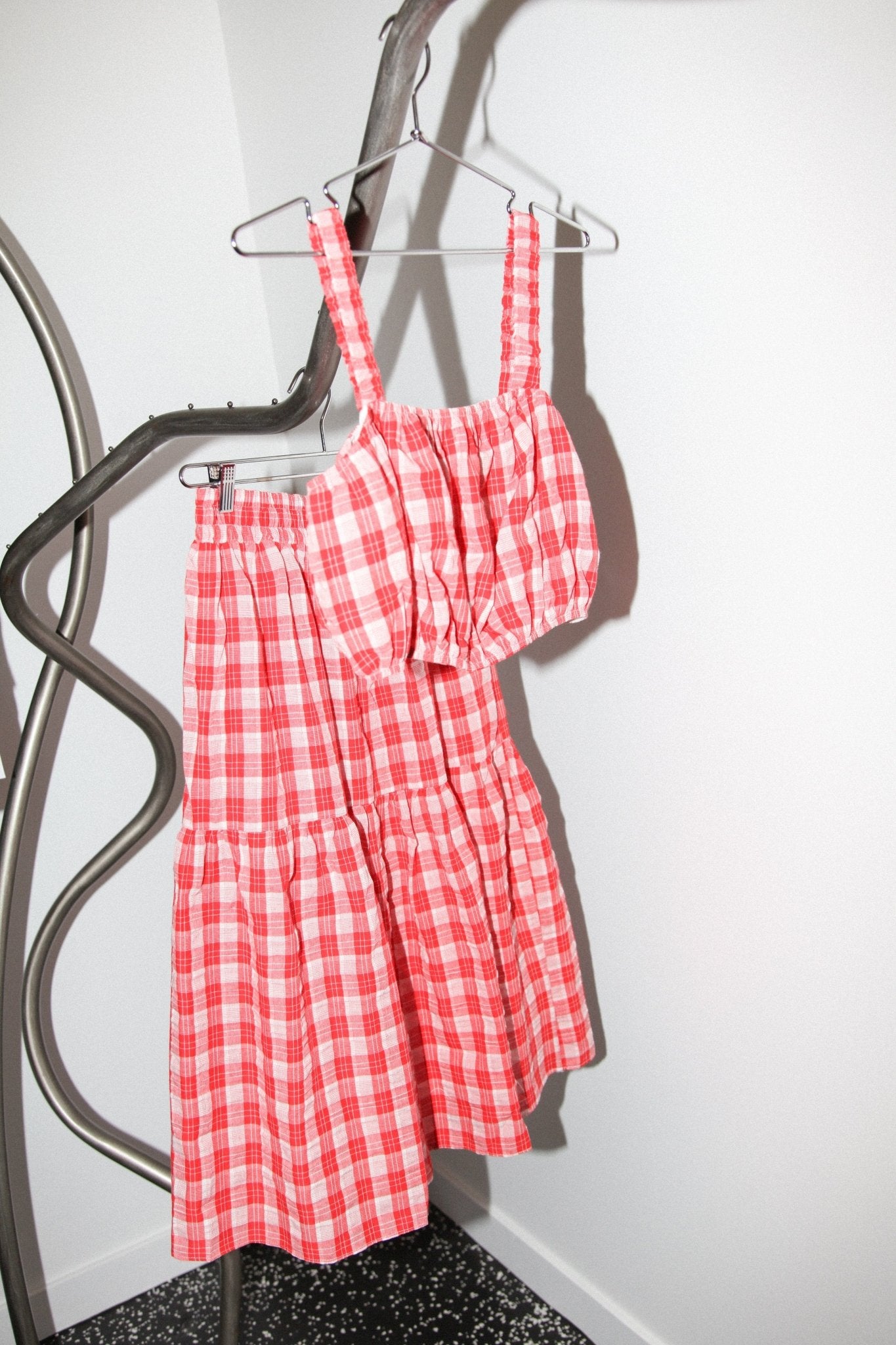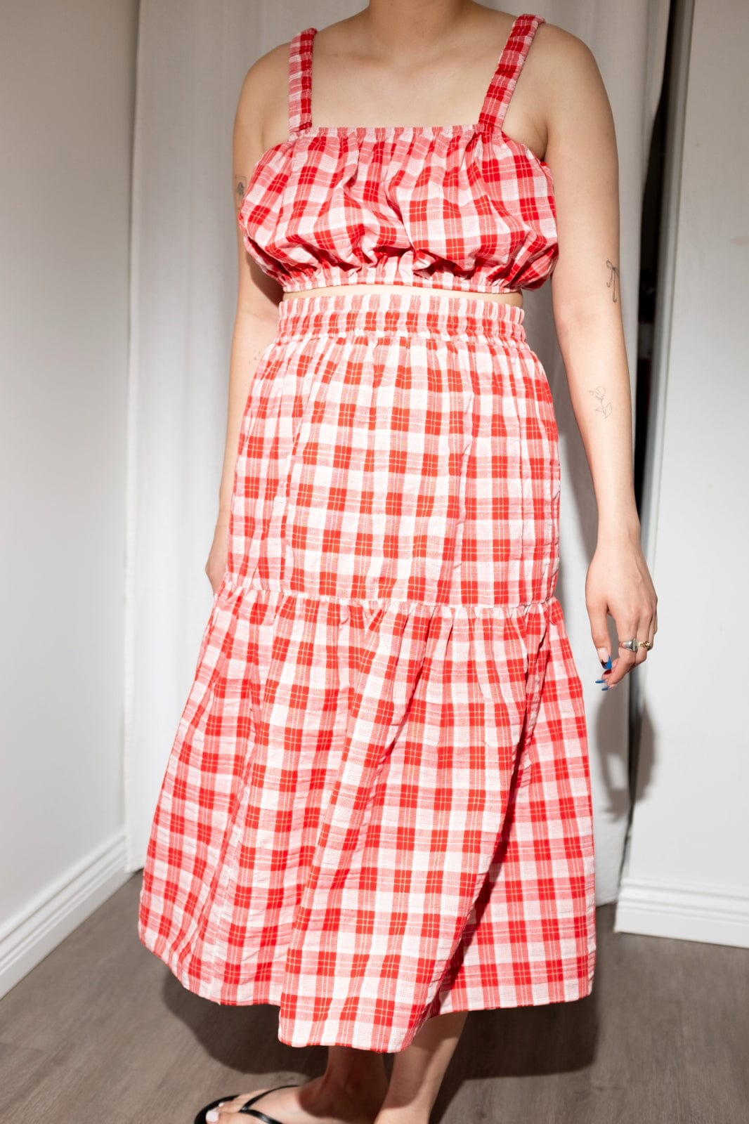 Jayme is wearing the Louise Top paired with the matching Lara Skirt in Red + White Gingham.