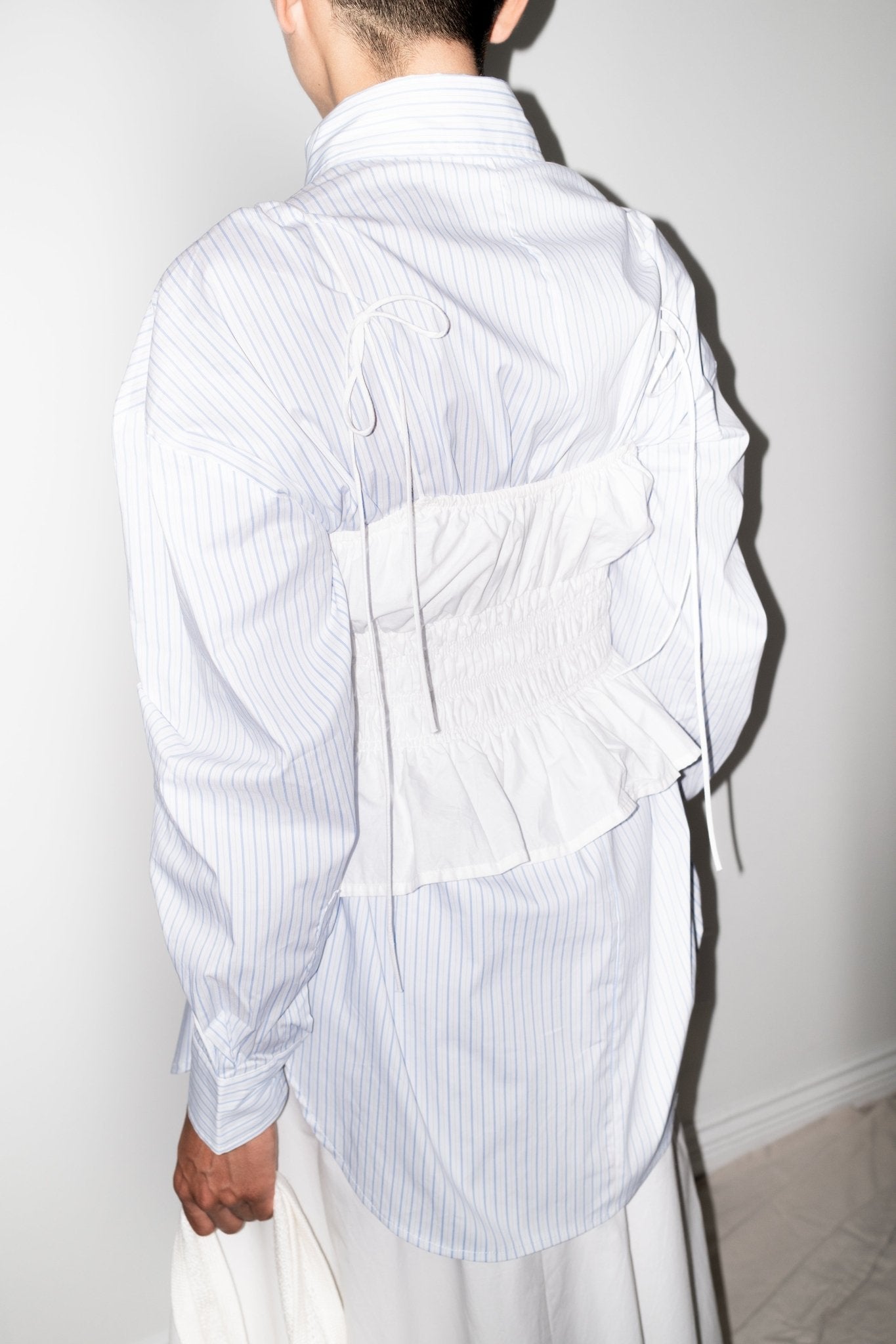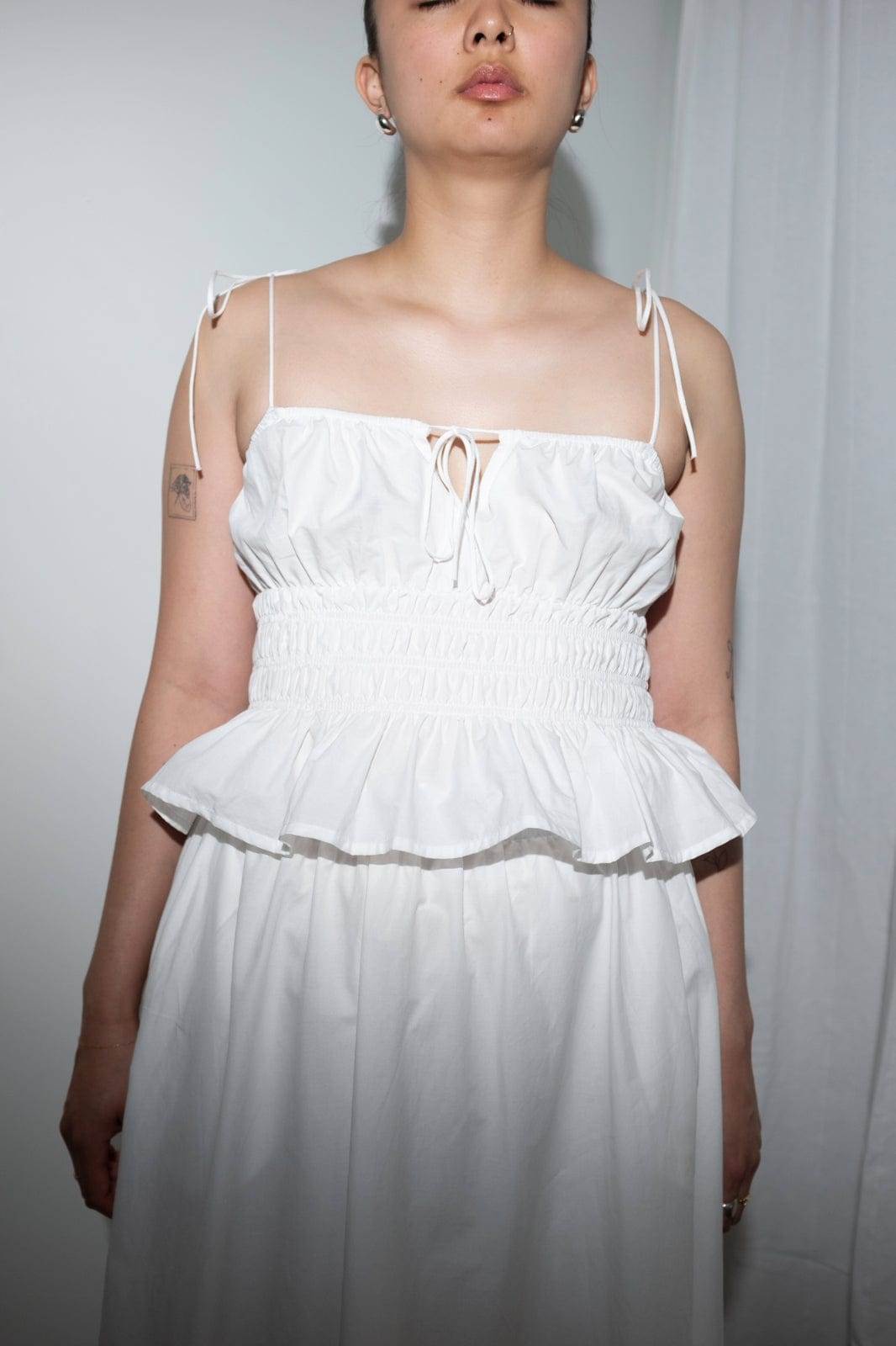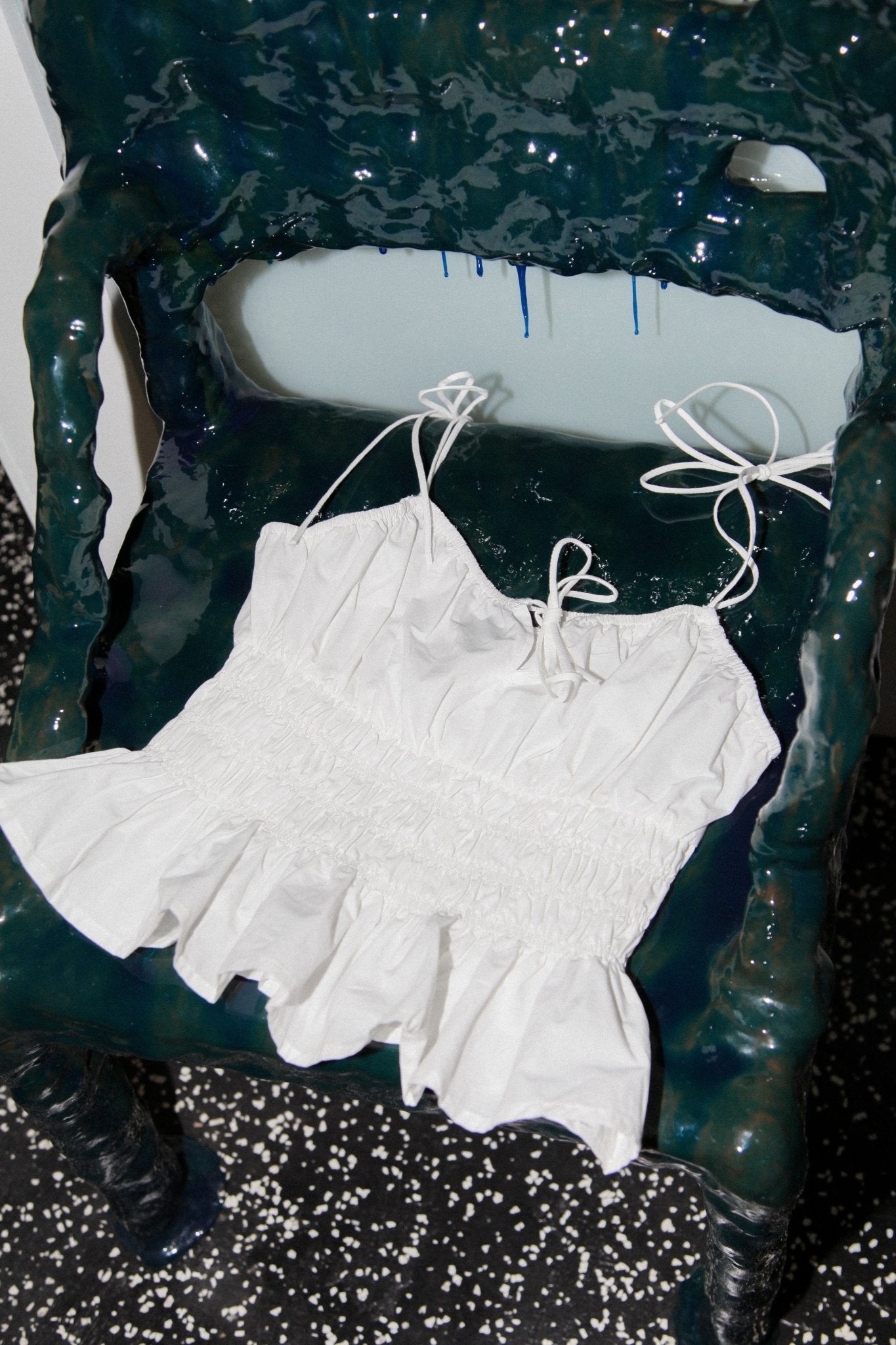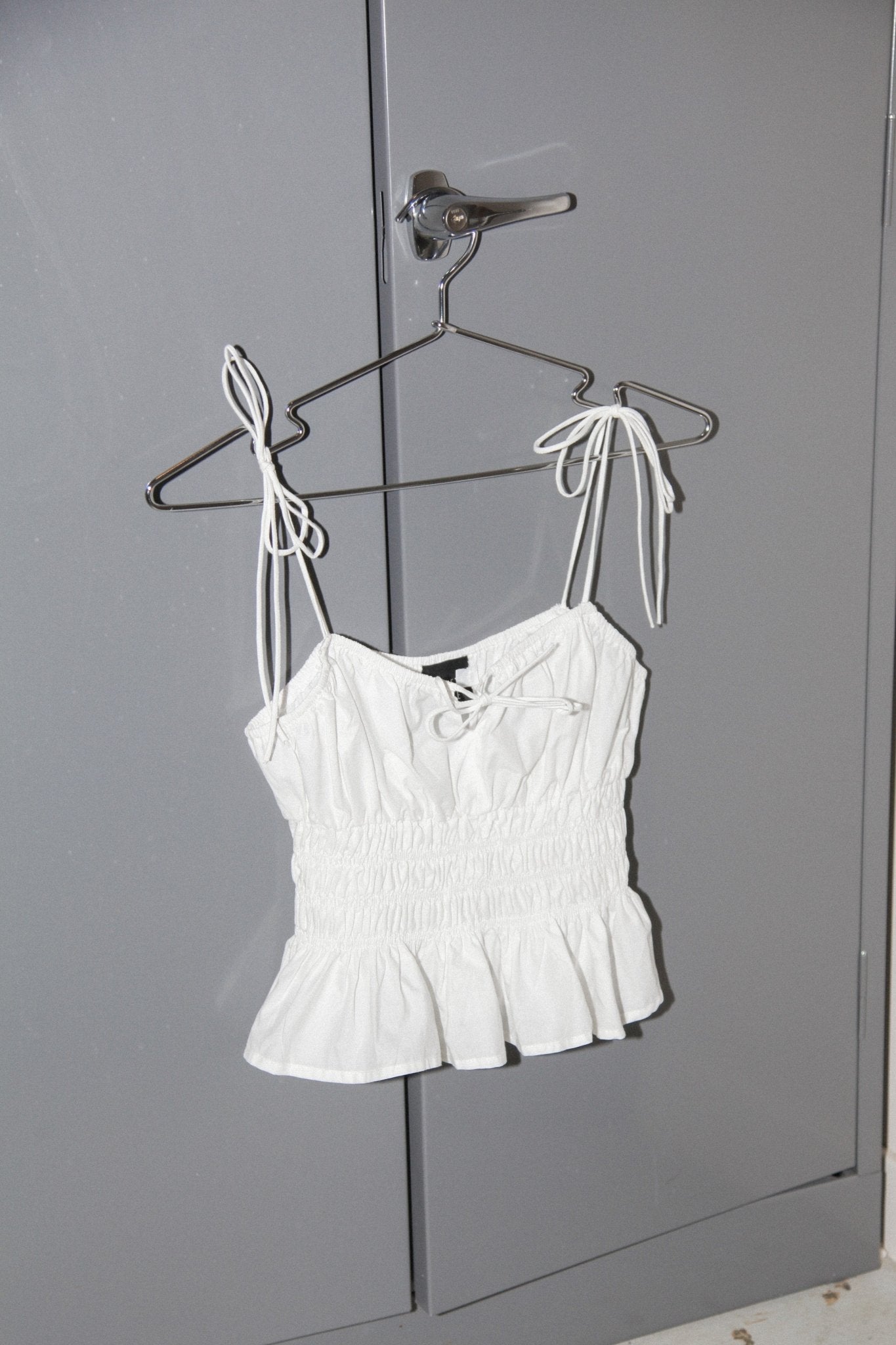 Ruched tank top with self tie straps in white. Made with 100% Rayon.