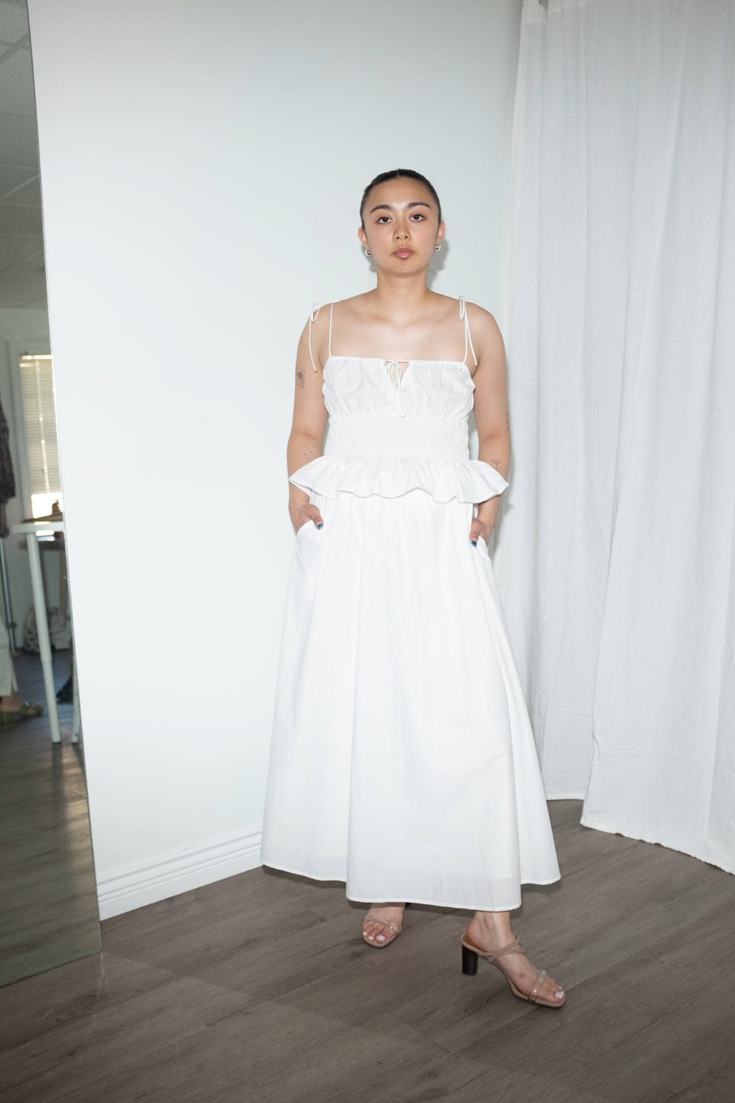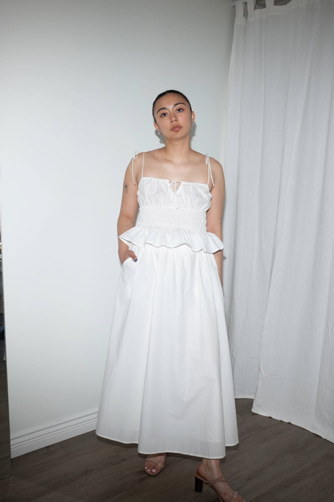 Jayme is wearing the Maya Top with the Nelda Skirt in White.