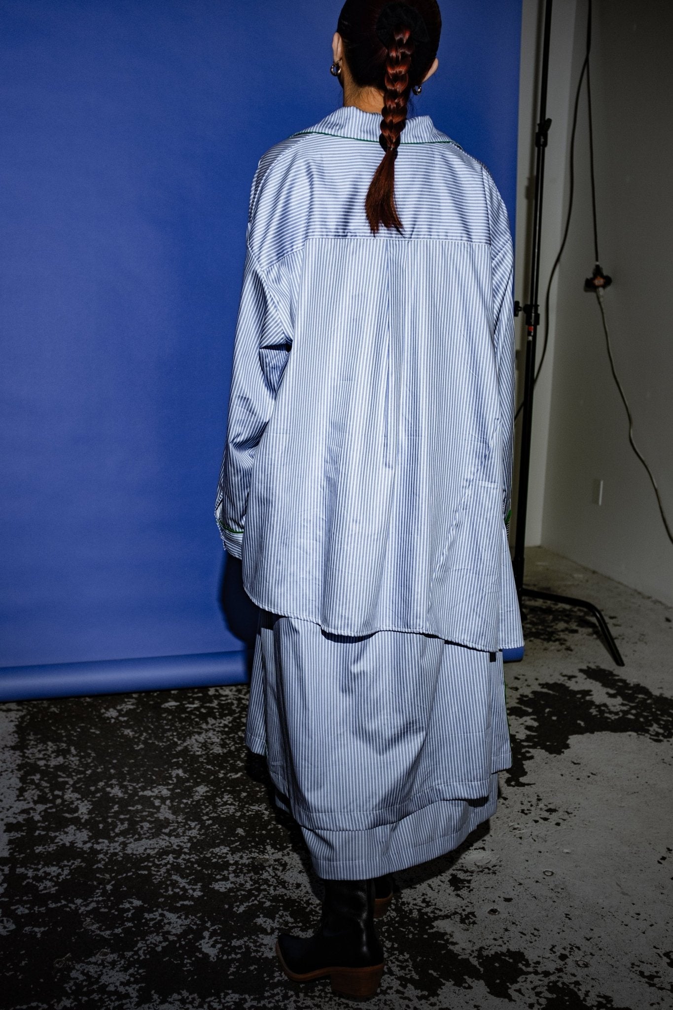 Meta Button Up Shirt in Blue + White Stripe with Green Piping