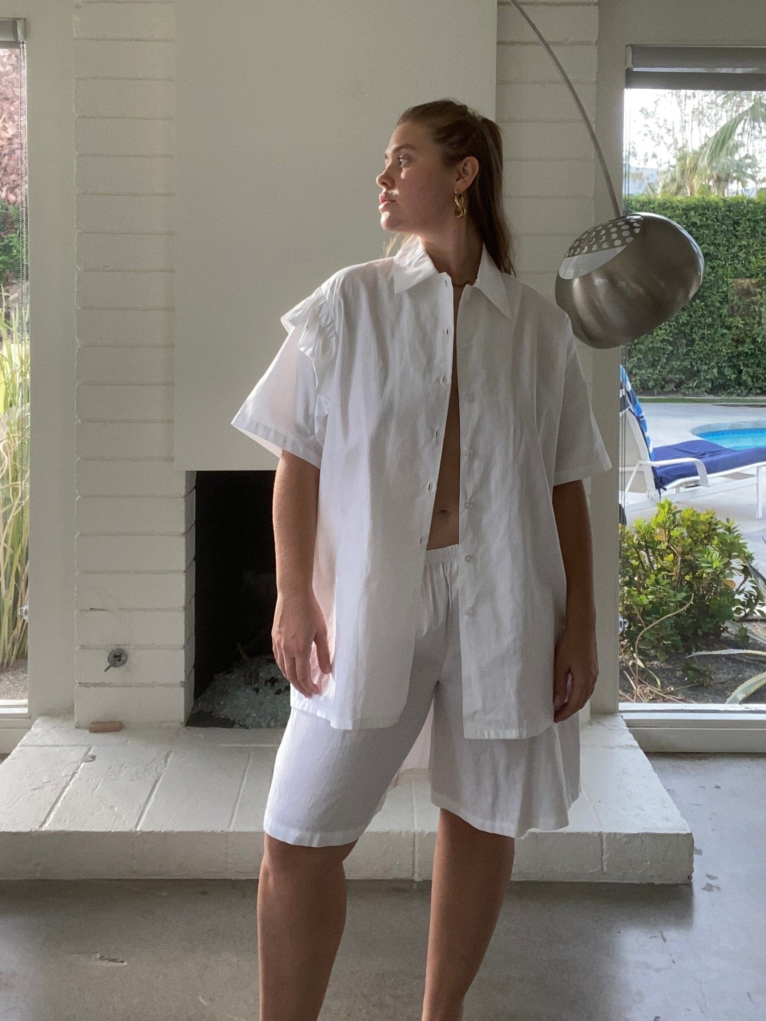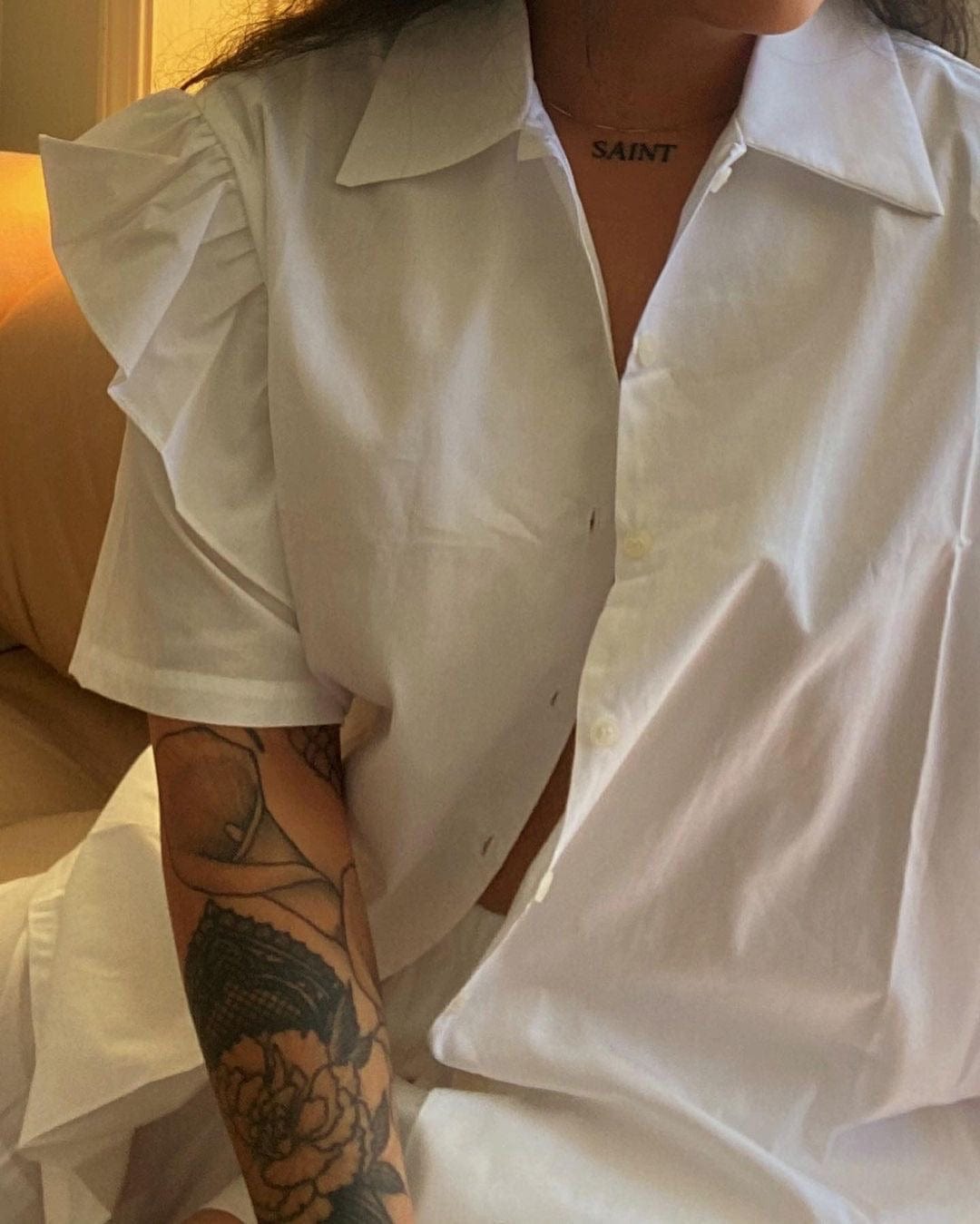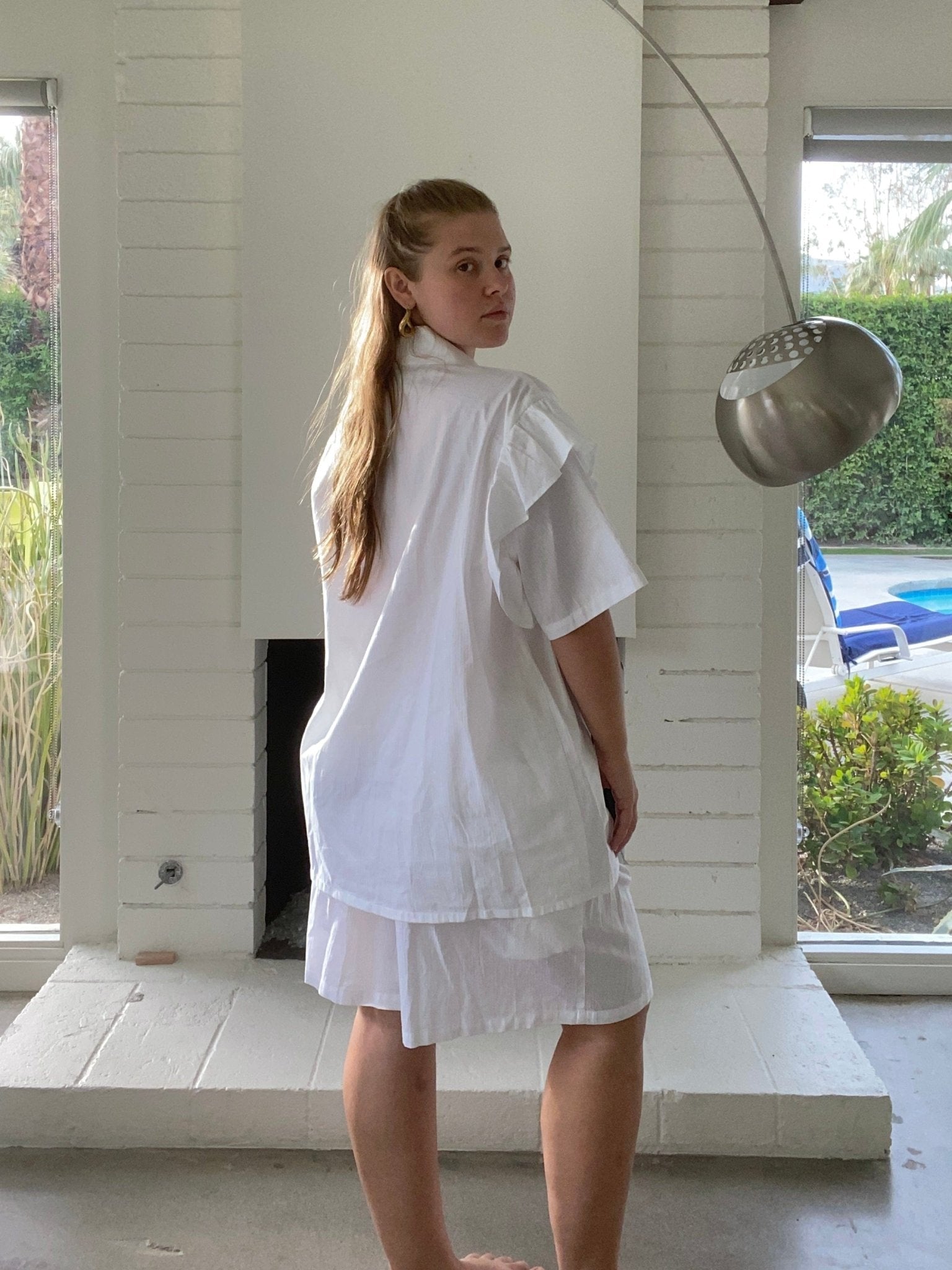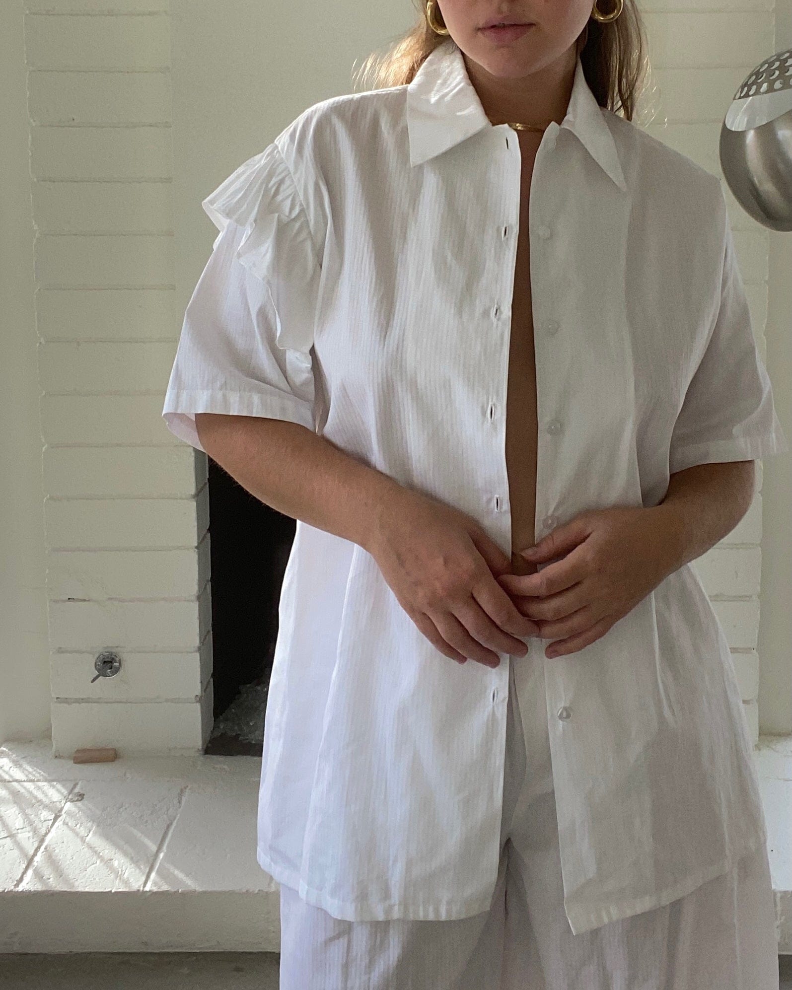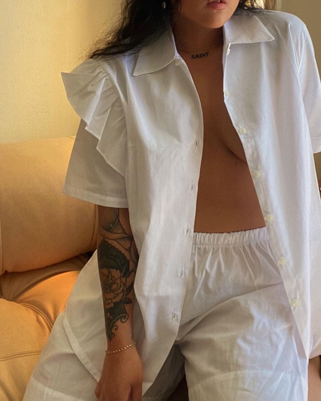 Oversized sleep shirt with ruffle shoulder detail and black buttons. Can be worn in or out of the house, dressed up or straight up PJ's. Made of 100% Cotton.