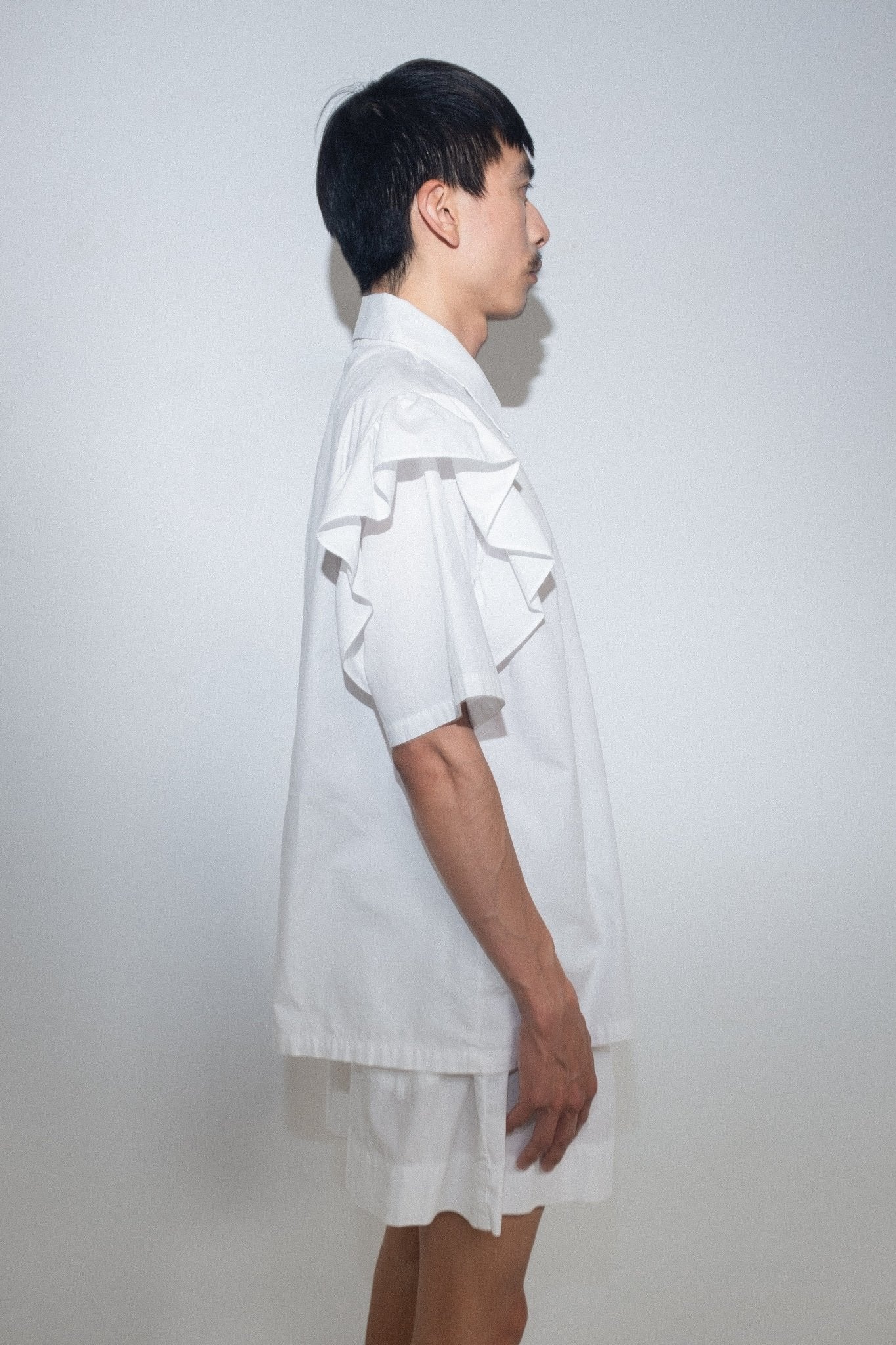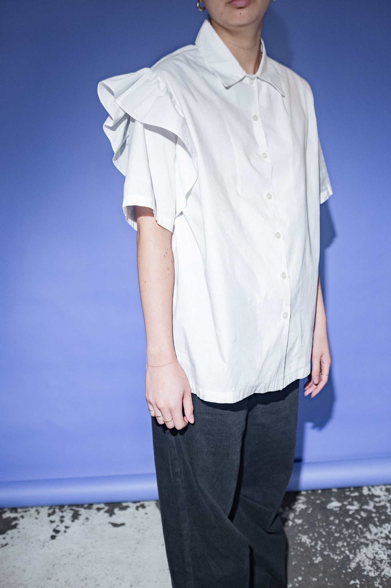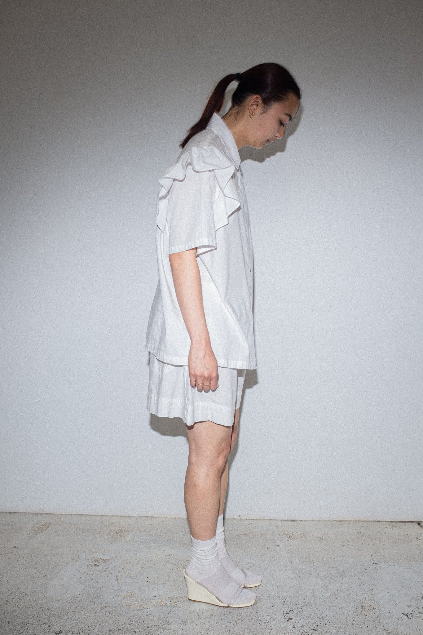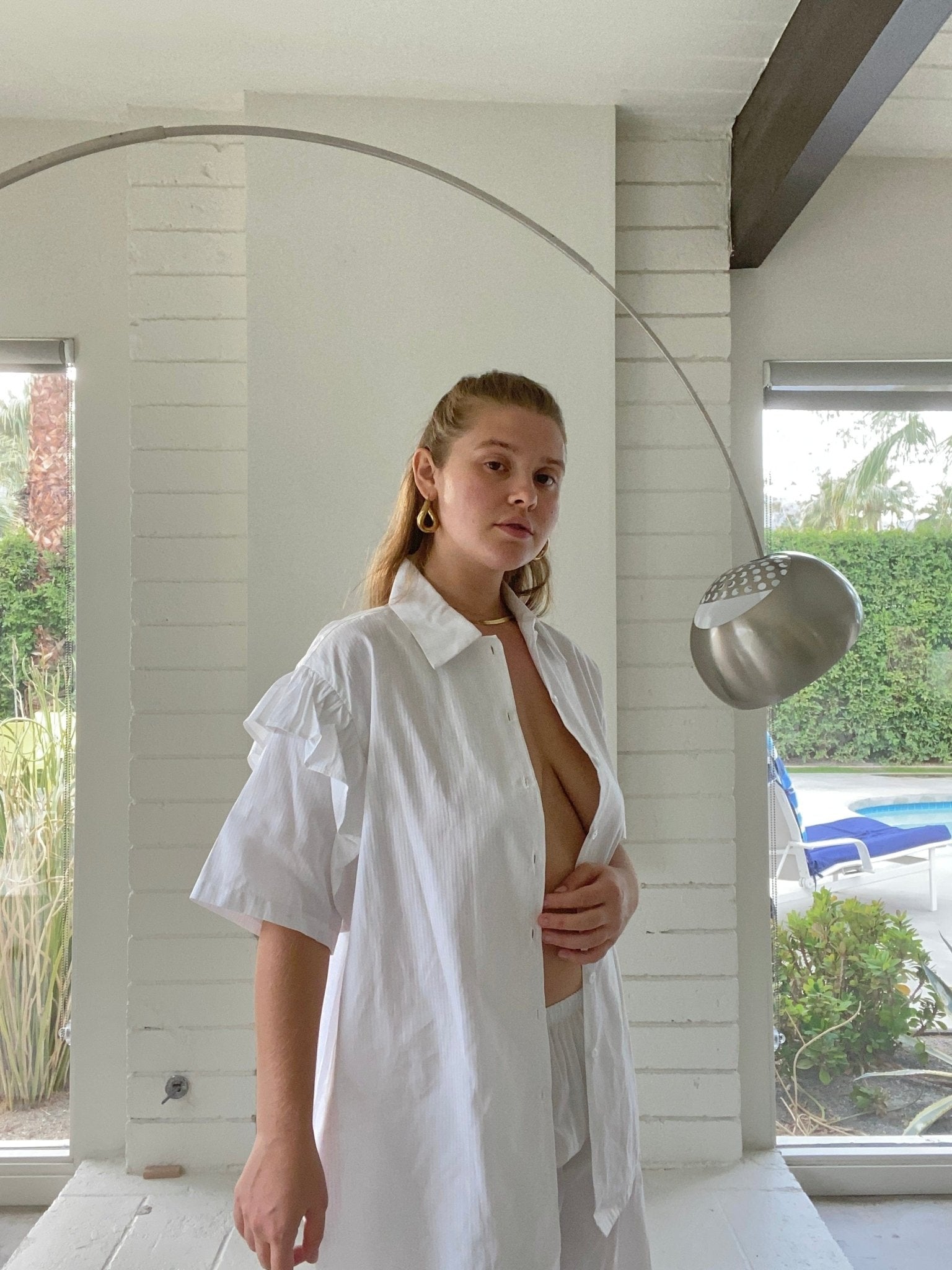 Oversized sleep shirt with ruffle shoulder detail and black buttons. Can be worn in or out of the house, dressed up or straight up PJ's. Made of 100% Cotton.