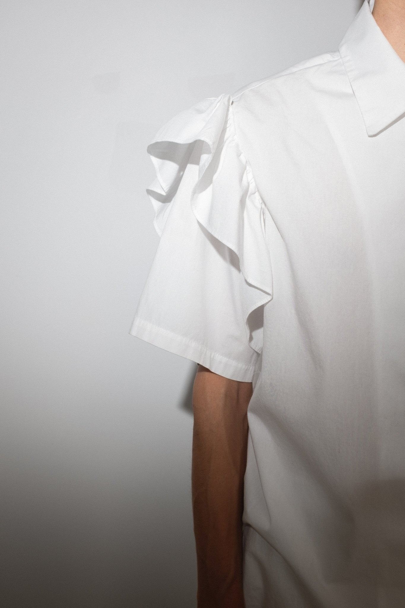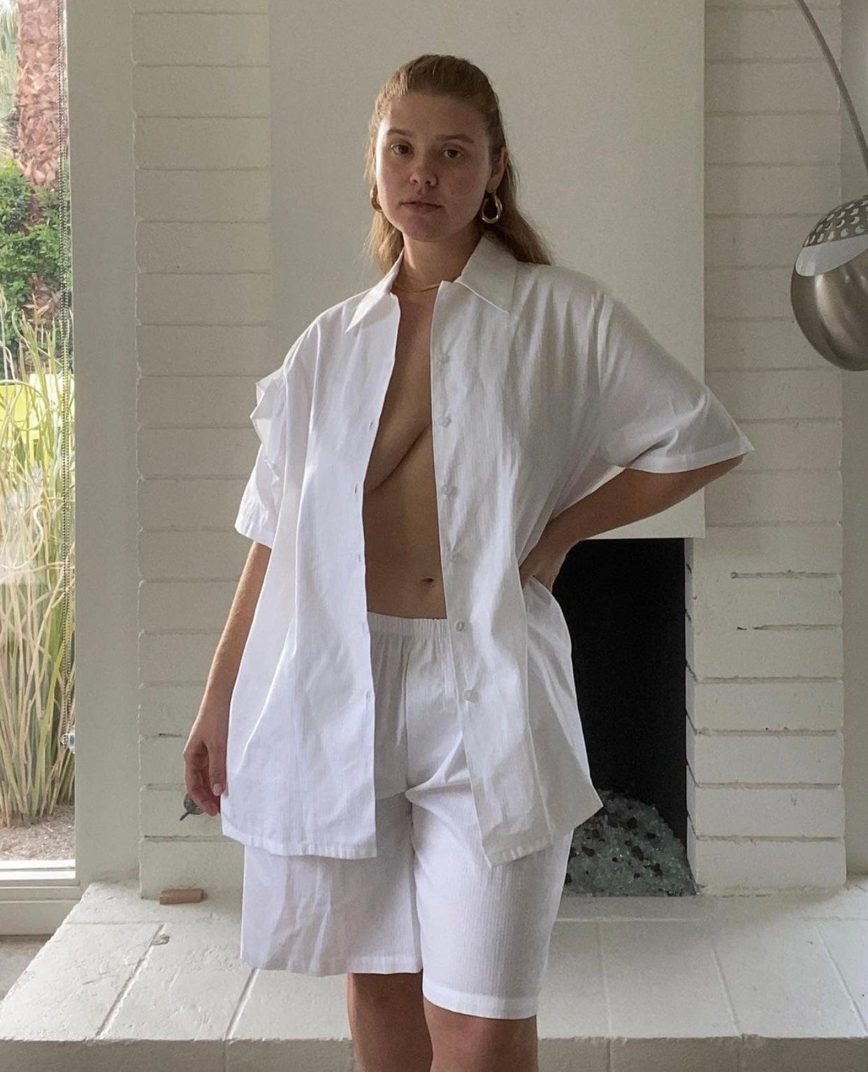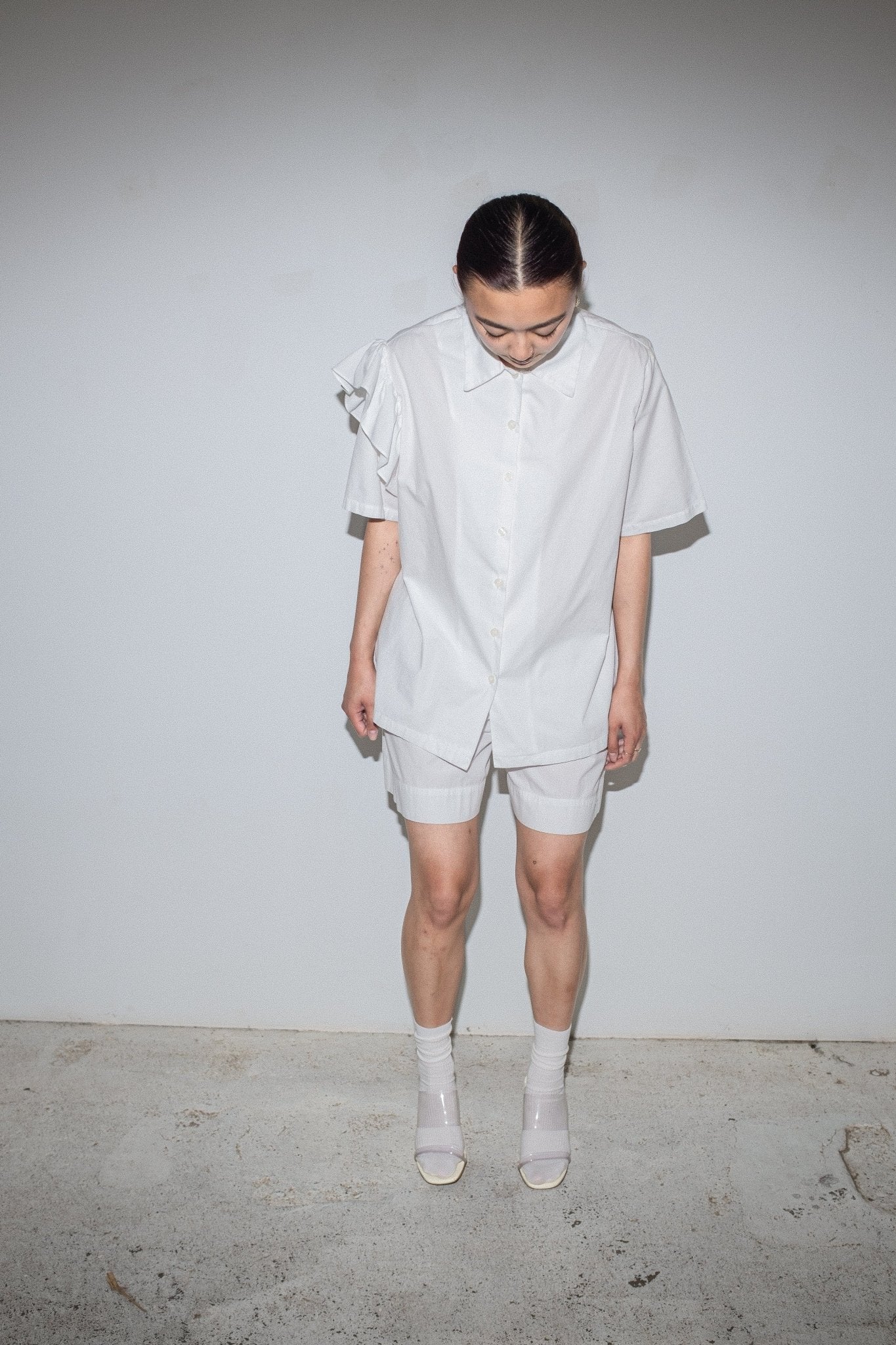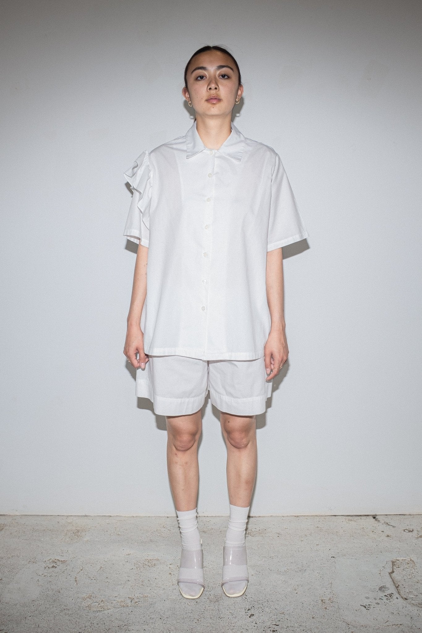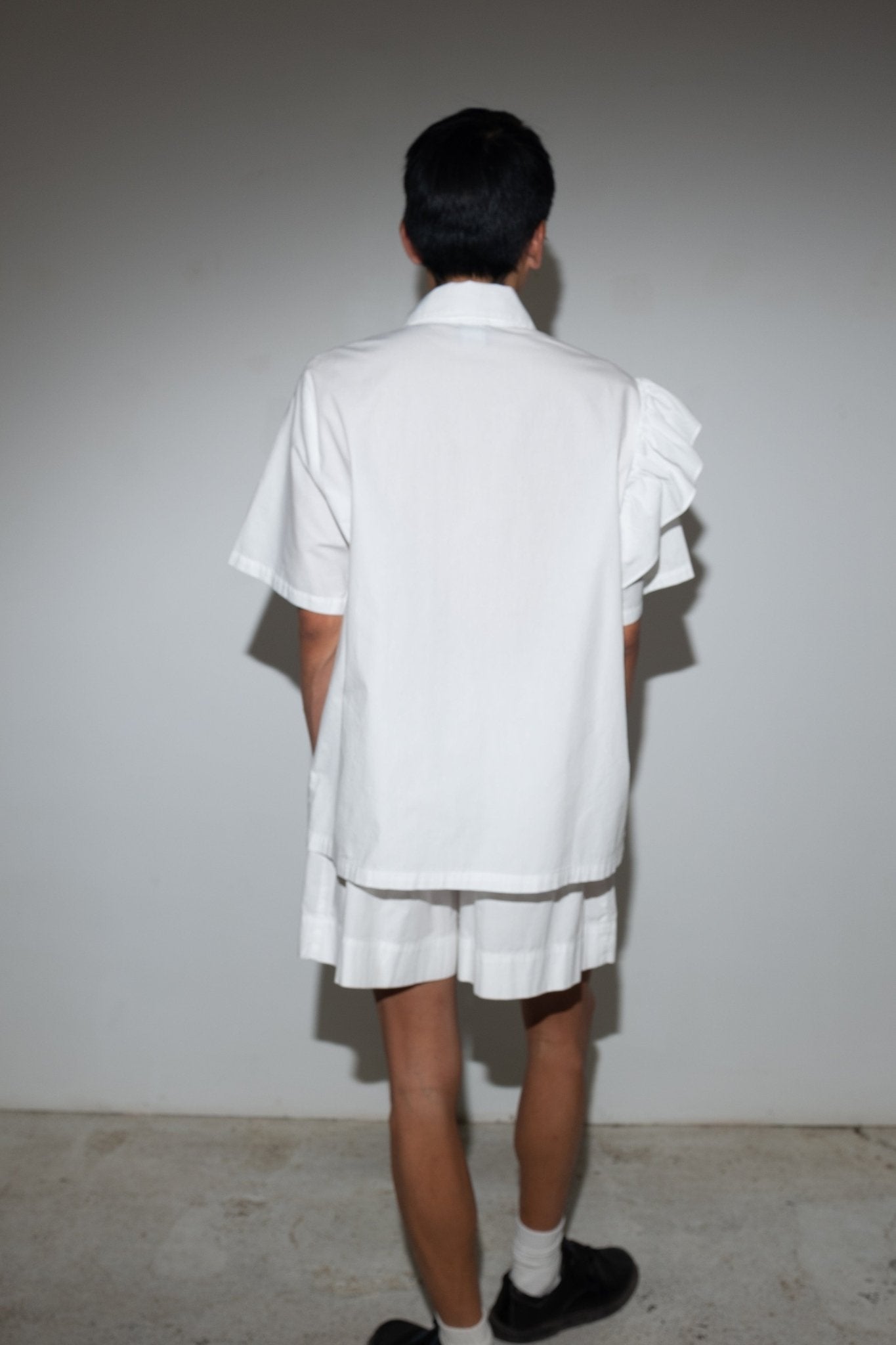 Oversized sleep shirt with ruffle shoulder detail and black buttons. Can be worn in or out of the house, dressed up or straight up PJ's. Made of 100% Cotton.