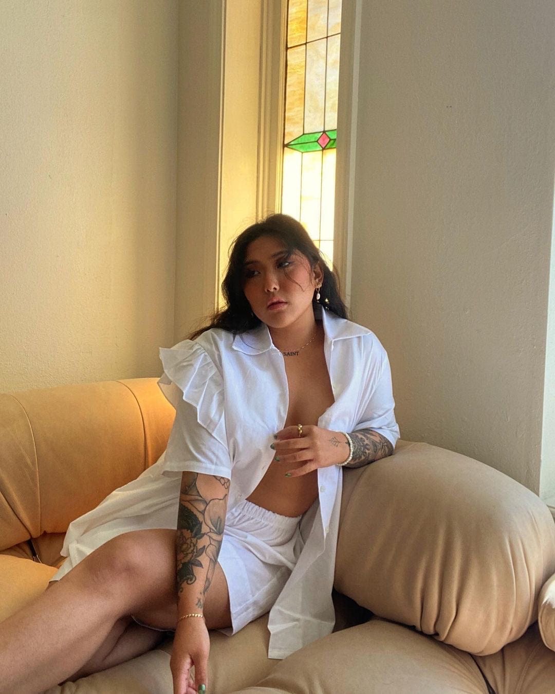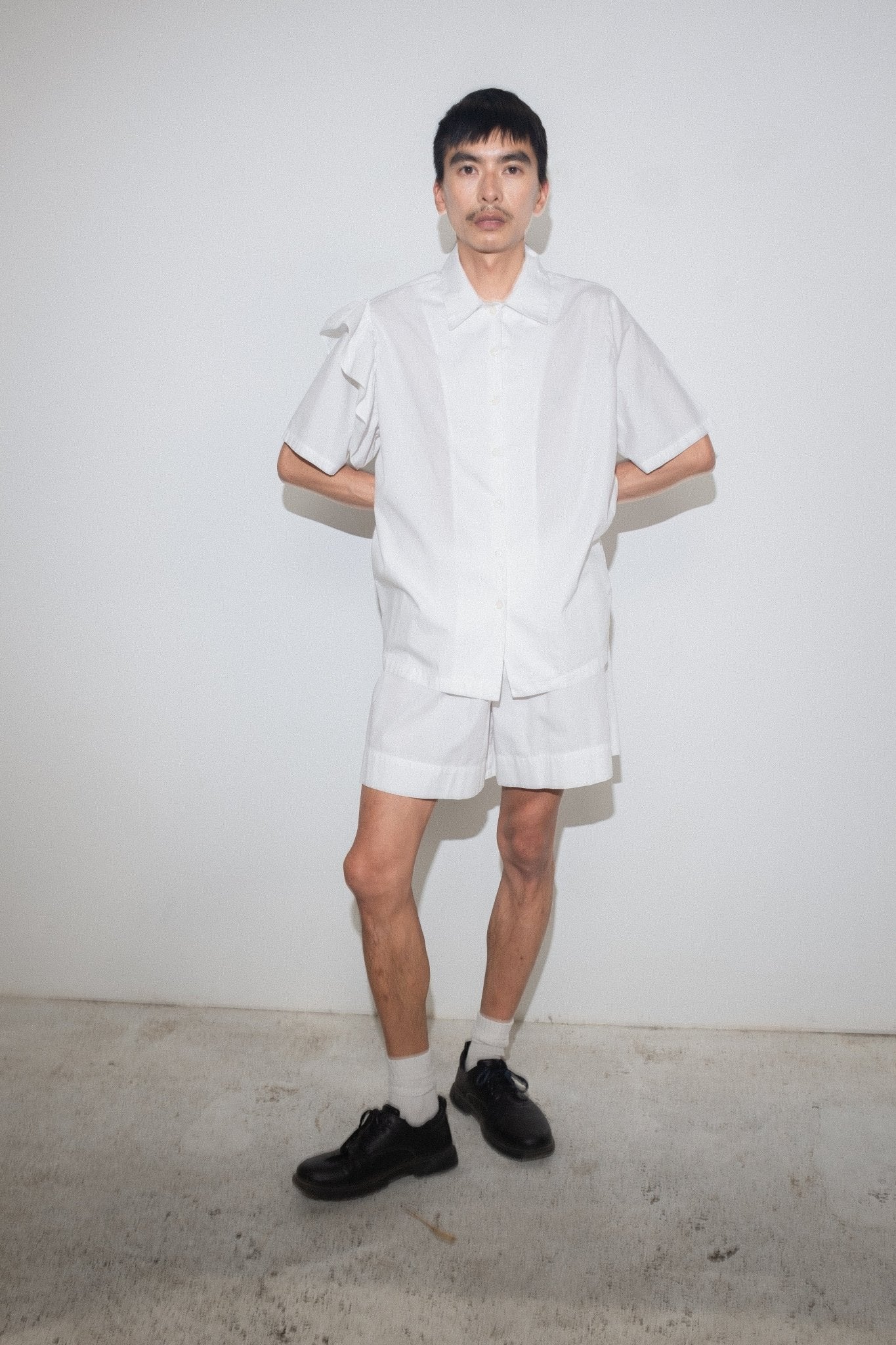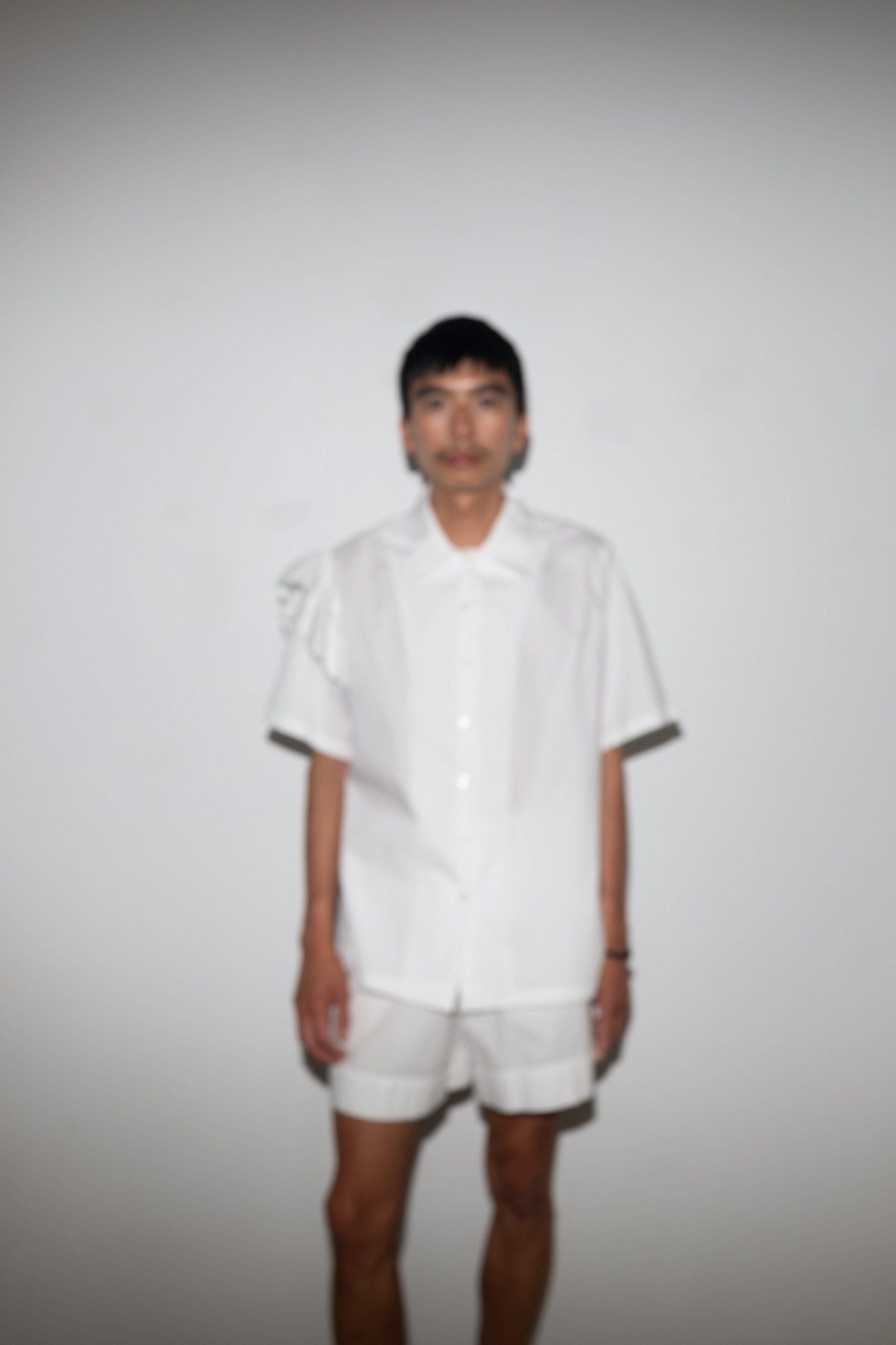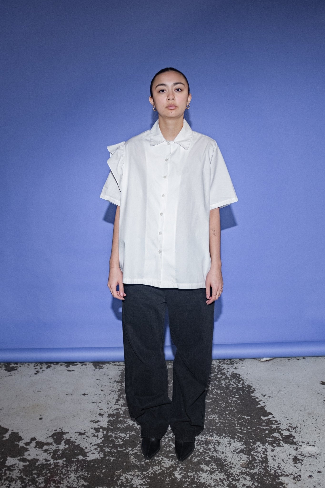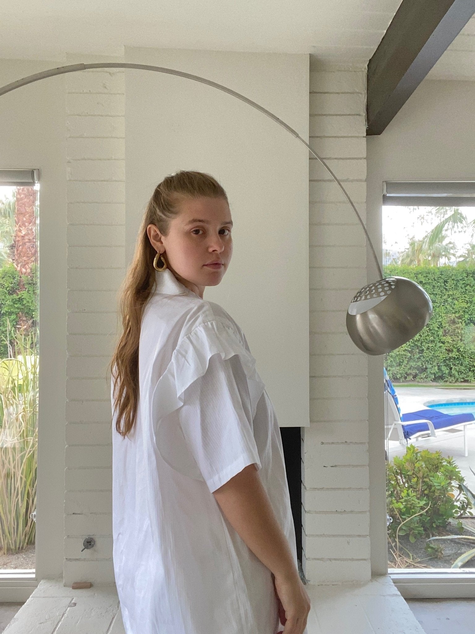 Oversized sleep shirt with ruffle shoulder detail and black buttons. Can be worn in or out of the house, dressed up or straight up PJ's. Made of 100% Cotton.