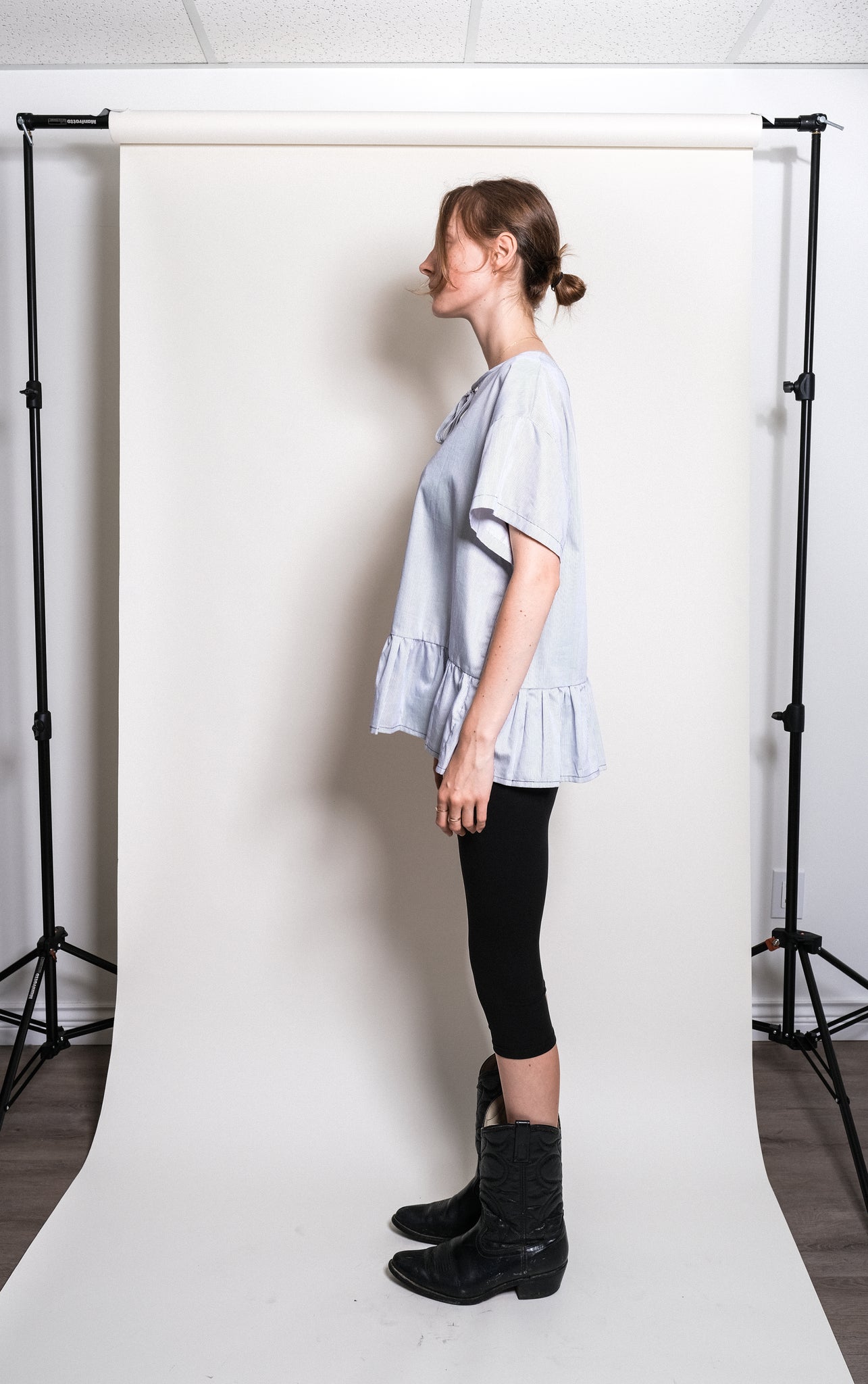 Oversized peplum blouse. Circle cut out with tie closure at back neckline. Made of 100% Cotton.