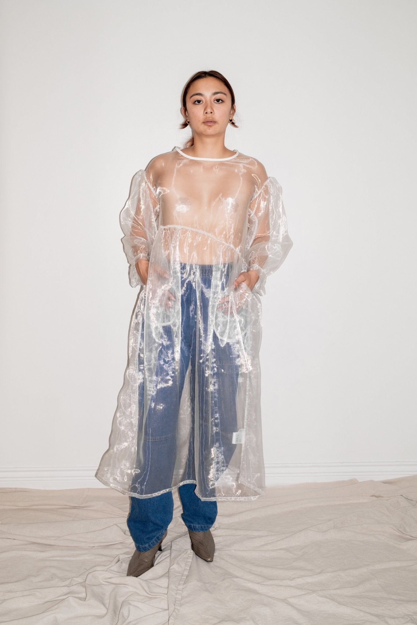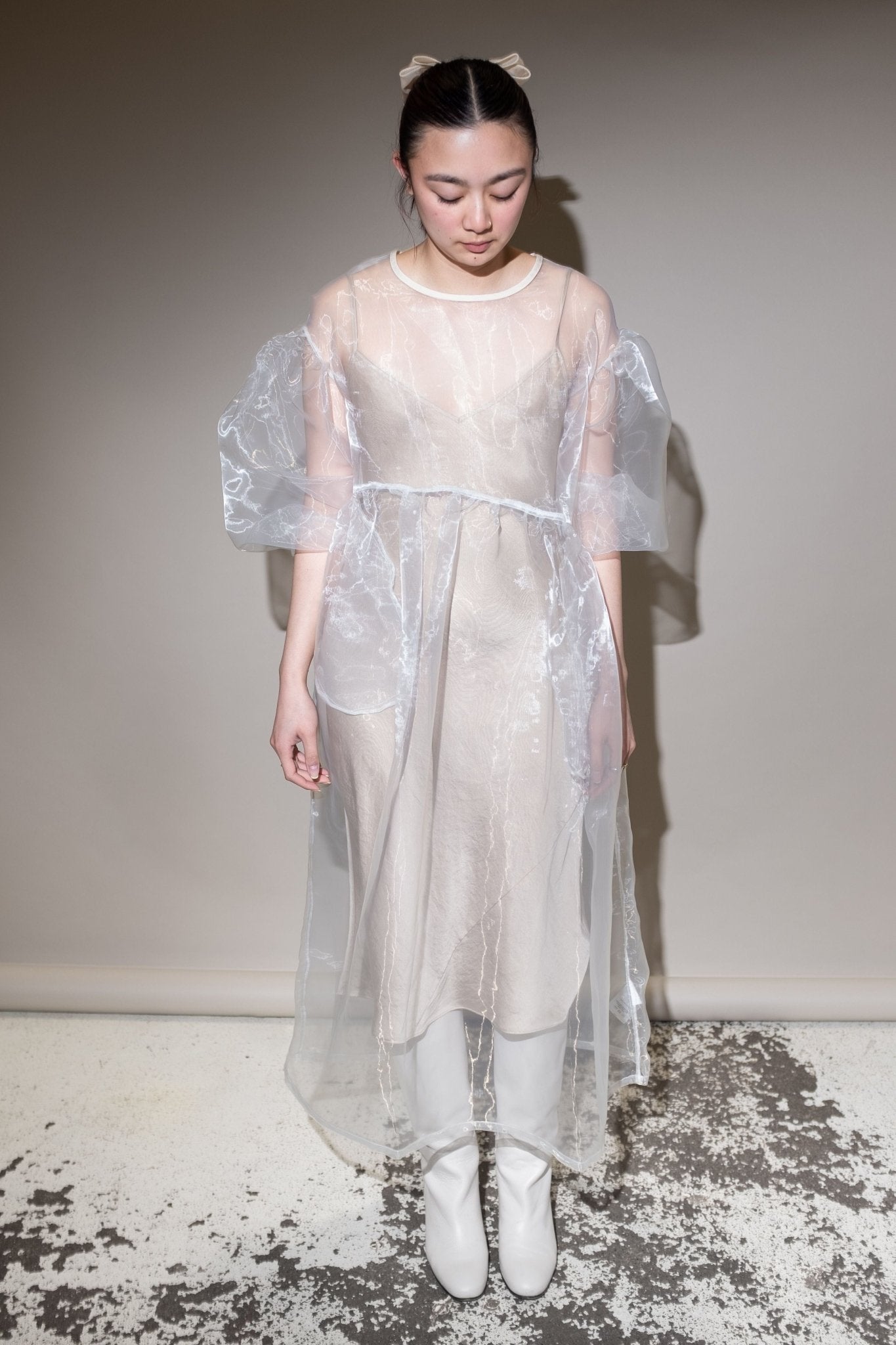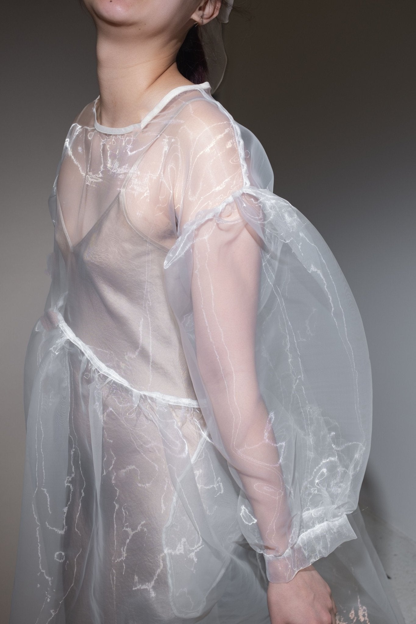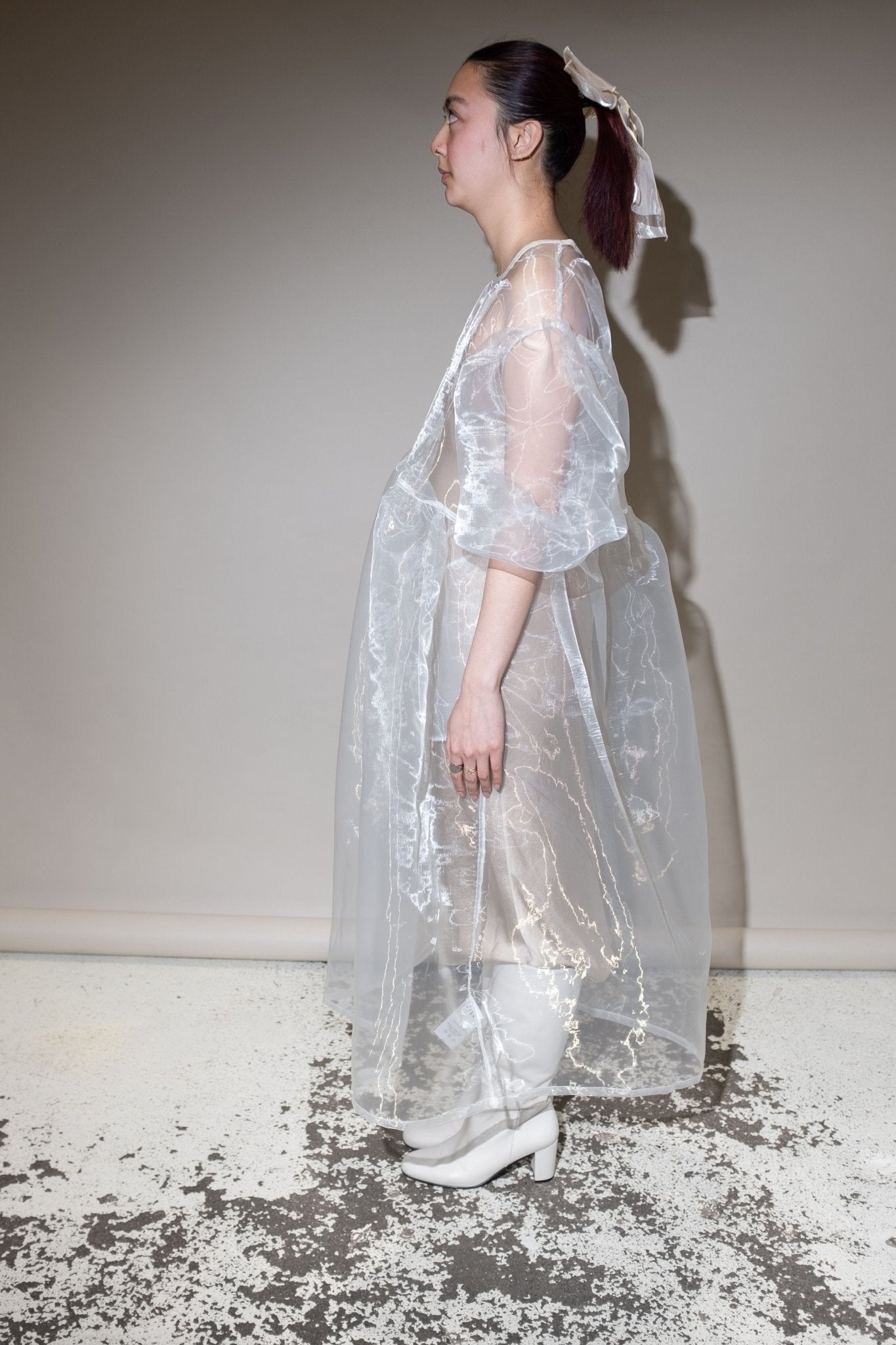 Perfectly-oversized dress. Curved waist. Billowing, easy-fit silhouette with sleeves that balloon. Unlined. Made here in 50% Poly / 50% Nylon Organza.