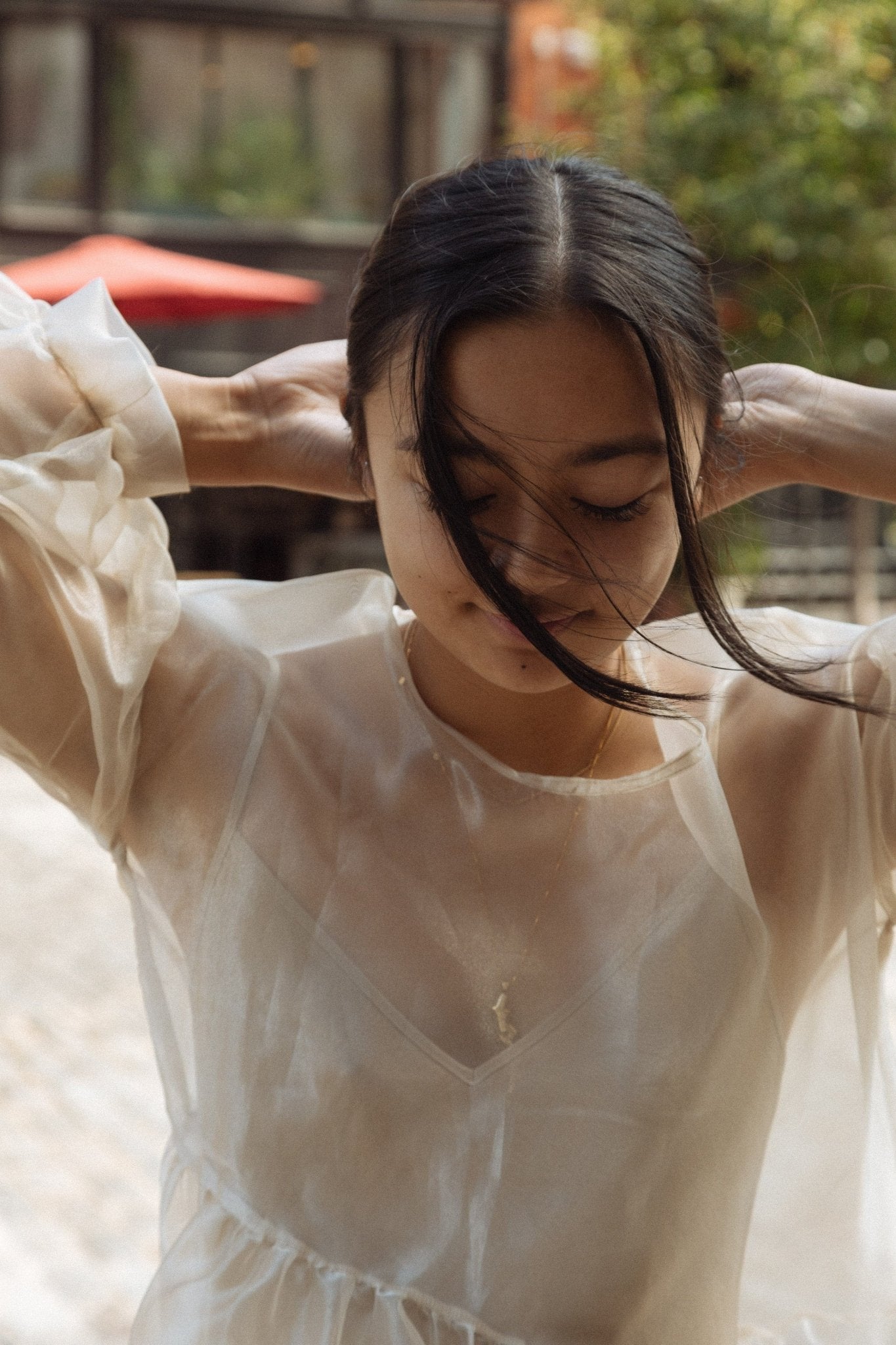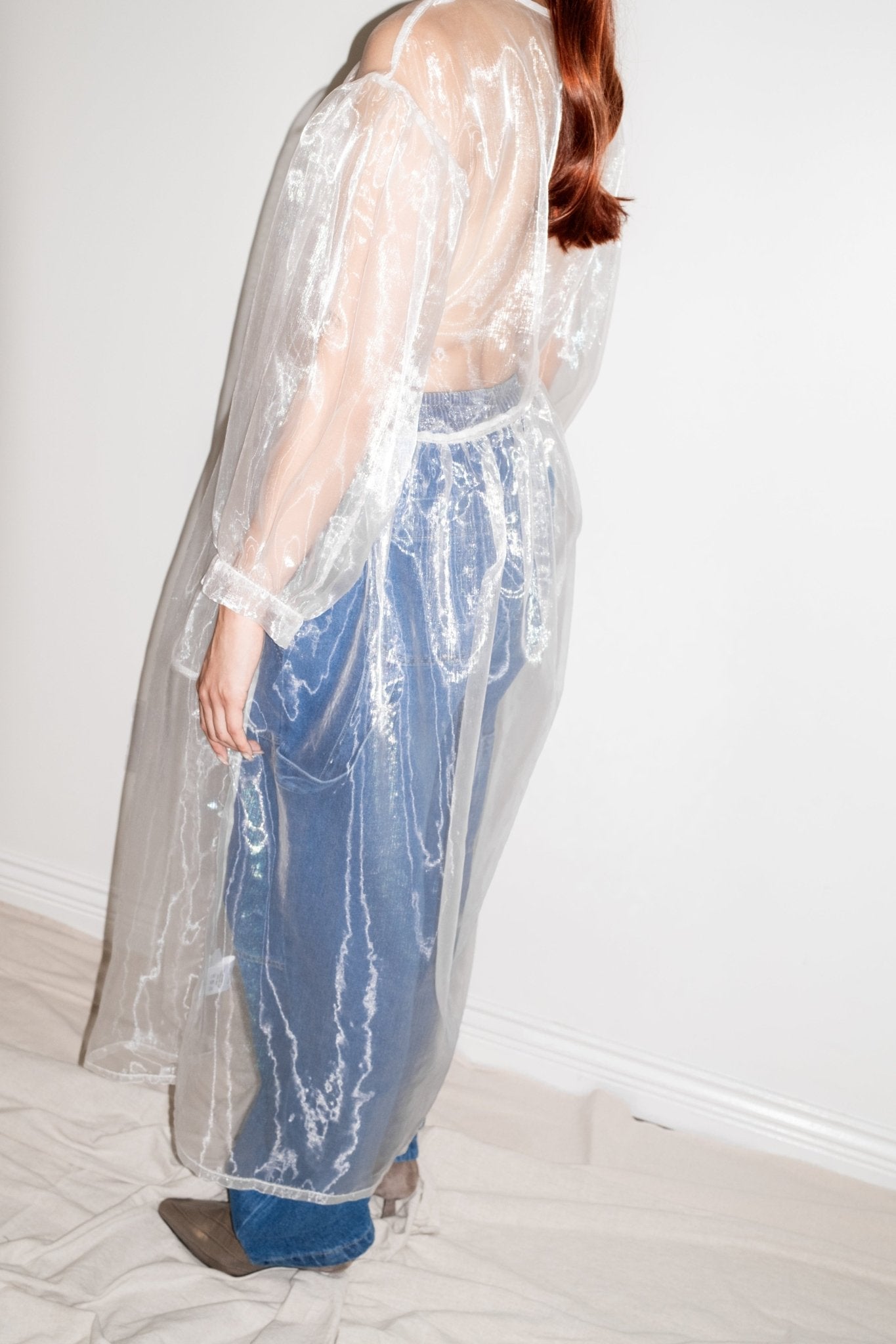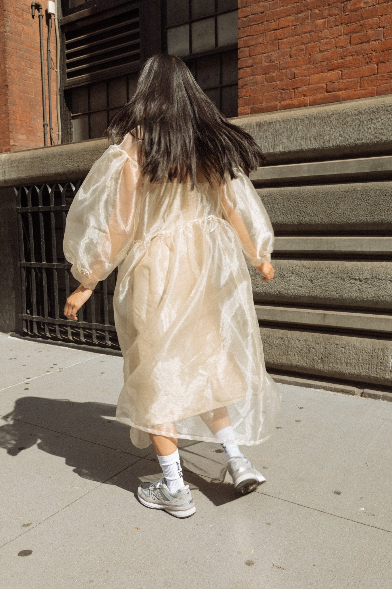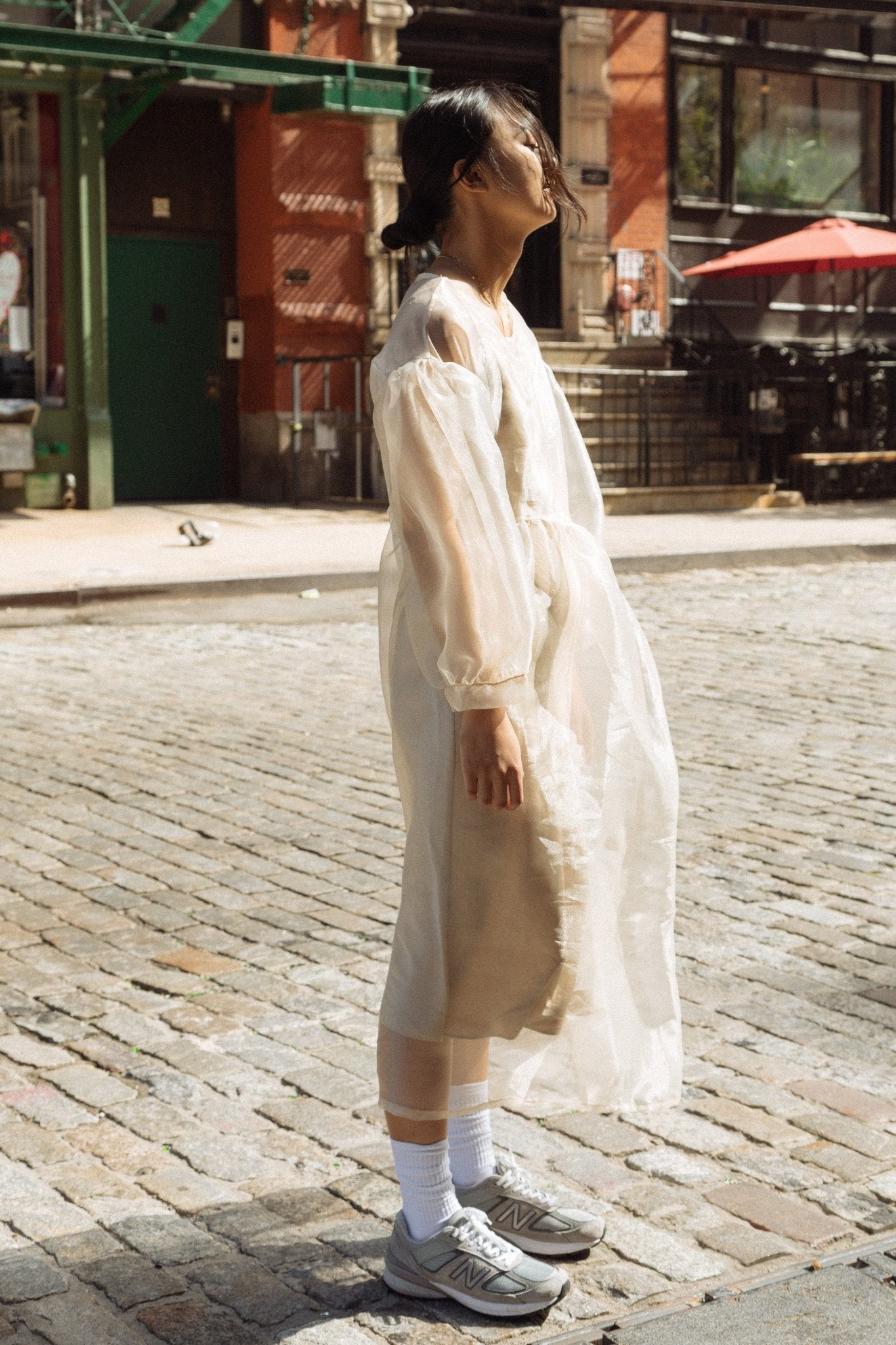 Perfectly-oversized dress. Curved waist. Billowing, easy-fit silhouette with sleeves that balloon. Unlined. Made here in 50% Poly / 50% Nylon Organza.