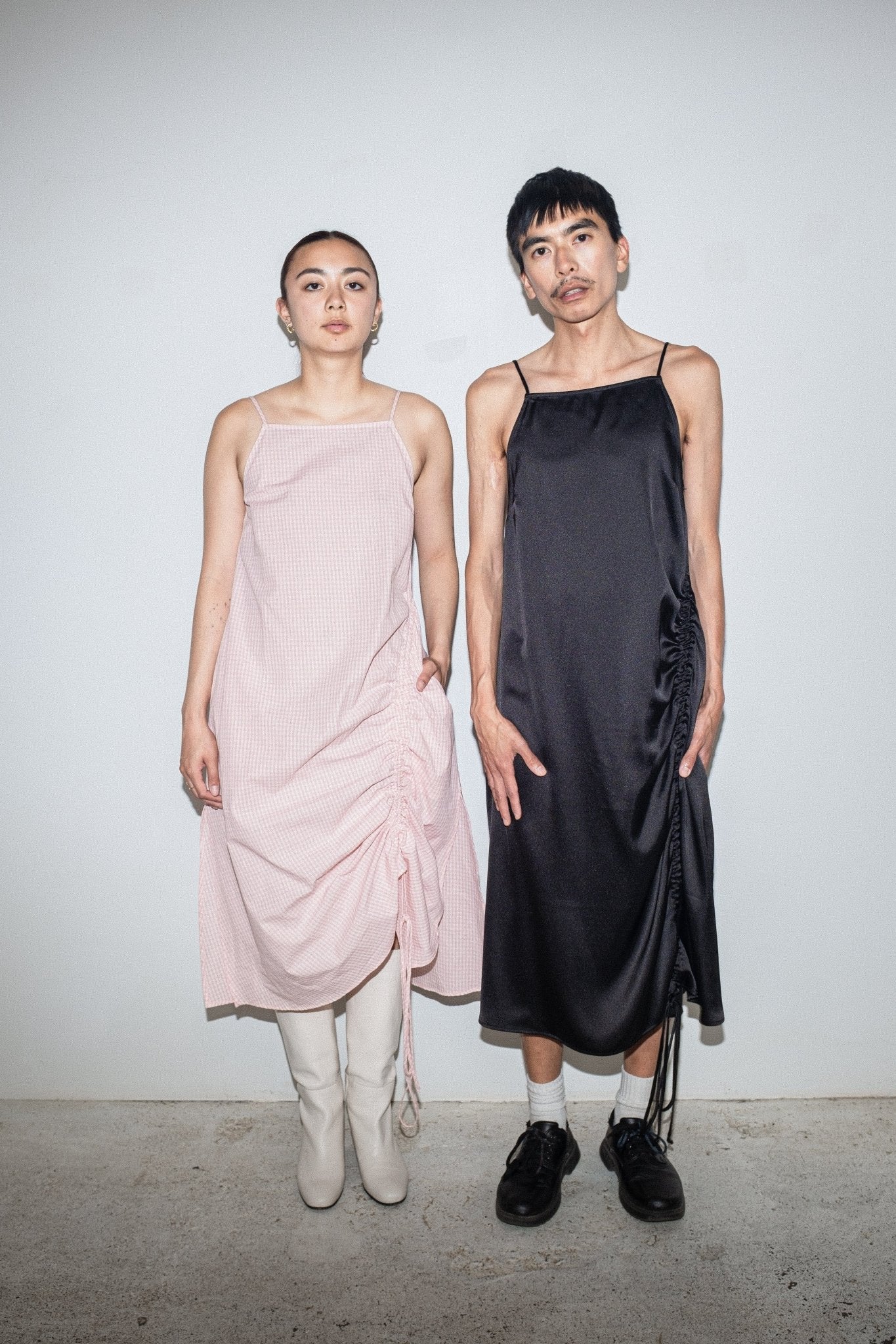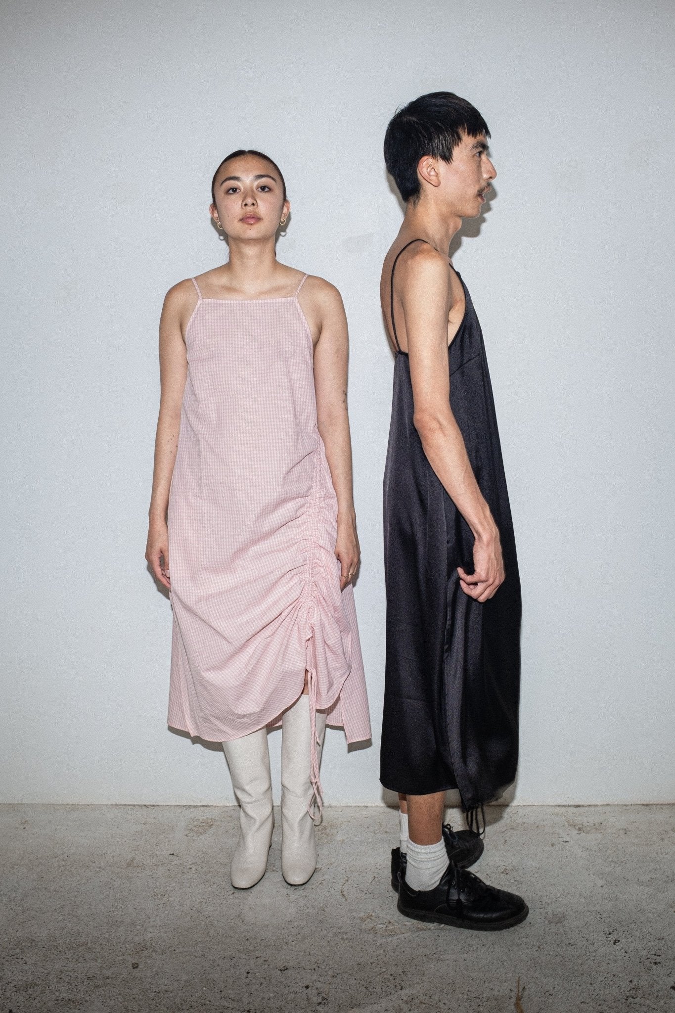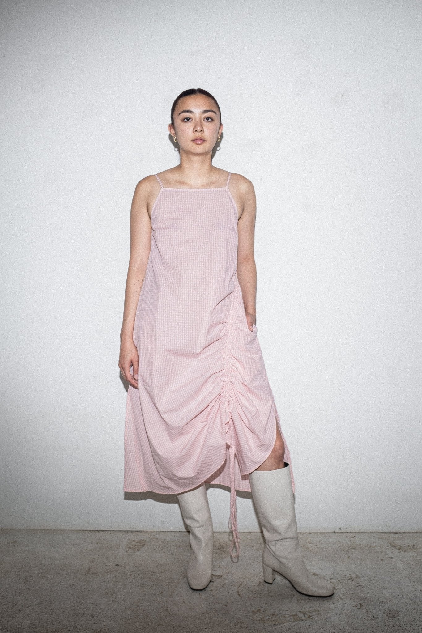 Slip dress with adjustable drawstring along the front. Side slit hits at mid thigh. Made of 100% Cotton.