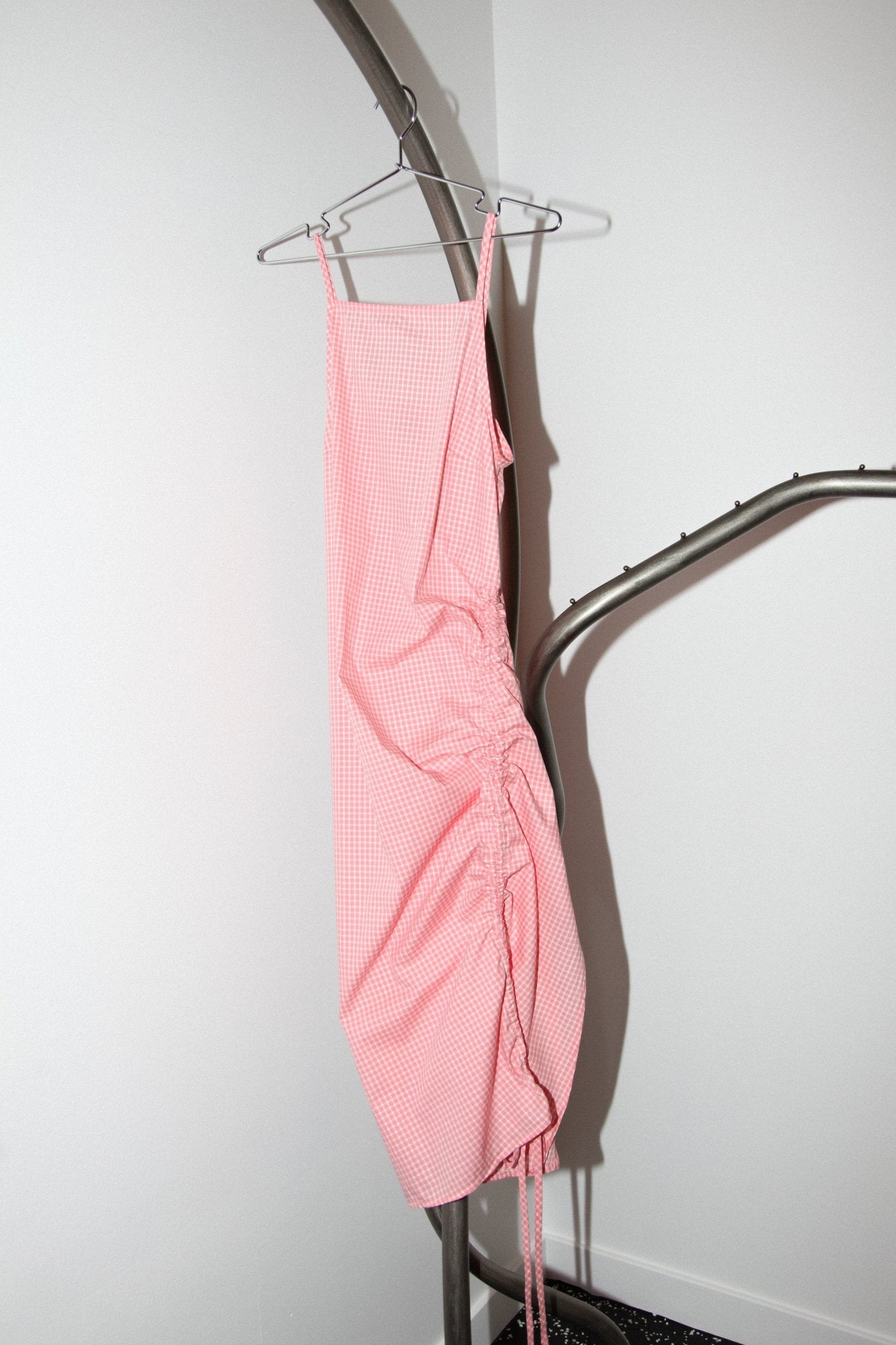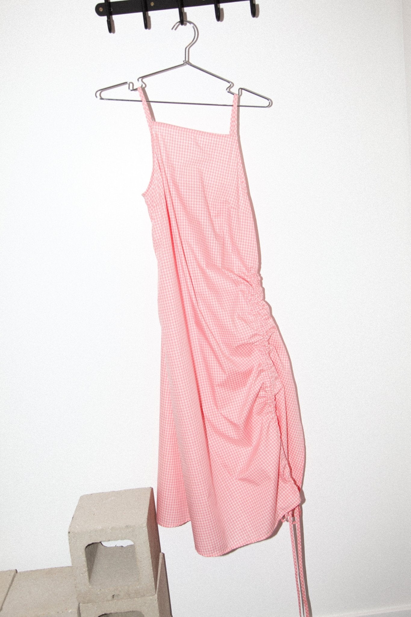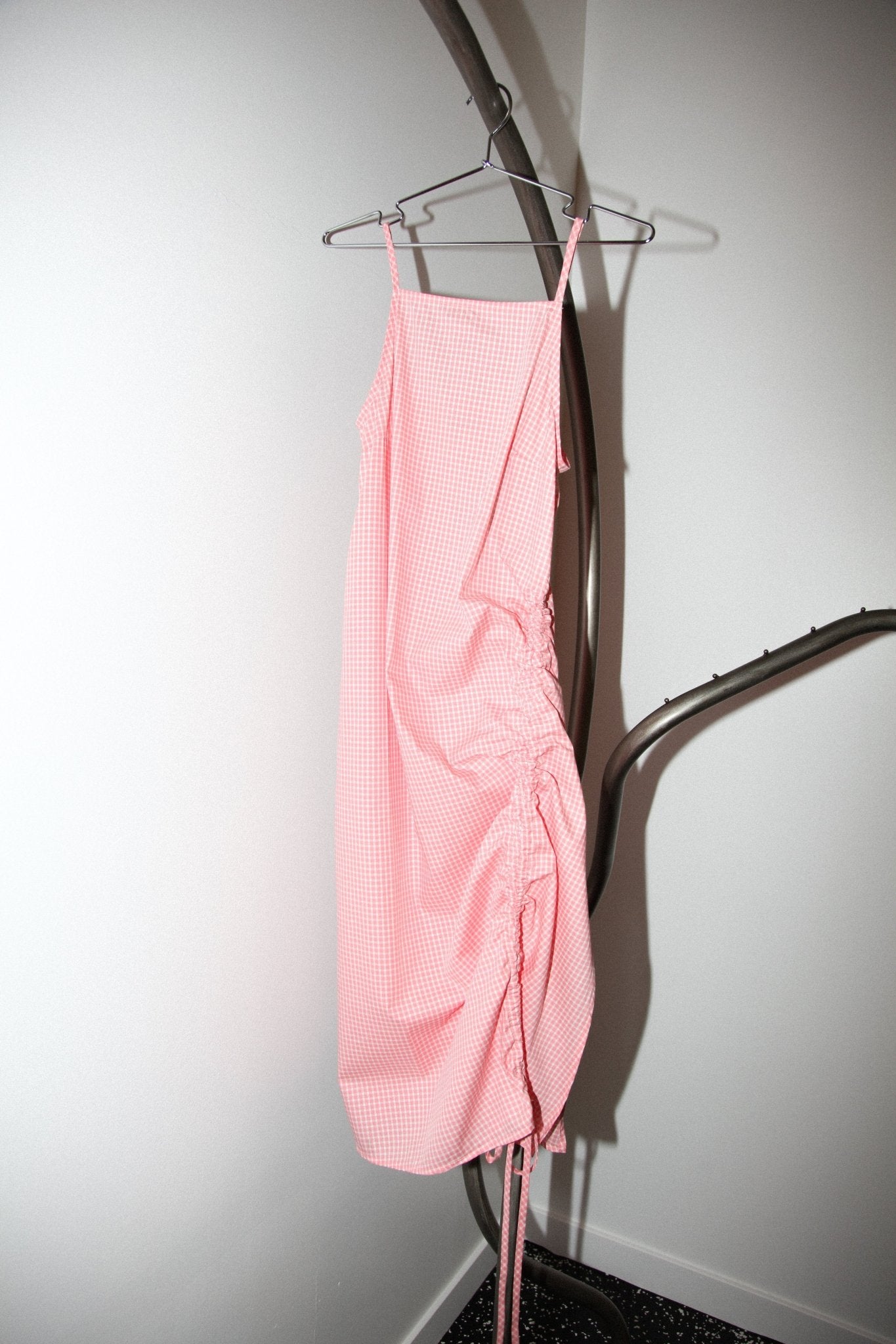 Slip dress with adjustable drawstring along the front. Side slit hits at mid thigh. Made of 100% Cotton.